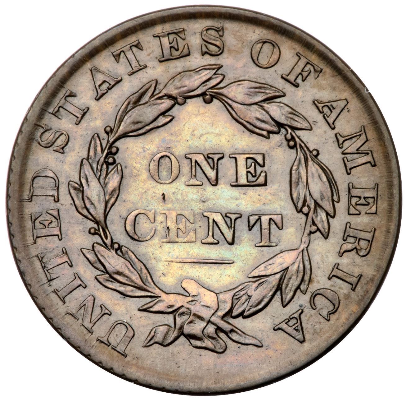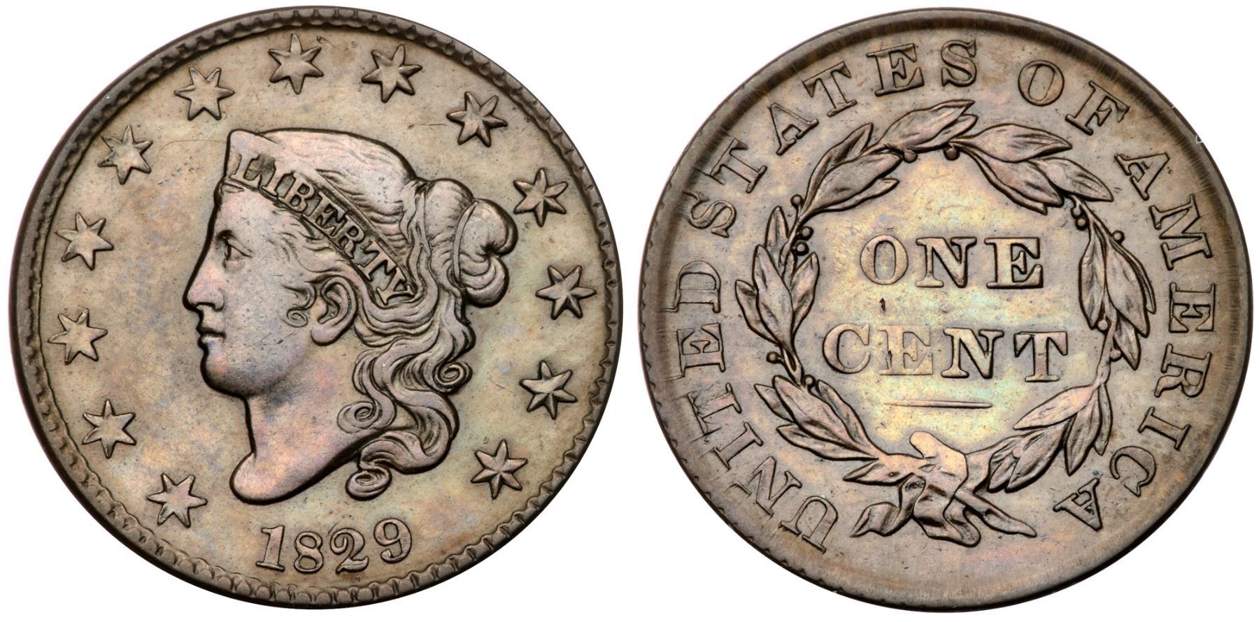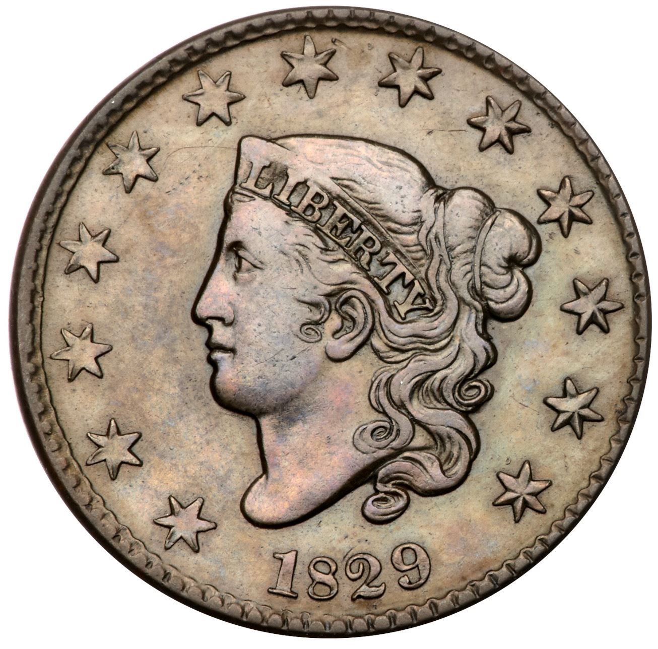 1829 N-5 R3 Medium Letters VF25Slightly sharper but there are microscopic hairlines on both sides, mostly inside the wreath, and they lighten the toning in that area. Glossy light olive and medium brown. A tiny vertical tick over the left side of the E in CENT is the only notable mark. M-LDS, die state d, with crumbling in the dentils at star 11. The fields on the obverse are hard and slightly reflective from a fresh die polishing. The strike along the top of the portrait and the opposing leaves at the bottom of the wreath are weakly struck, as usual.Certificate Number: Pedigree: From the Fred H. Borcherdt Collection