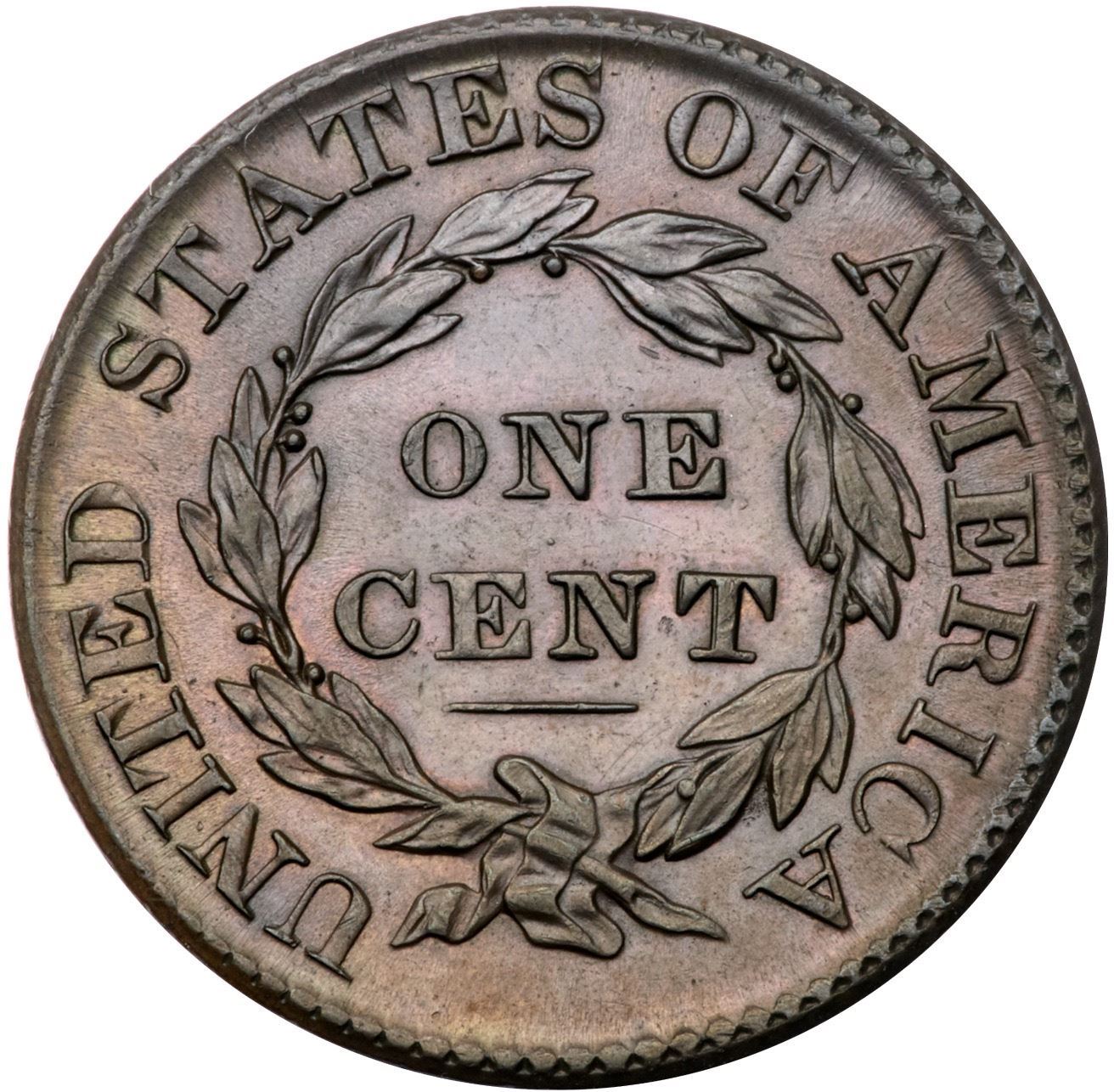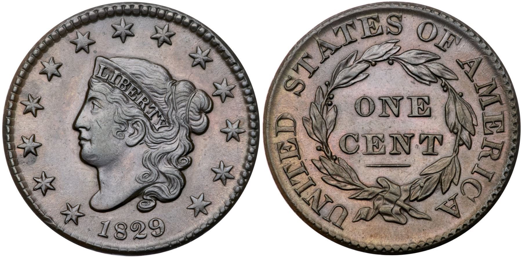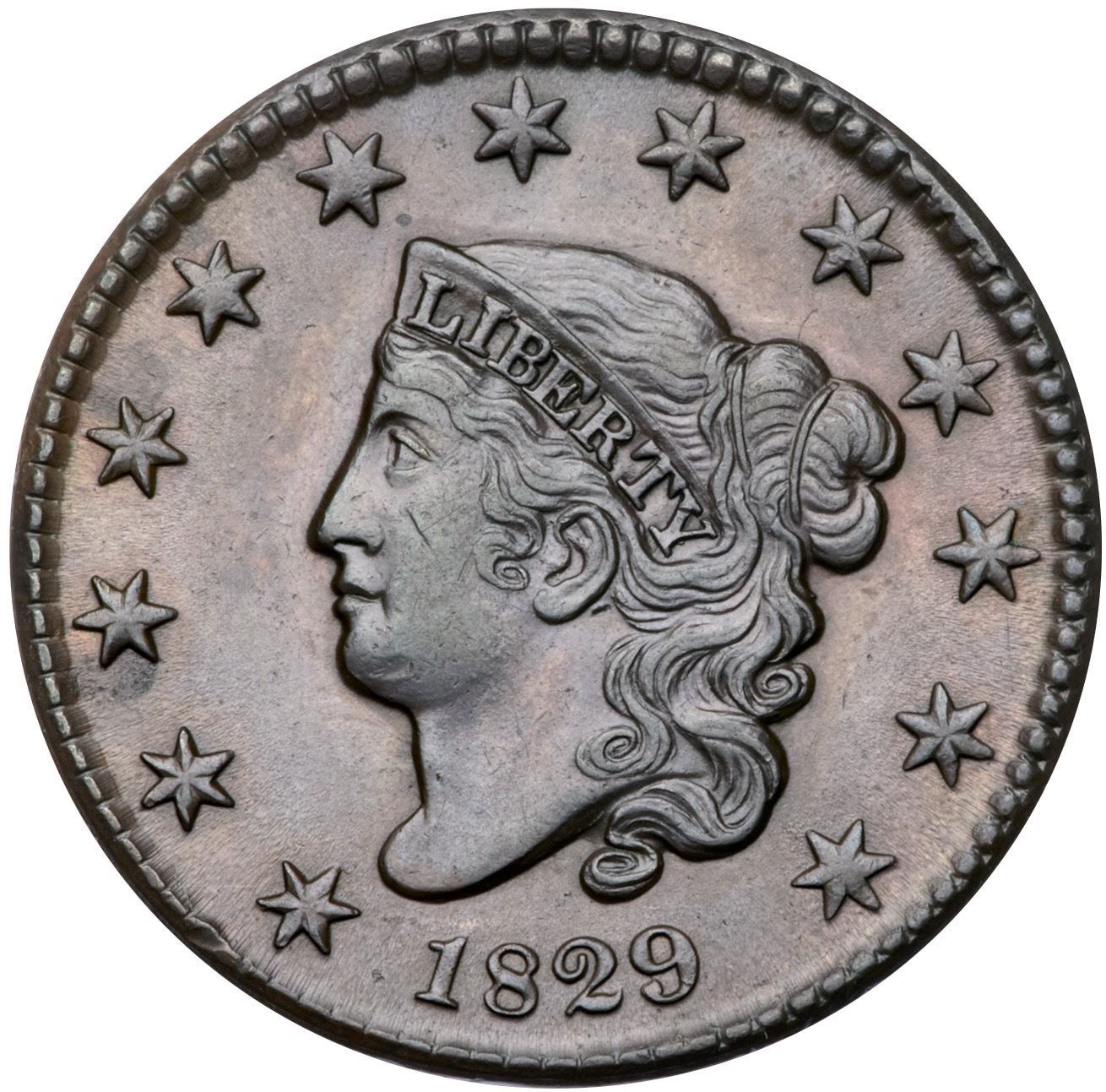 1829 N-8 R1 Large Letters AU50Lustrous steel brown with hints of very faded mint color showing in a couple of the protected areas. A very attractive cent with light friction on the highpoints and satiny luster in the fields. The only mark is a diagonal nick right of the nostril. MDS, die state b, with a narrow but clearly defined rim cud from star 9 nearly to star 10Certificate Number: Pedigree: Ex ECG 8/1984-Fred H. Borcherdt Collection