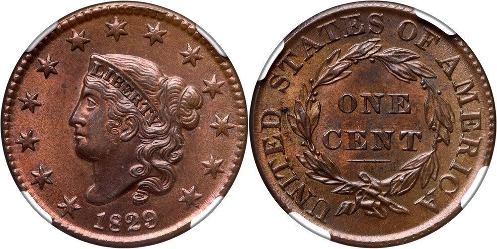 Lustrous light chocolate and steel brown with lots of mellowed red in the fields and protected areas, particularly on the obverse. May have been dipped long ago but the luster and eye appeal of this cent are quite nice. The only notable marks are two tiny ticks on the jawline close to the ear lobe and a spot of darker toning at the leaf tip just right of the D in UNITED. LDS with a narrow but clearly defined rim cud break at stars 7-8. Our grade is MS60. The attribution and COL Ellsworth Collection provenance are noted on the NGC label.