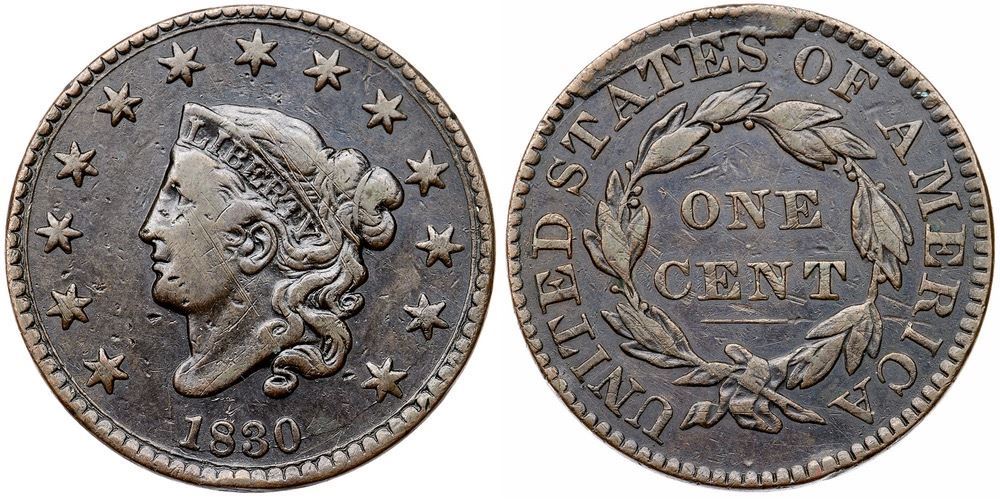 Sharpness VF25 or slightly better but there are some contact marks on otherwise smooth surfaces. The notable marks are some diagonal scratches on both sides, small nicks in the field between the chin and star 1, and a rim dent under the end of the wreath stem. Glossy light to medium chocolate with lighter brown on the highpoints. M-LDS, Grellman state c, with a raised retained cud over ATES. The cud is clearly raised at both ends but not in the middle. A neat die state.