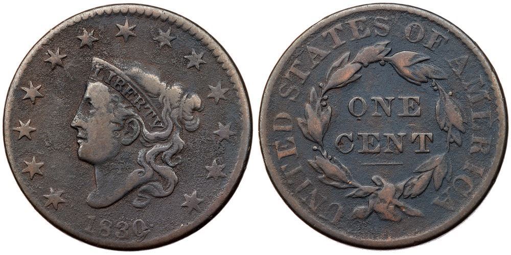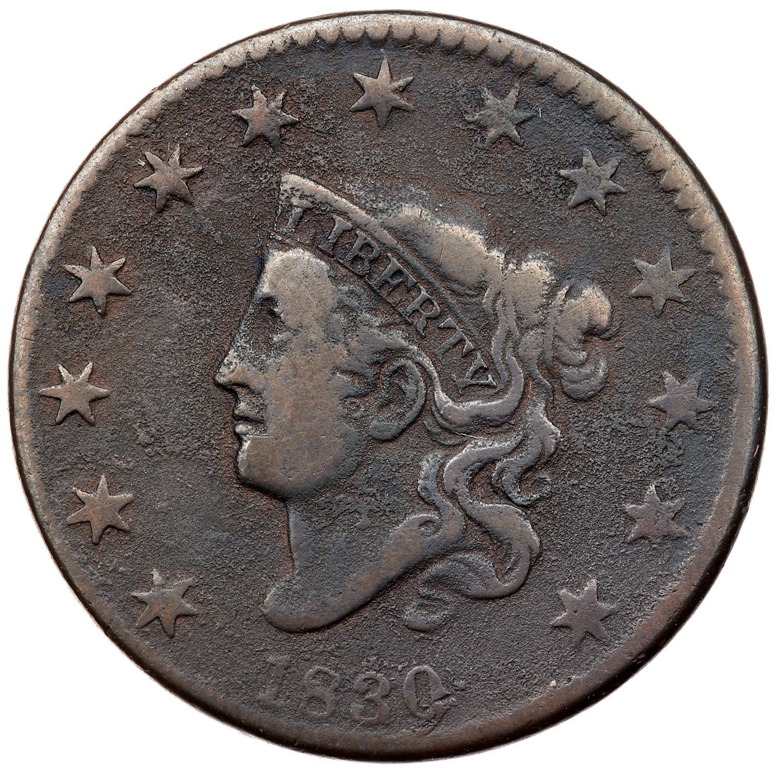 Sharpness F15 but covered with fine to moderate granularity. No marks or verdigris. Dark olive and steel brown with lighter steel brown on the highpoints. Usual die state with a worn-out and cracked reverse die.Certificate: Pedigree: Ex Robert E. Vail, Superior 9/7/1997:498-Chris McCawley 9/16/2002 (lot ticket included)