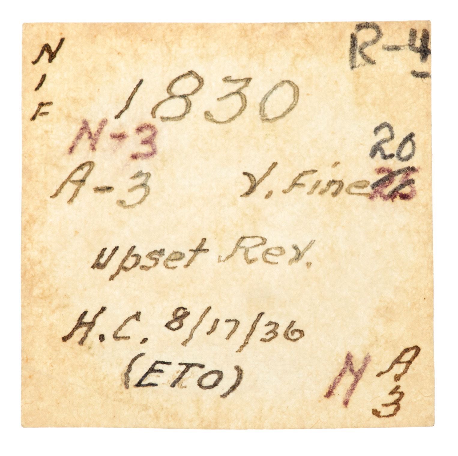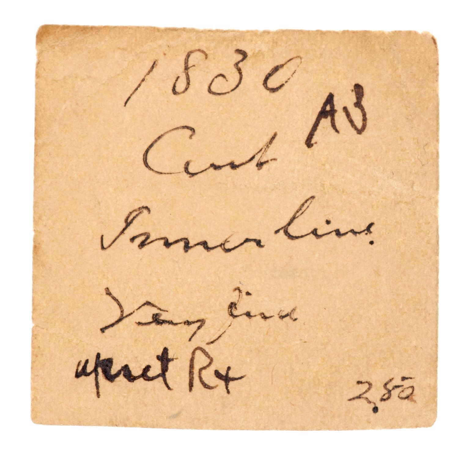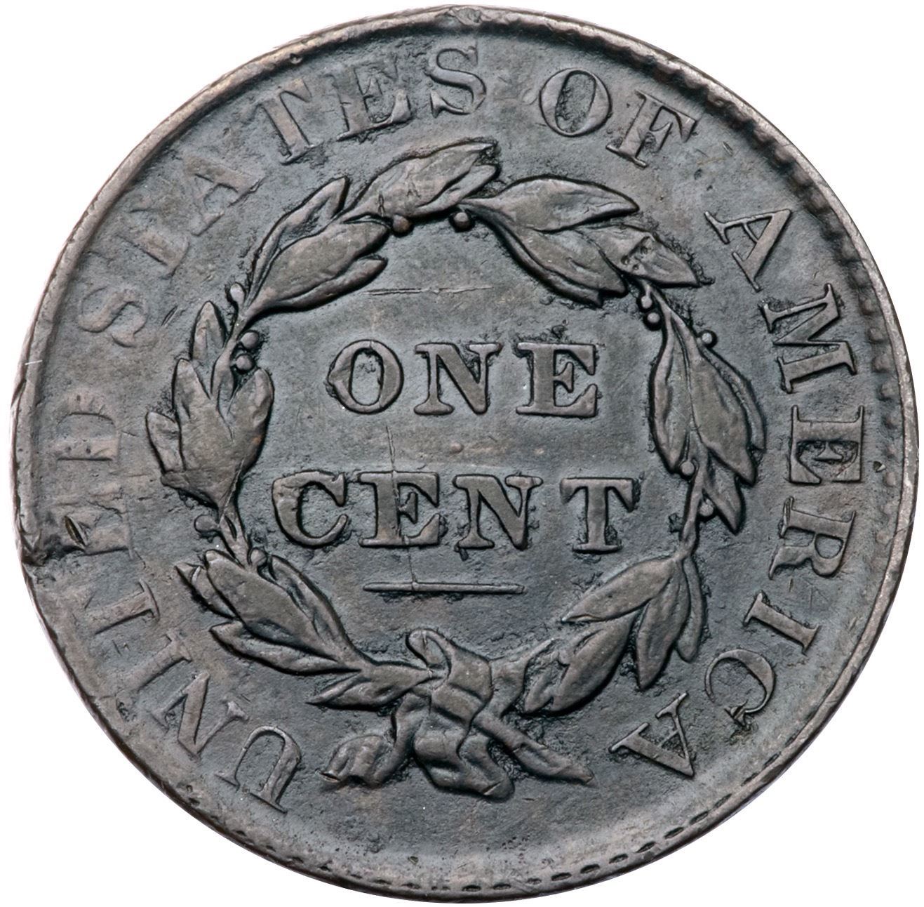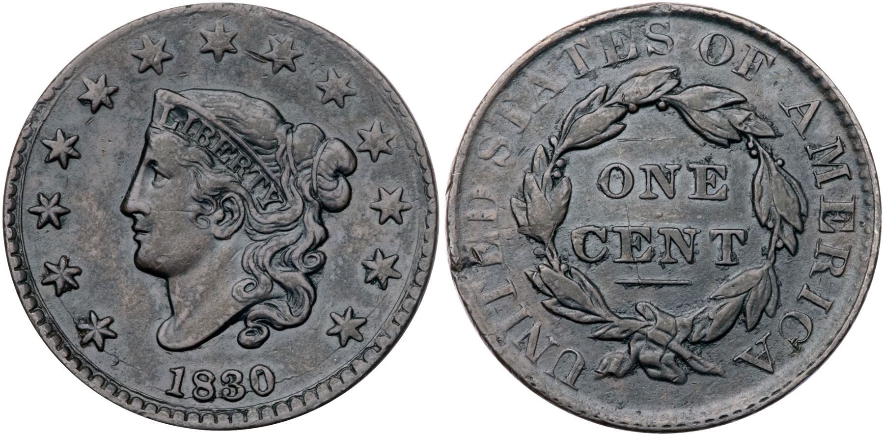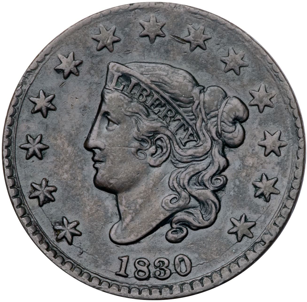1830 N-3 R3 F15Considerably sharper but covered with very fine roughness and specks of verdigris under glossy dark olive brown toning. The highpoints are a lighter shade of chocolate brown. The notable marks are a dull nick on the rim at star 4, a larger one at the E in UNITED, and a small one at the second S in STATES. MDS with the reverse rotated 140 degrees CCW.Certificate Number: Pedigree: Ex Henry Chapman 8/17/1936-Fred H. Clymer-Fred H. Borcherdt Collection (includes the Clymer collection note)