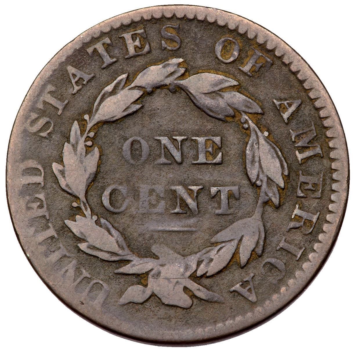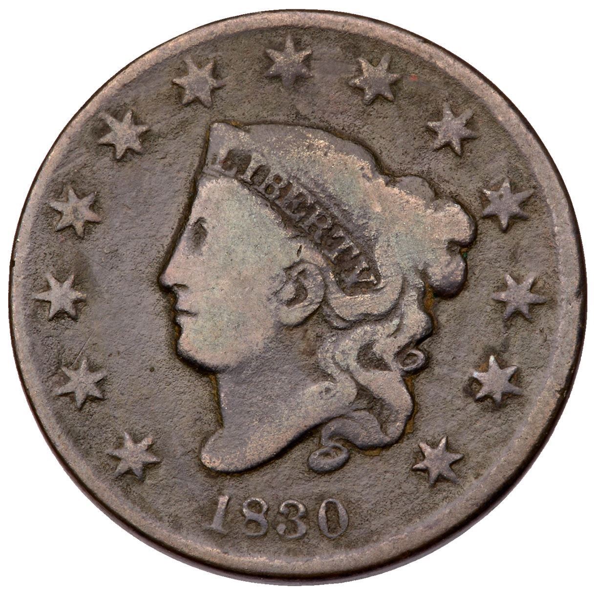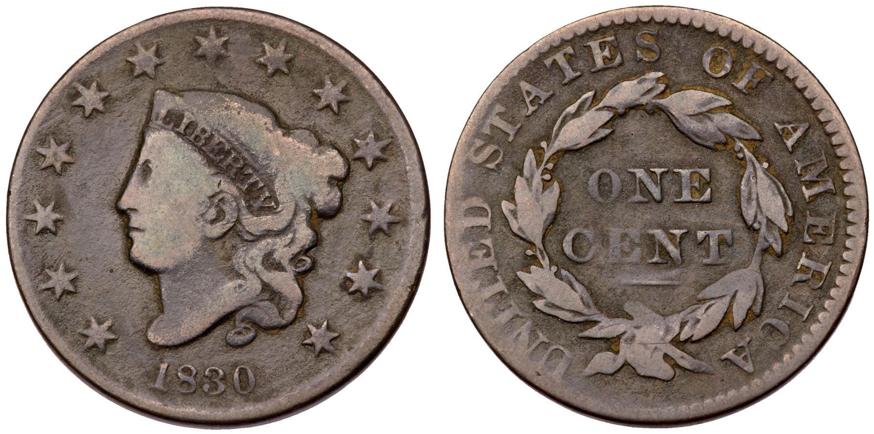 1830 N-6 R-4 Medium Letters VG8Dark olive with lighter steel on the high points and uniform microgranularity covering the surfaces. Free of notable marks otherwise. UNITED is wearing into the rim at the top but the remaining legends and date are bold. Certificate Number: Pedigree: Ex; Phil Hyde