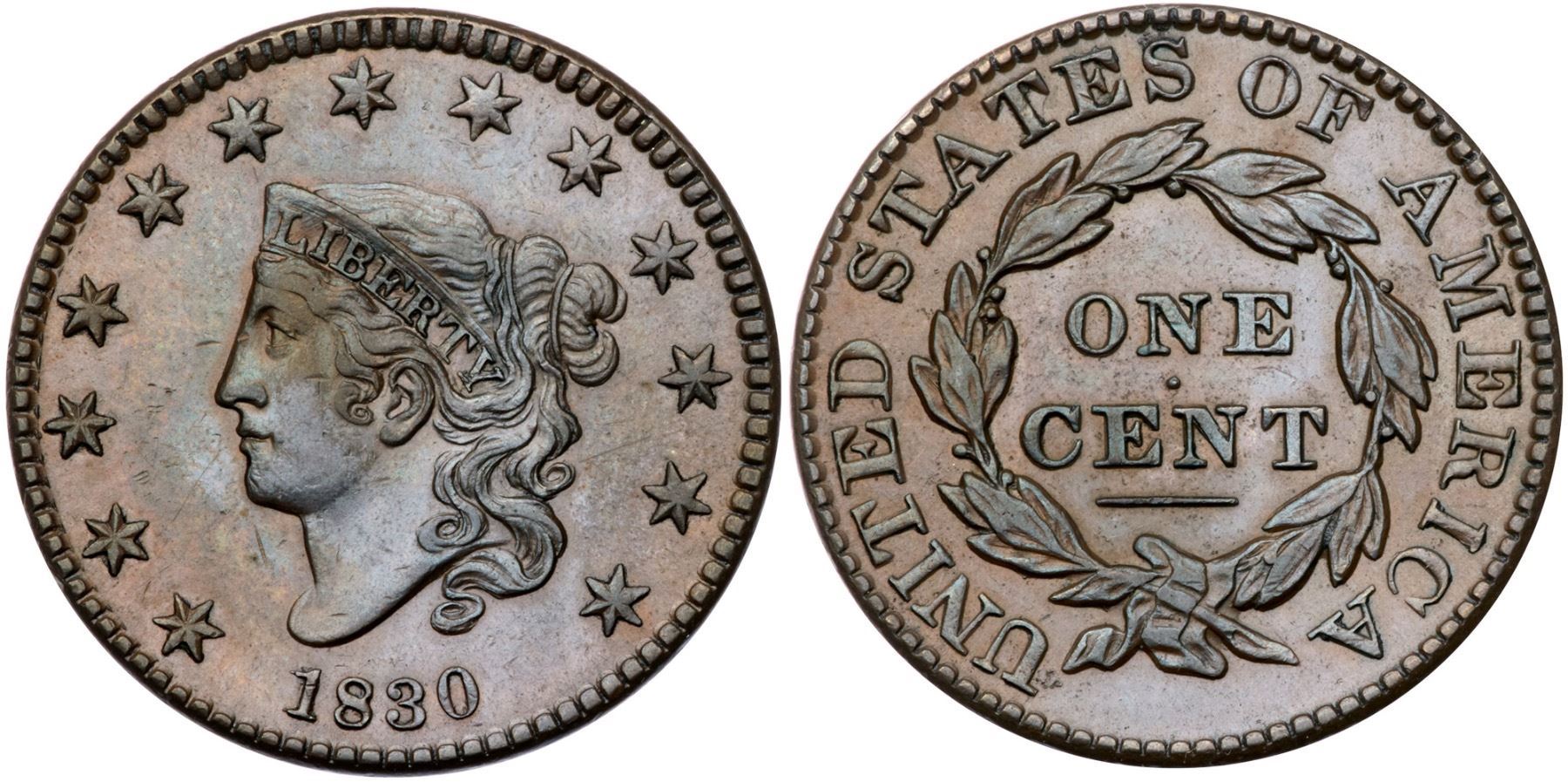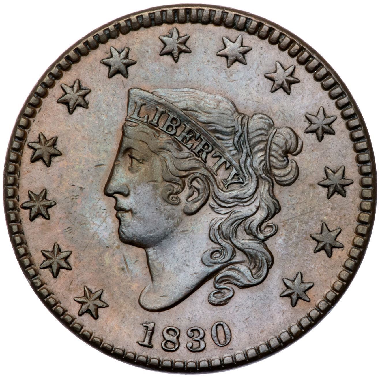 1830 N-8 R1 EF45Choice frosty medium brown and light chocolate. Sharply struck with very light wear and great eye appeal. Just a few ticks on the jawline near the earlobe and a very thin nick below the chin. EDS, die state a, with satiny fields and no cracks. The repunching on the left side of the 1 is sharp.Certificate Number: Pedigree: Ex M. H. Bolender 11/10/1951:182-Floyd T. Starr, Stack's 12/4/1984:1669-Fred H. Borcherdt Collection
