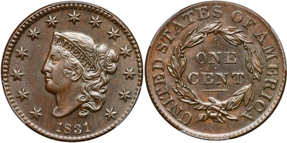 Very attractive lustrous medium chocolate brown. Satiny mint frost covers all but the highpoints of the devices and this cent has great eye appeal. A tiny, very thin nick or planchet chip under the O in ONE is the only notable mark, and it is barely visible. MDS with crumbling in the dentils and on the rim at star 9, but the full rim cud has not formed and the reverse is uncracked. Our grade is AU50 Choice. A beautiful cent that comes with a very nice provenance. The attribution and Twin Leaf Collection provenance are noted on the PCGS label. (The reverse of the slab is scuffed.)