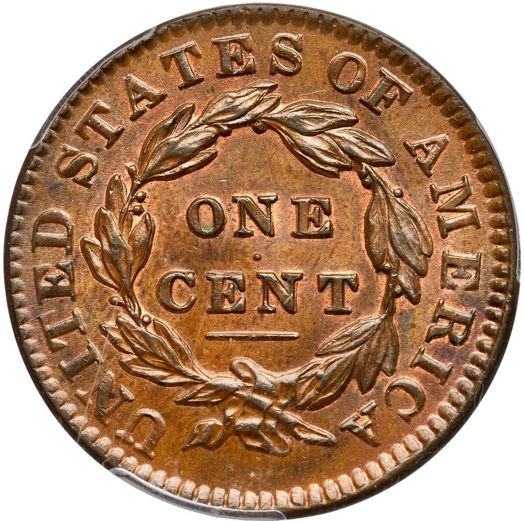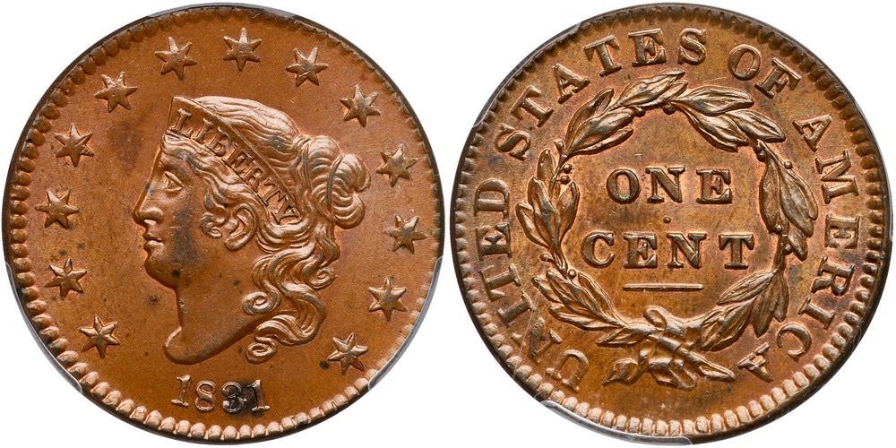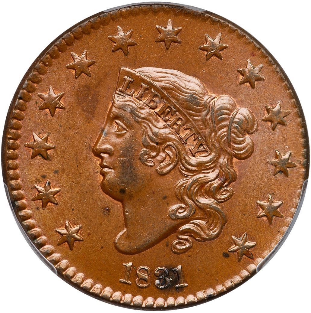 Frosty light to medium brown and light chocolate with traces of mint red on the obverse and at least 5% of the reverse showing mint color. Satiny mint luster covers the fields and protected areas and this cent is choice except for a spot of darker olive brown toning on the 31 in the date. MDS with fine radial die flowlines in the fields on both sides. Graded MS60+ by Del Bland. Our grade is MS60. An impressive cent in spite of the obvious spot. The attribution and Ralls-Ahumada provenance are noted on the PCGS label.