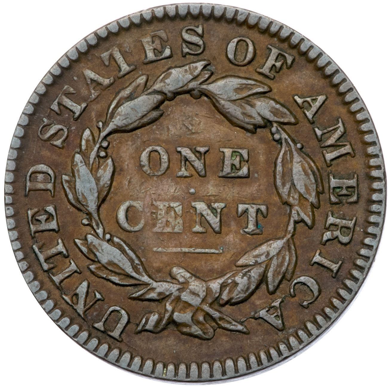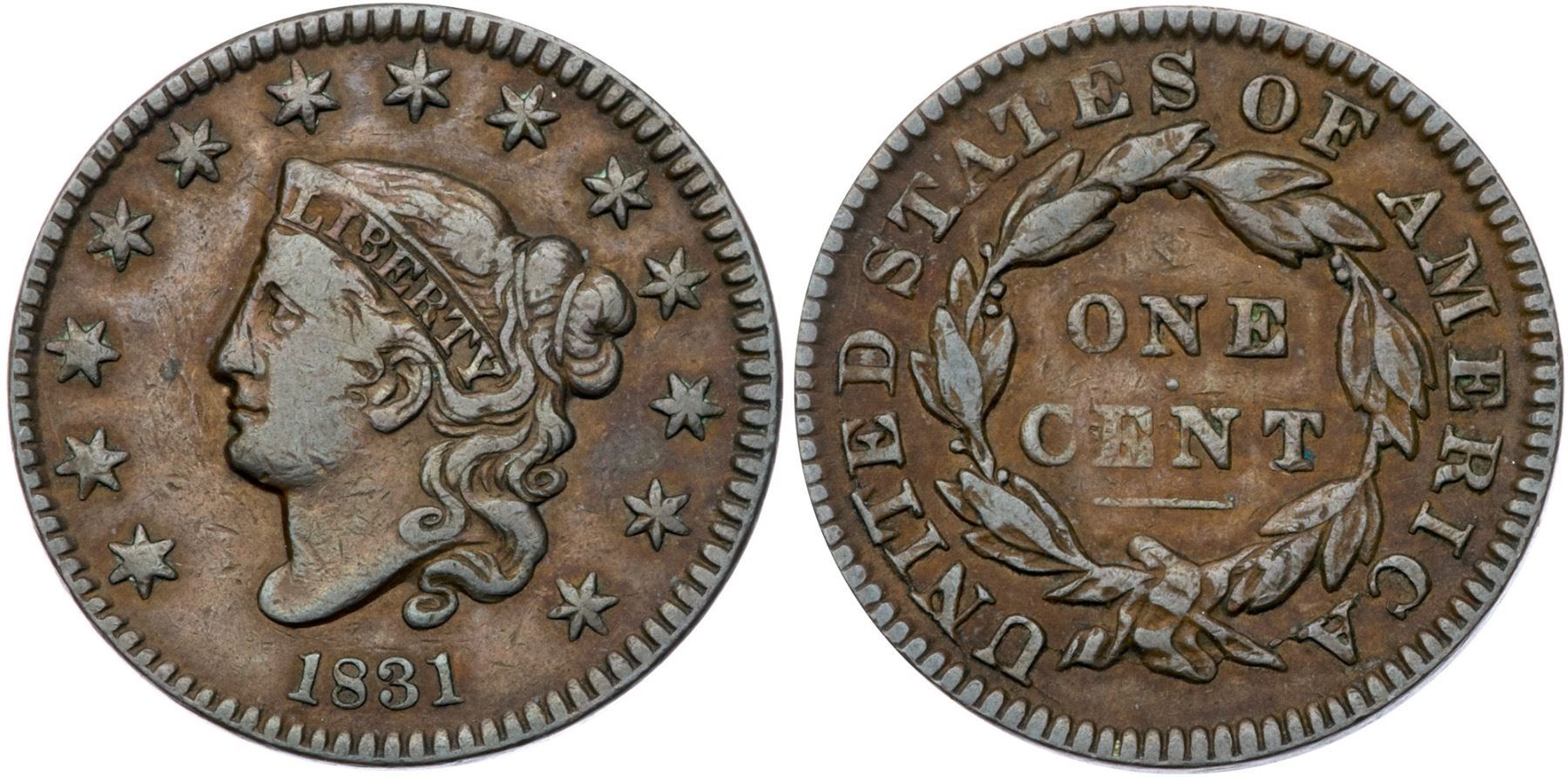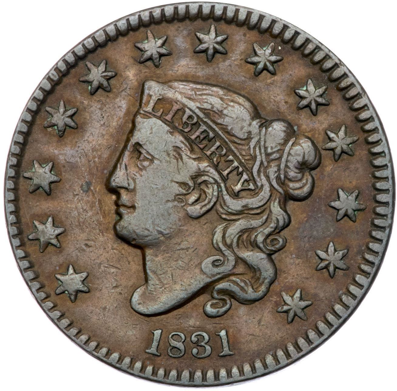 1831 N-4 R3 Medium Letters VF25Glossy chocolate and lighter steel brown woodgrained with lighter brown on the obverse. Smooth with a few nicks on the face and in the field off the end of the nose. MDS, die state a, with an uncracked obverse.Certificate Number: Pedigree: From the Fred H. Borcherdt Collection