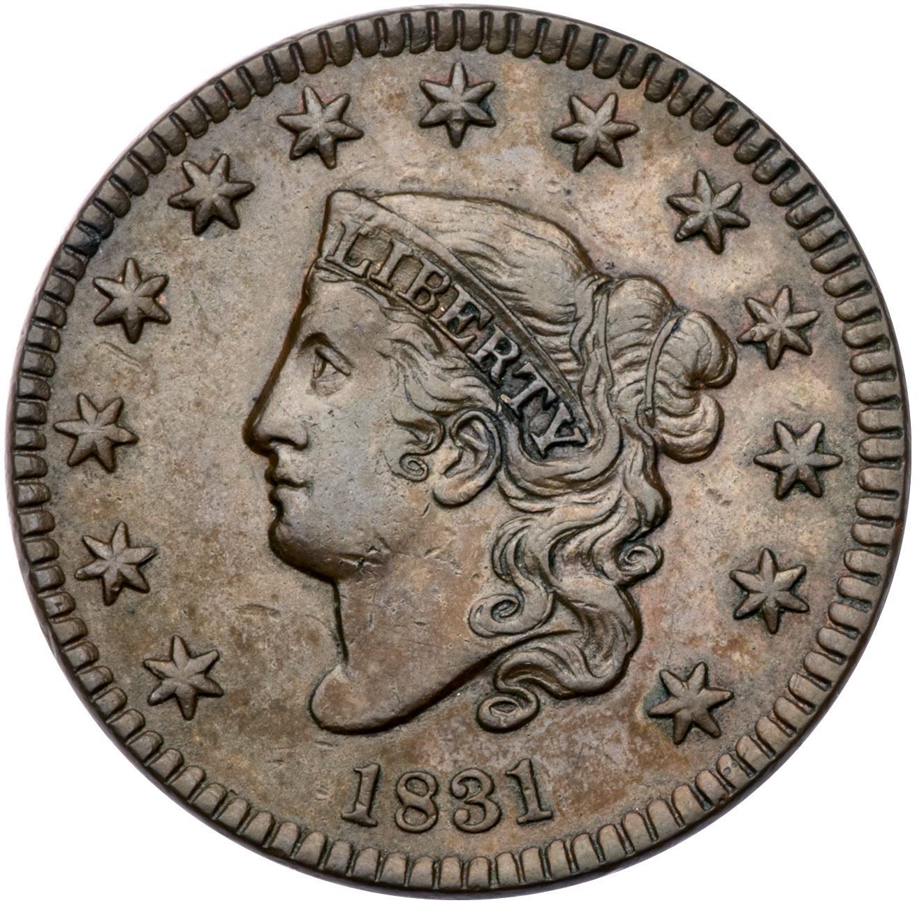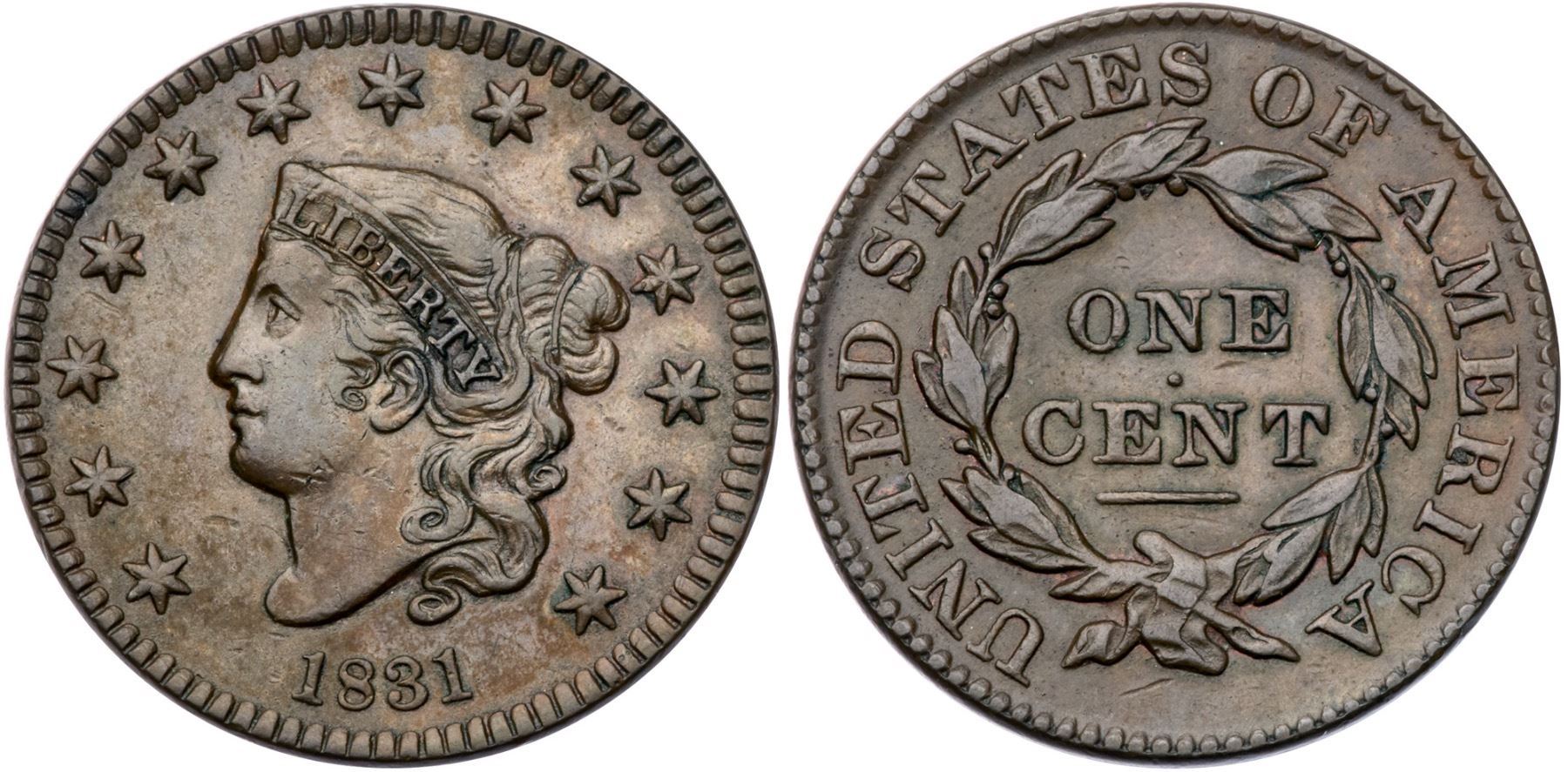 1831 N-6 R1 Large Letters VF30+Glossy light olive brown. Sharply struck and attractive with the details of a slightly higher grade, but there are a few minor contact marks, mostly on the jaw. Sharply struck EDS, die state a, before any crumbling in the dentils on the reverse. Close to VF35.Certificate Number: Pedigree: From the Fred H. Borcherdt Collection