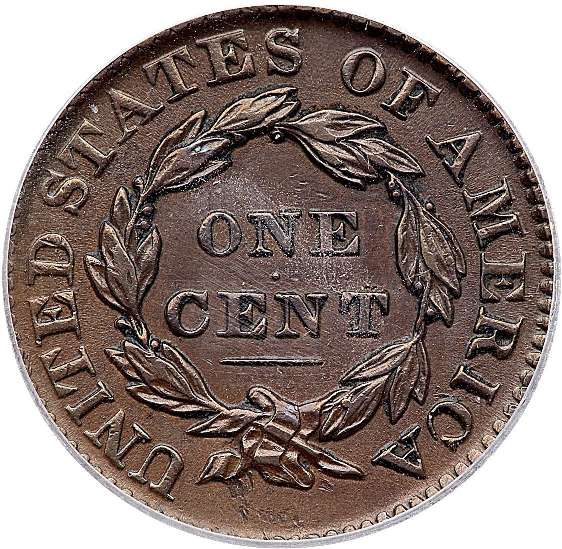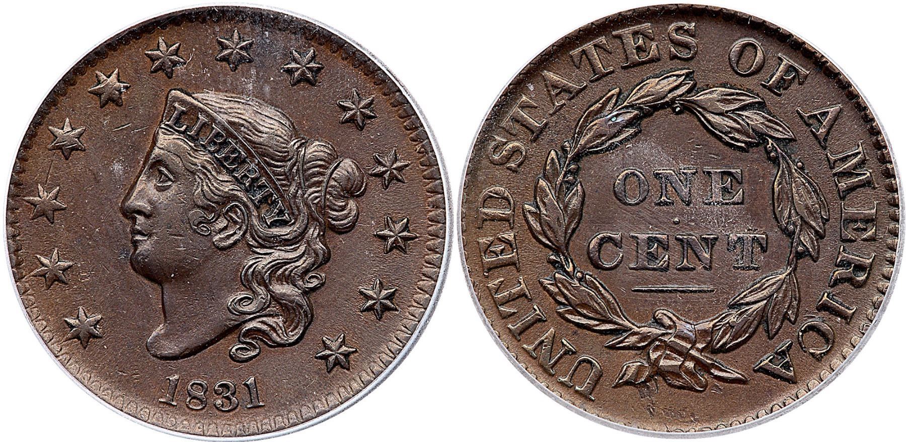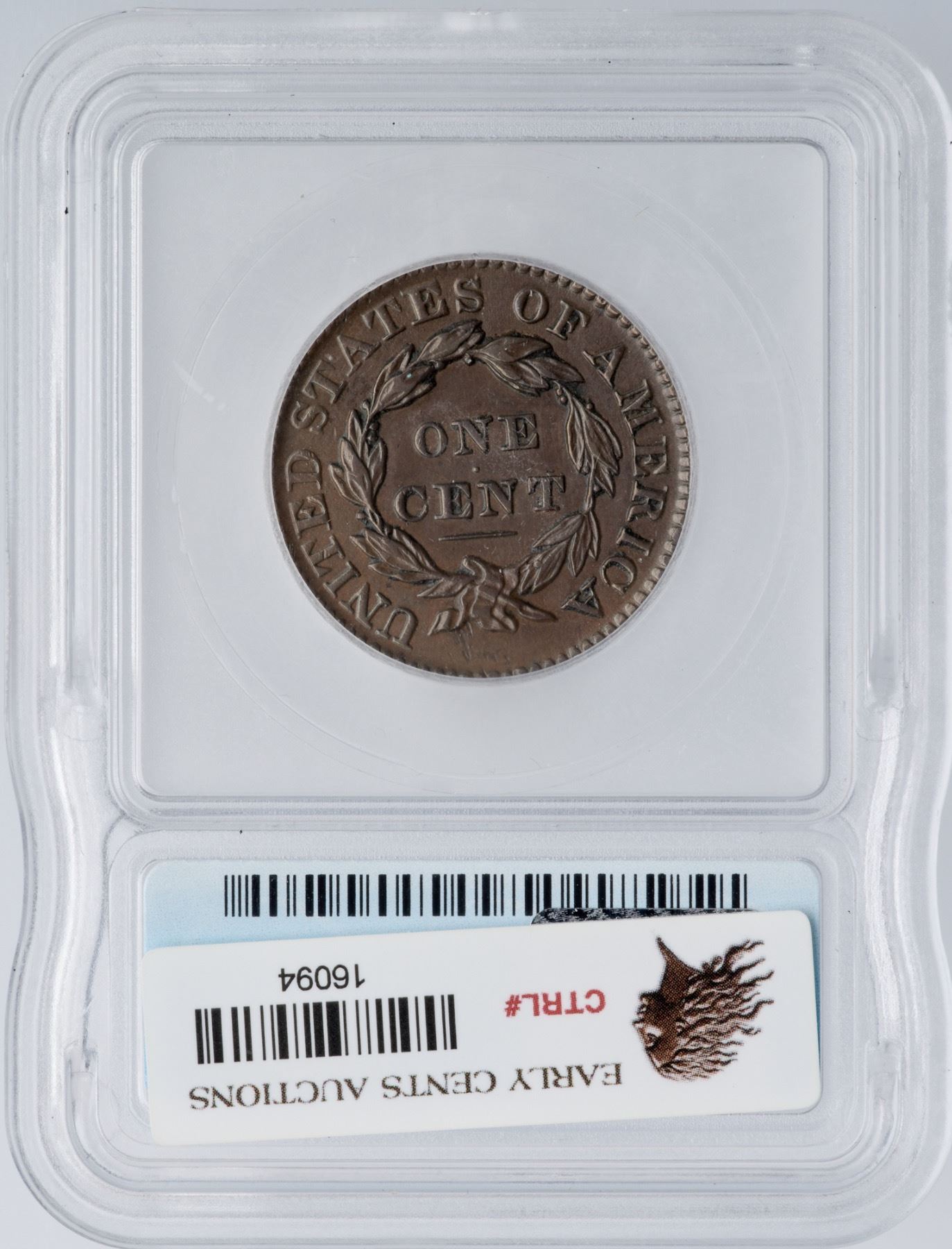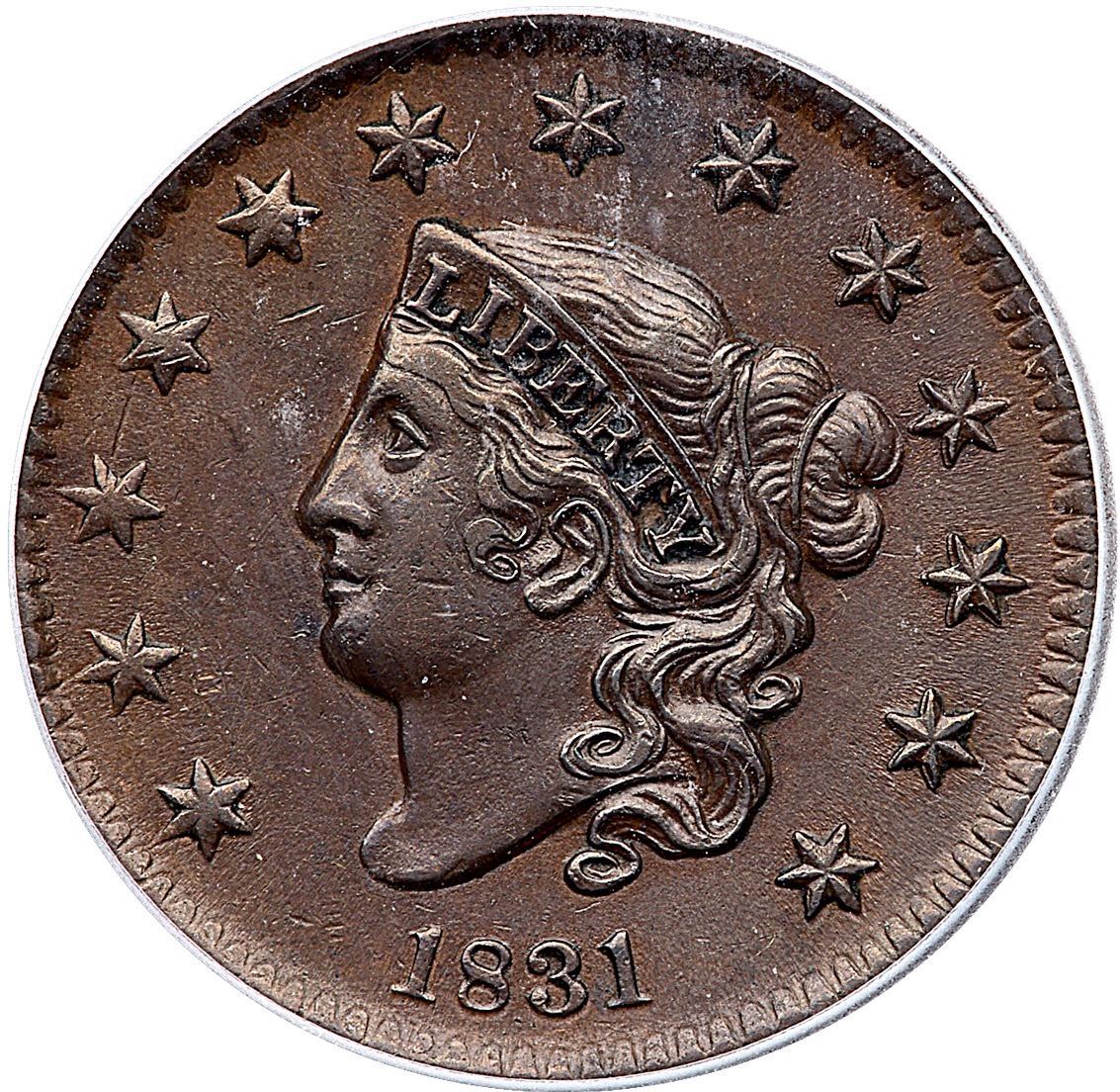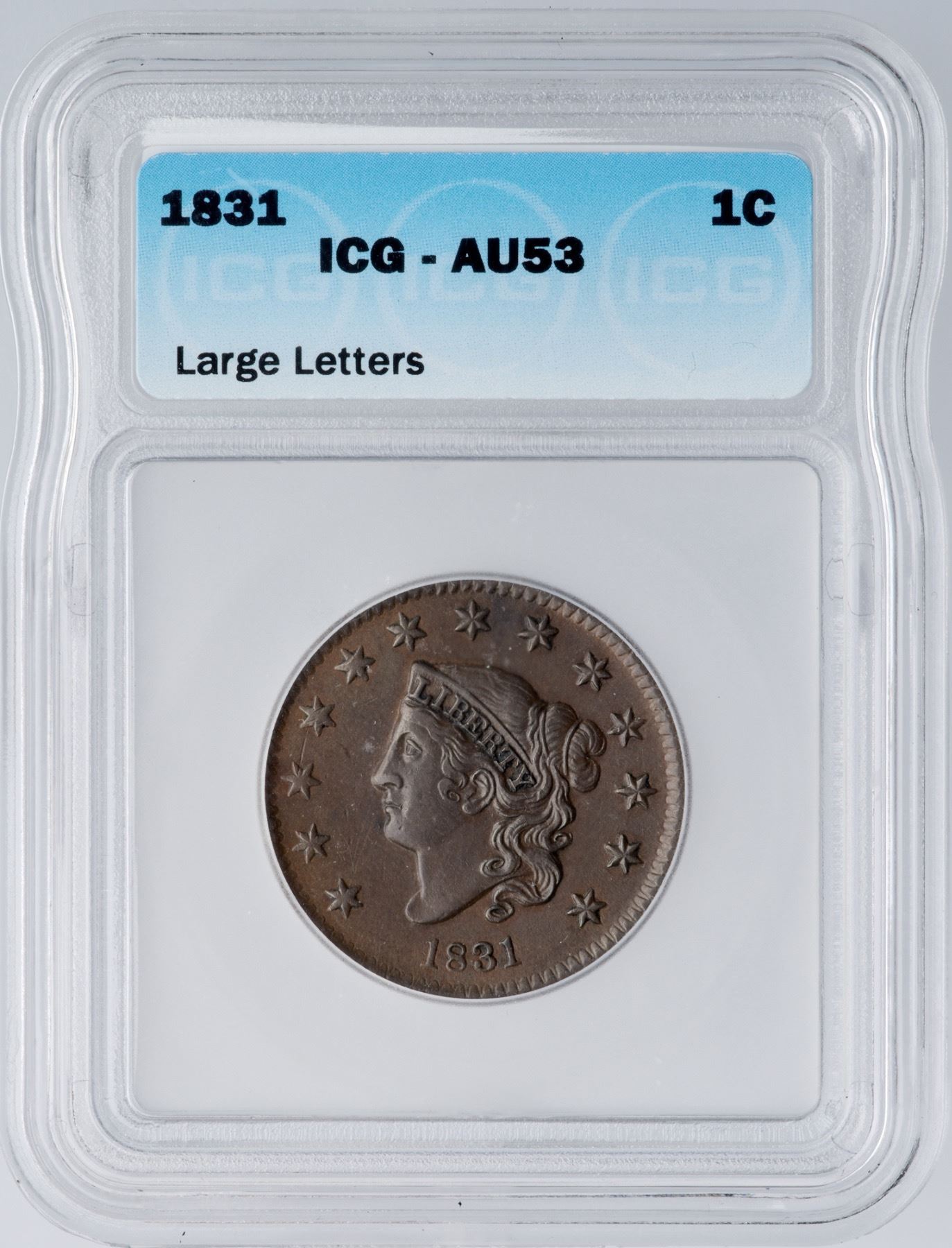 1831 N-7 R-1 ICG AU53AU sharpness but there is dark, grainy crud in the protected areas of both sides, and a handful of minor nicks on the obverse. These include one in the upper hair, a few on star 3, a couple below star 4, and a tiny scratch between stars 3-4. Nothing major but enough to warrant mention. Semi-glossy chocolate and light browns. Our grade is EF40.Certificate Number: Pedigree: Ex; Phil Davis