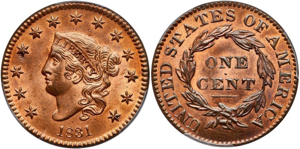 Very attractive bright original mint red fading to medium brown and steel on the highpoints with more than half the original mint color remaining. No spots or stains, only a few minor contact marks. The notable ones are a collection of ticks at the lower point of star 4, a nick on the bottom of the eye, and a collection of tiny abrasions between star 13 and the curl. None of these marks is distracting and this cent has great eye appeal. Looks like a gem cent to the unaided eye. MDS showing a die crack through UNITED-ST but no cud. Graded MS65 in the Wright-Bland condition census. Our grade is MS63. Comes with a nice provenance. The attribution and Masters-Ahumada provenance are noted on the PCGS label.
