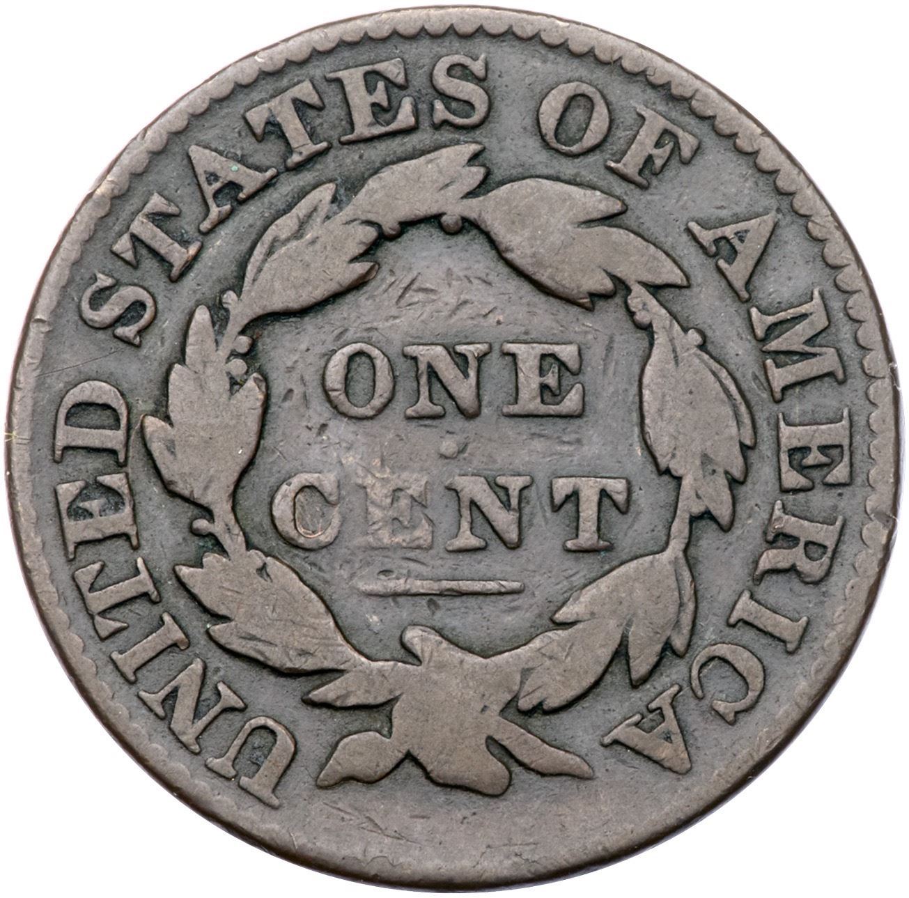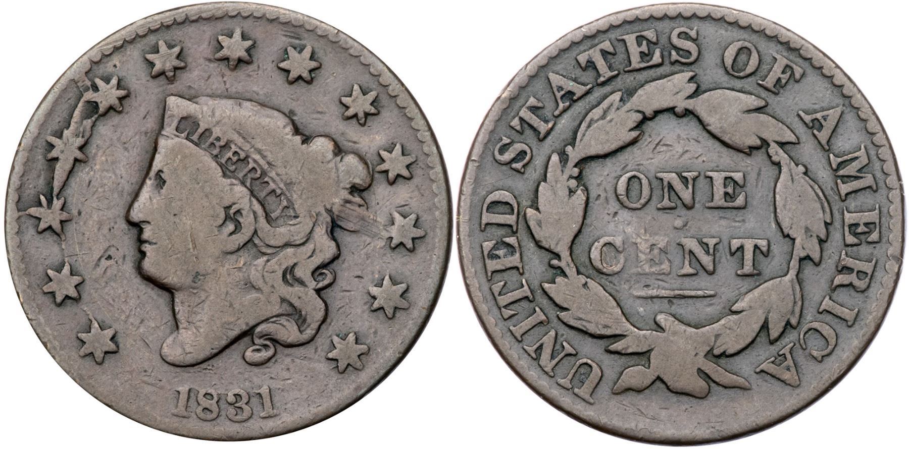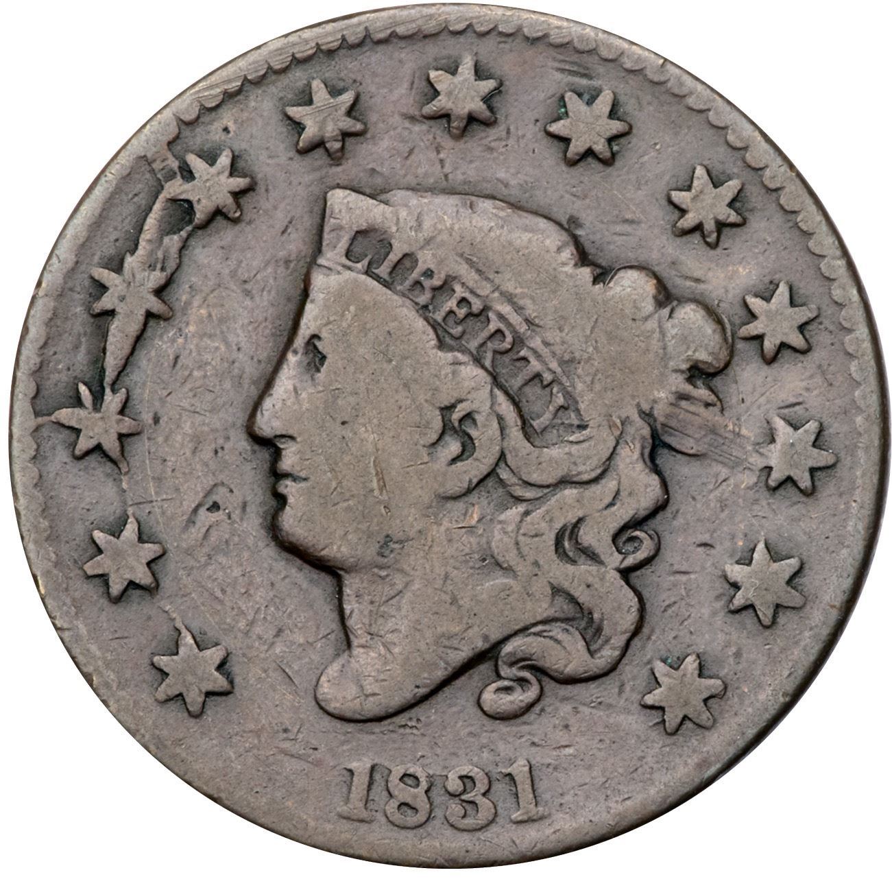 1831 N-9 R2 Large Letters VG7Glossy medium chocolate with lighter steel brown on the devices. Smooth with nice eye appeal but there is a dull scrape on the lower part of the outer segment of the hair bun. Rare LDS, die state g, with internal raised cud breaks at stars 3-5. Only a half dozen in this die state are known to us. Graded VG8 net VG7 by Noyes, his photo #32037.Certificate Number: Pedigree: From the Fred H. Borcherdt Collection