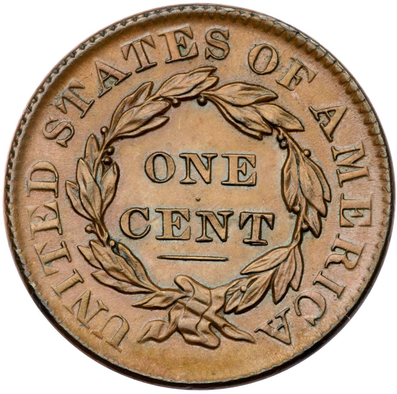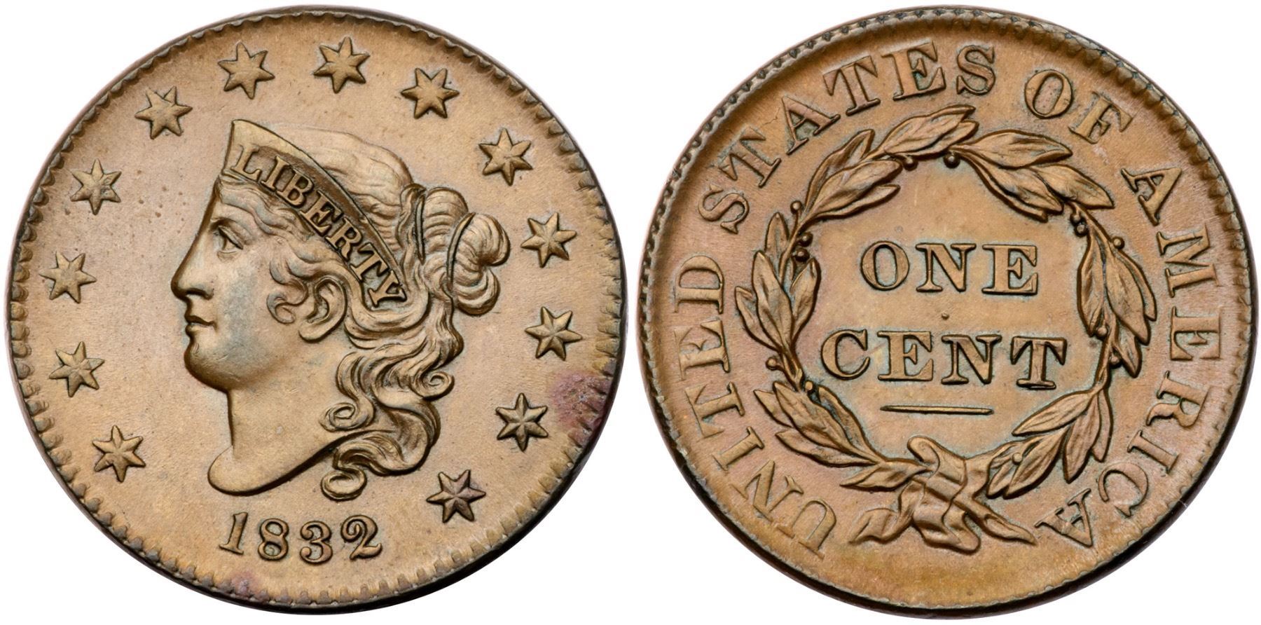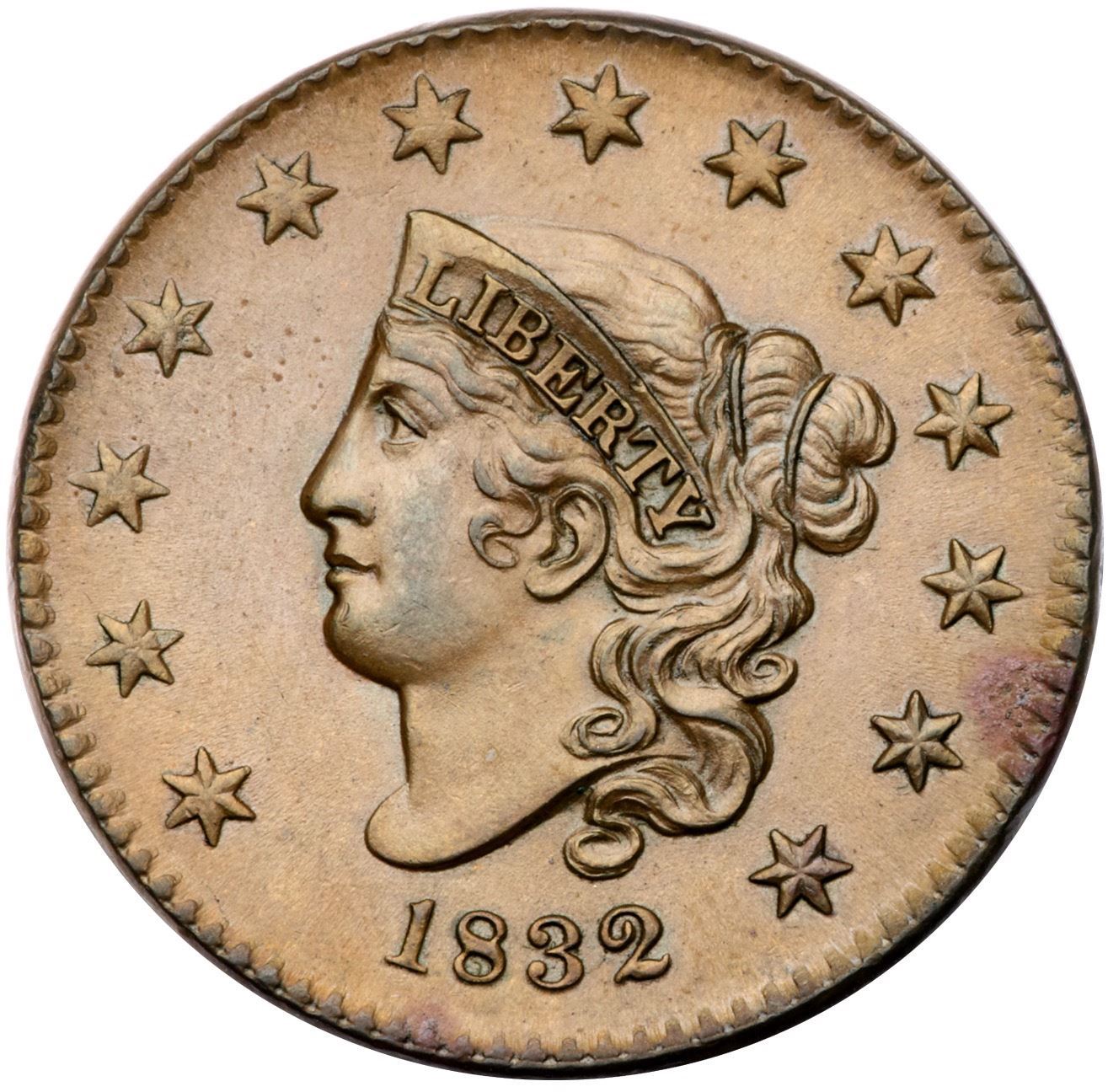 1832 N-3 R1 Large Letters AU55Very attractive lustrous tan and light brown with a puff of reddish brown toning at the dentils over star 12. There are microscopic traces of verdigris nestled between the dentils in the stained area. Looks mint state but there is a hint of rub on the very highest points of the hair. A choice cent if not for the small stain. The reverse is flawless. LDS, die state b, with minor crumbling in the dentils at ES-O.Certificate Number: Pedigree: From the Fred H. Borcherdt Collection