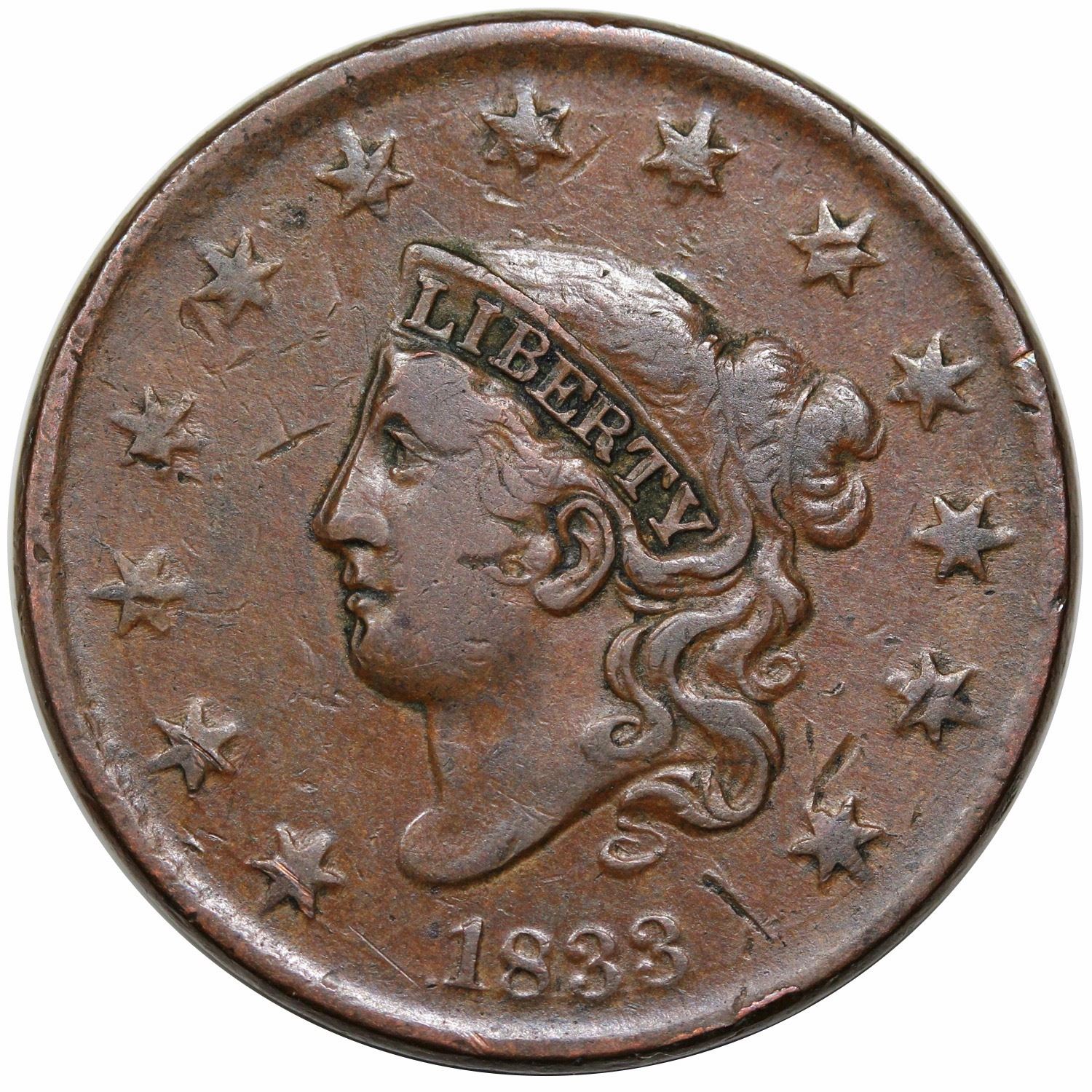 1833 Coronet Head Large Cent, N-2, R2, VF20.