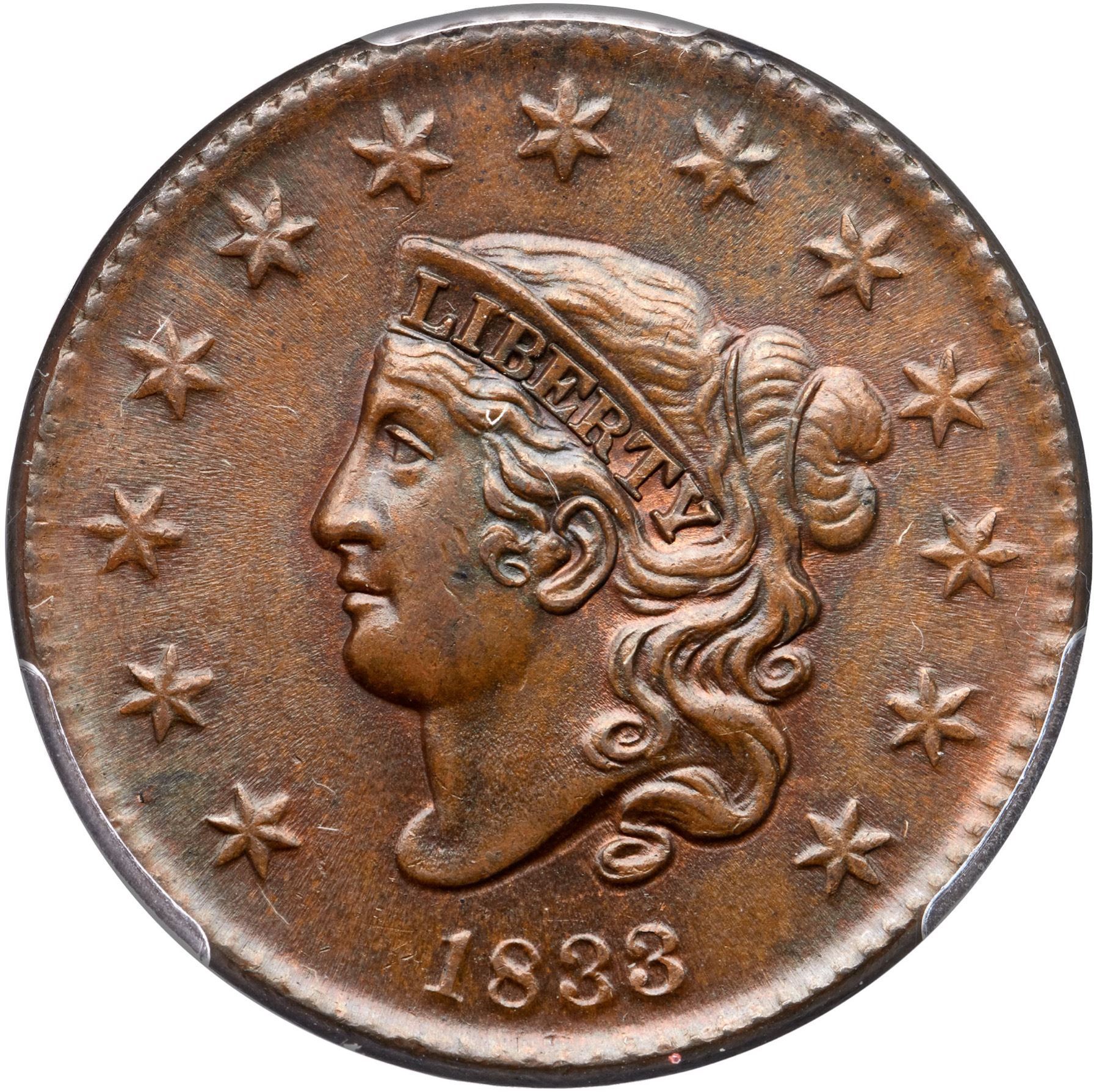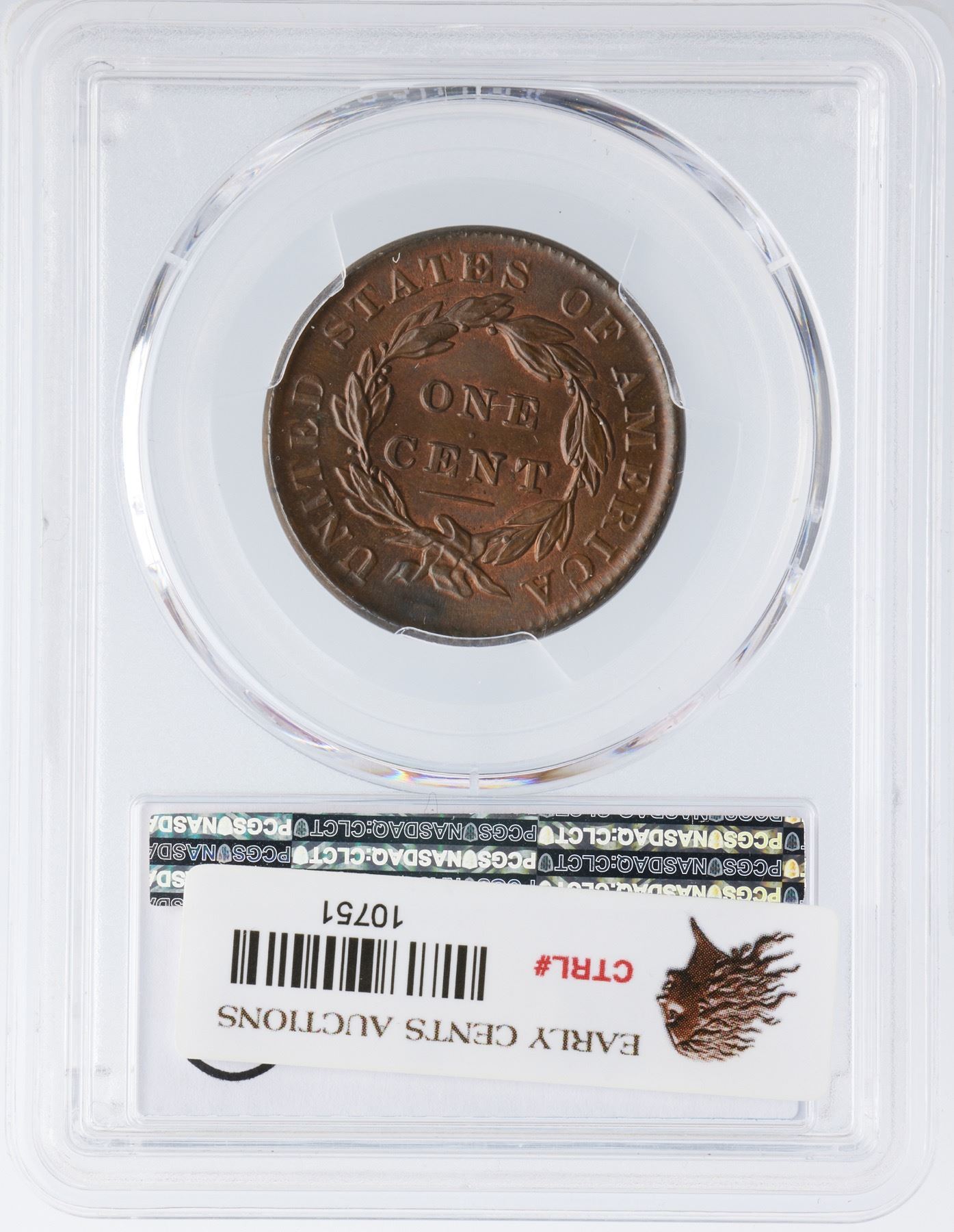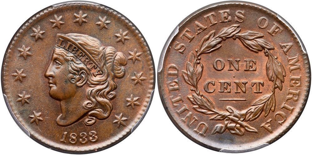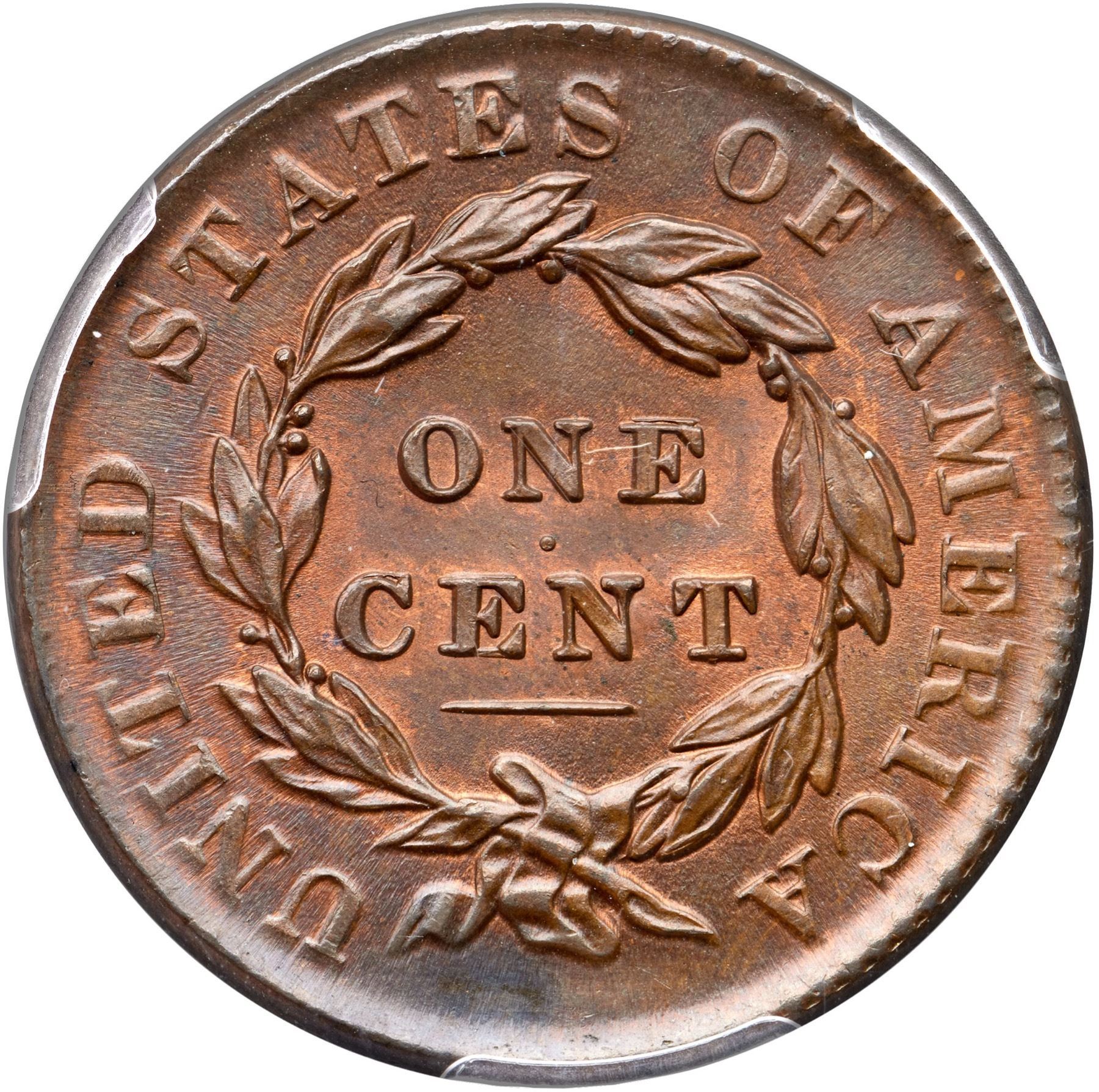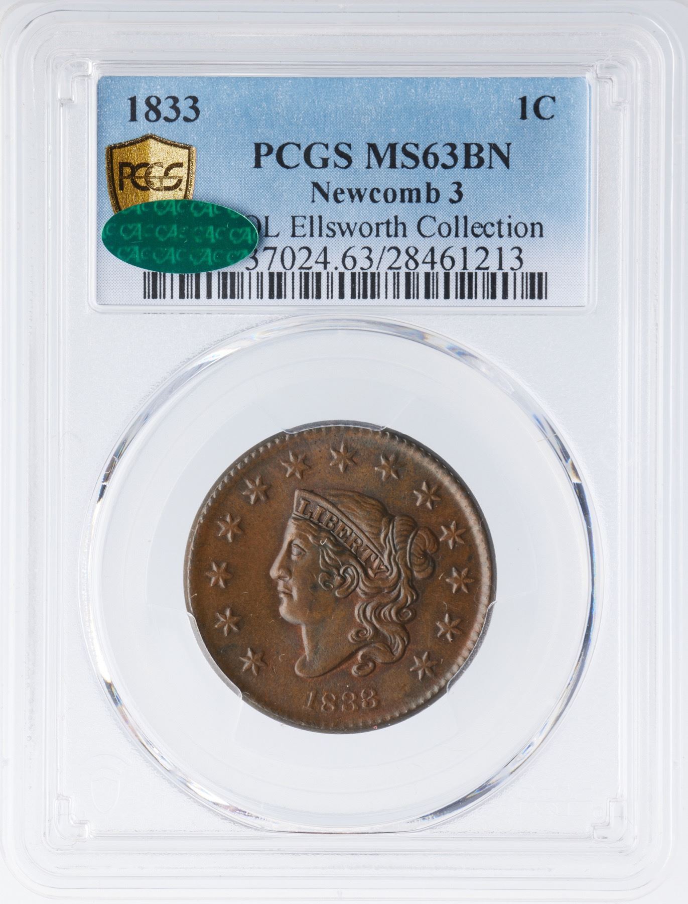 Highly lustrous medium steel brown blending to chocolate in protected areas. Traces of mint red show on the obverse while about 20% of the reverse has retained some mint color. Satiny and very attractive. The only marks are some tiny ticks on the cheek and a puff of darker olive brown toning under the wreath ribbon. M-LDS with flowlined fields and weakened dentils, especially on the reverse. Graded MS63 by Del Bland. Noyes says MS63 and tied for CC#5, his photo #36756. Our grade is MS60+. The attribution and COL Ellsworth Collection provenance are noted on the PCGS Gold Shield label.