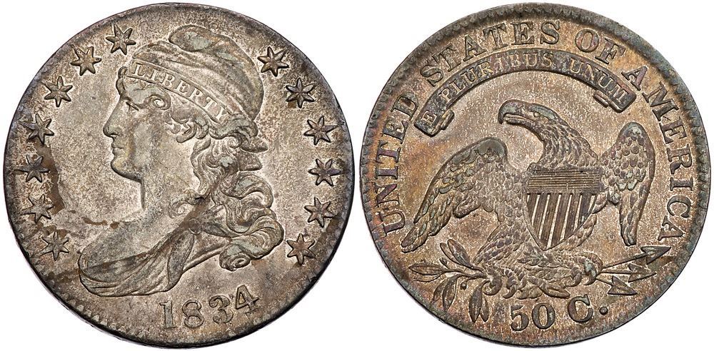 1834 Overton-103 R2 Large Date & Letters PCGS XF45Sharper with nice eye appeal but there is a diagonal scratch on the cheek and neck and a small planchet chip on a curl over the clasp (as struck). The reverse is flawless. Frosty silver and light grayish steel with luster in protected areas and light frCertificate Number: 59098141Pedigree: Ex Fred H. Borcherdt Collection