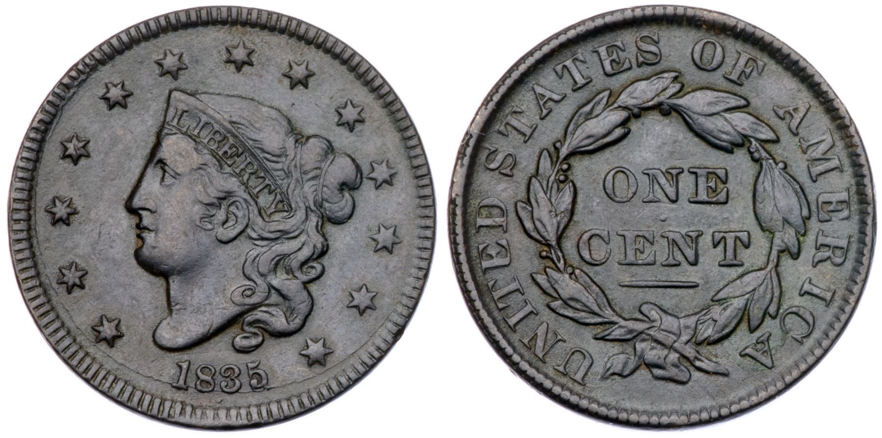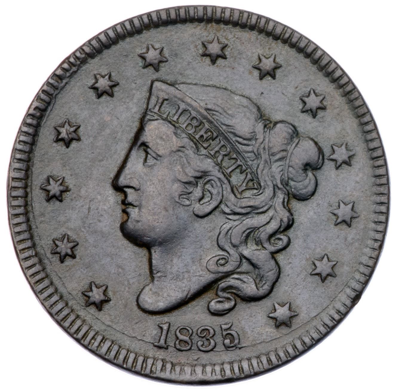 1835 N-13 R4 Small 8 & Stars VF20Ten points sharper with microscopic granularity under partly glossy dark olive brown and steel. No marks but there are traces of fine verdigris tucked into protected areas. M-LDS, die state f, with narrow but clearly defined rim cuds at D-ST.Certificate Number: Pedigree: From the Fred H. Borcherdt Collection
