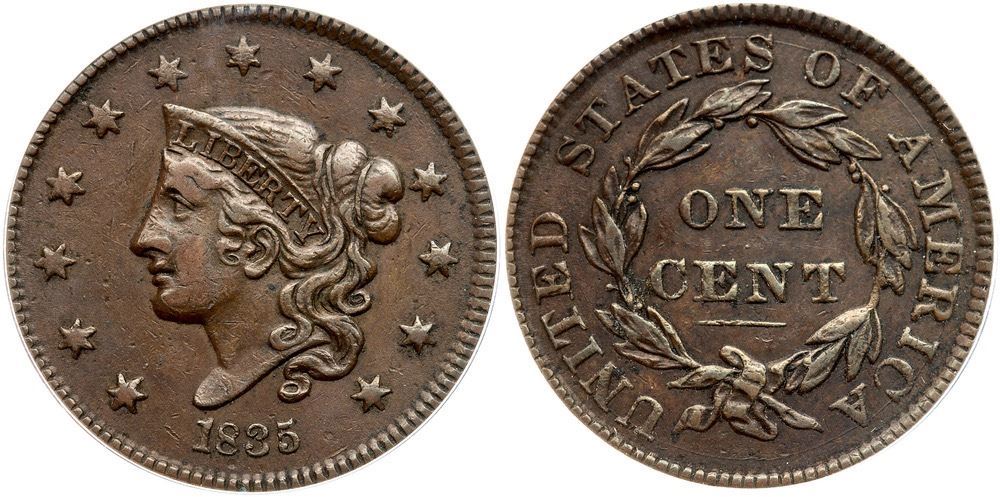 Medium chocolate brown with lighter brown on the highpoints. No roughness but there are minor contact marks scattered over both sides. A small flake under the right side of the 8 is the best identifying mark. Sharply struck EDS. Our grade is VF35. 7464417
