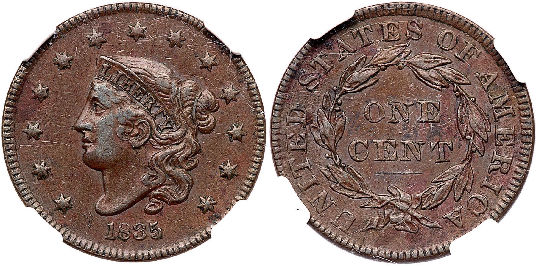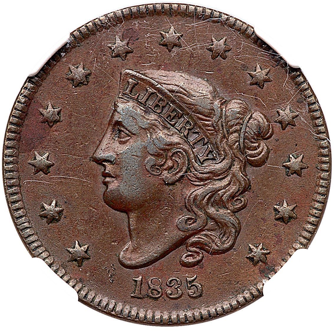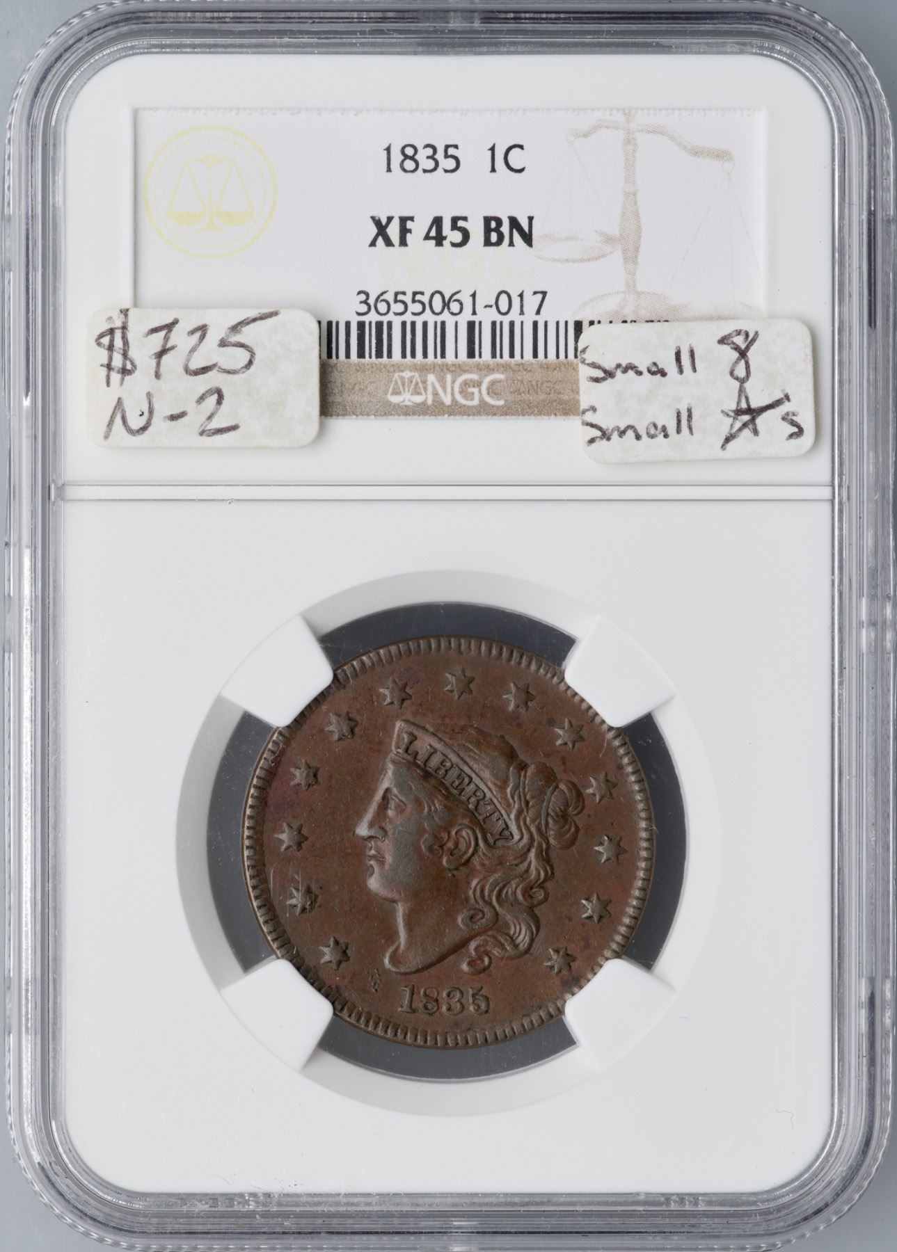1835 N-2 R-3 Small 8, Small Stars NGC XF45EF45 sharpness but there are scattered areas of shallow oxidation resulting in ruddy chocolate brown areas containing traces of dark scale on both sides. Otherwise medium brown, free of notable marks. EDS. Our grade is VF30.Certificate Number: Pedigree: Ex; Phil Davis