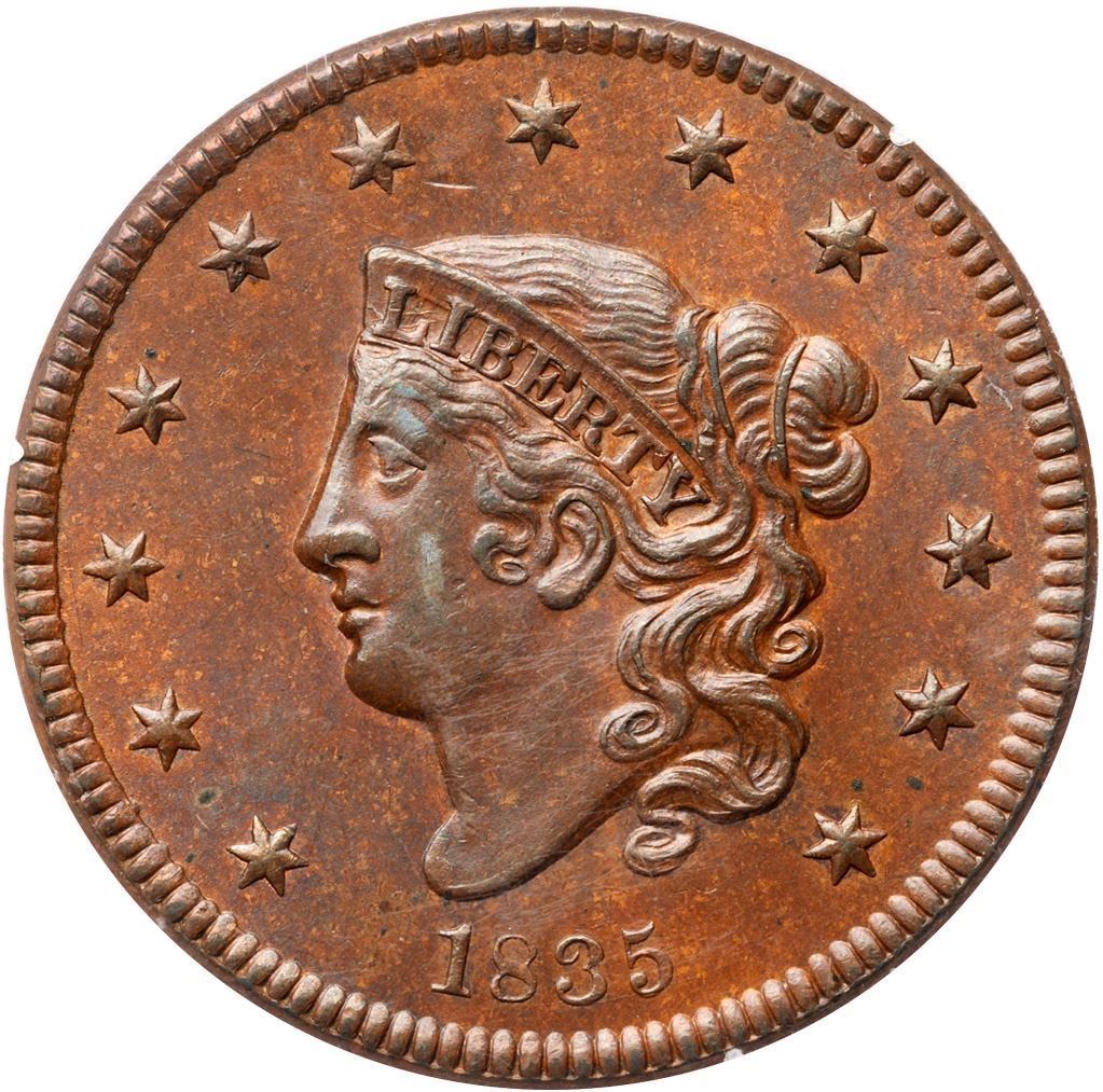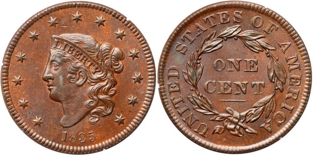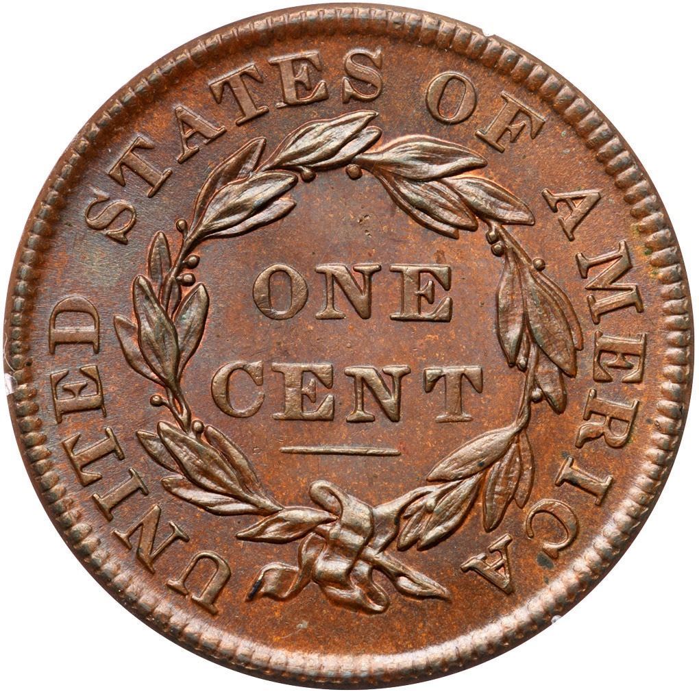 Frosty reddish tan and light bluish steel with peeps of mint red on both sides. Satiny mint luster covers this cent and it has excellent eye appeal. A light nick right of star 6 is the only notable mark. E-MDS. There is a tiny rim cud between stars 2 & 3 and the repunching on the C in AMERICA is clear. Our grade is MS60+. Housed in a small PCGS slab, the coveted OGH "rattler."