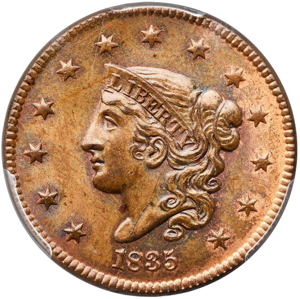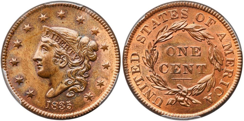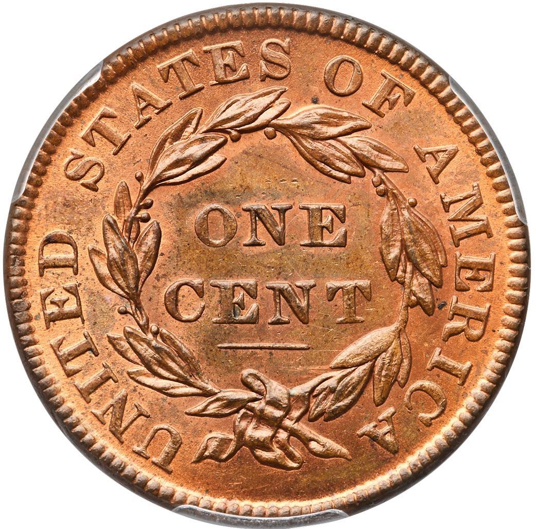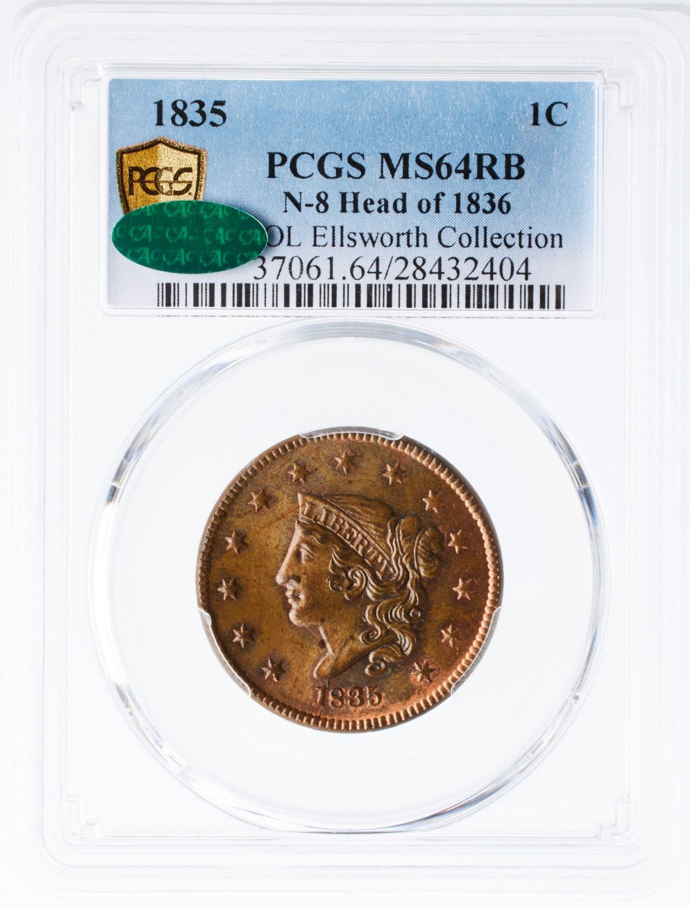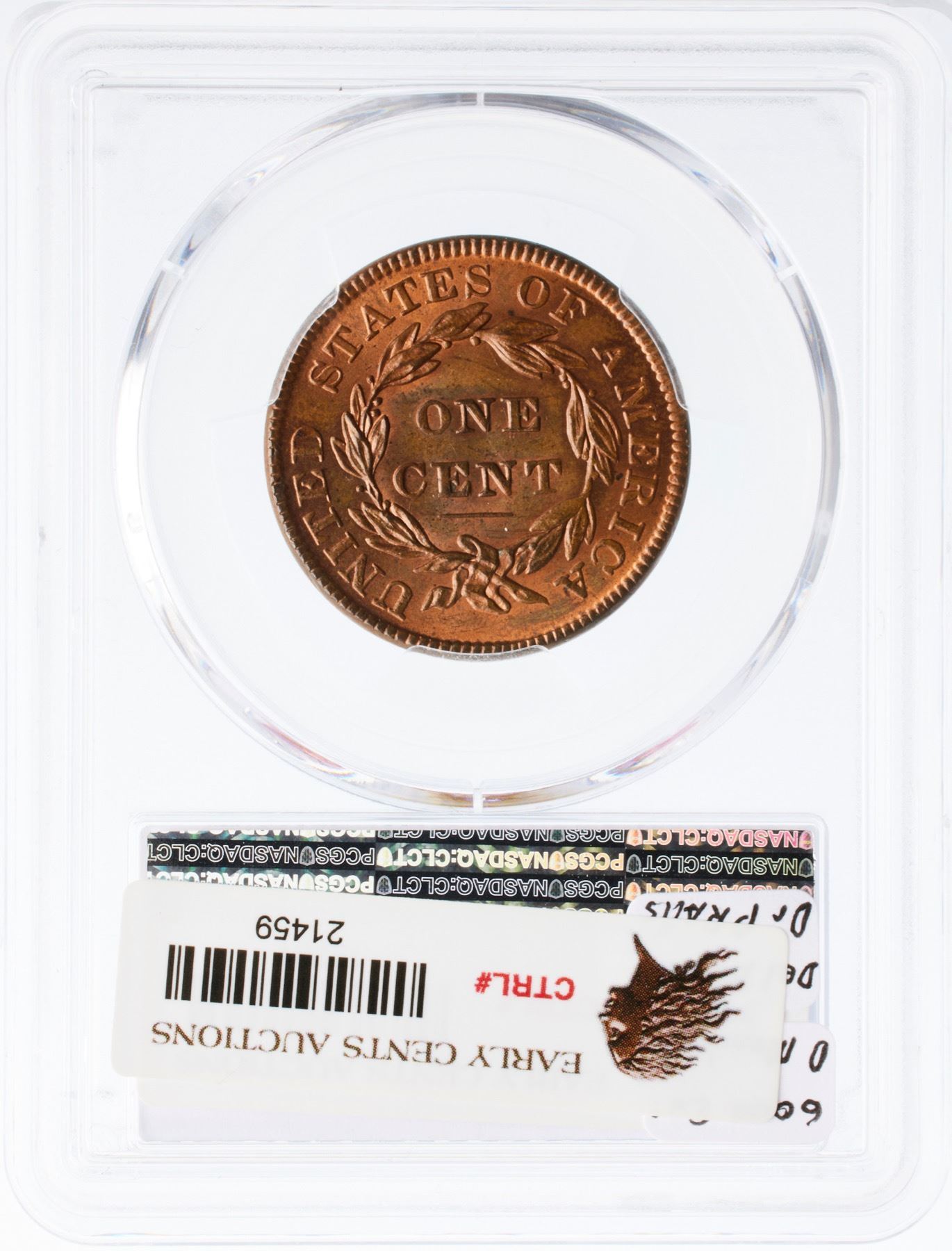Glossy light olive and steel brown with at least 10% of the bright mint red remaining on the obverse and more than a third of the original red showing on the reverse. The only notable marks are a small spot of reddish brown toning on the front edge of the neck, a faint streak of darker toning slanting down into the field from the coronet, and a speck of dark toning under the left side of the O in OF. This cent has great eye appeal. MDS with a strong die crack up from the dentils through the 1 in the date along the bust and neck to the back of the ear, then weakly up through the head to the bottom point of star 8 where it fades away. Called MS64 by Bland. Our grade is MS63. A very nice cent that is clearly in the condition census. The attribution and COL Ellsworth Collection provenance are noted on the PCGS Gold Shield label.