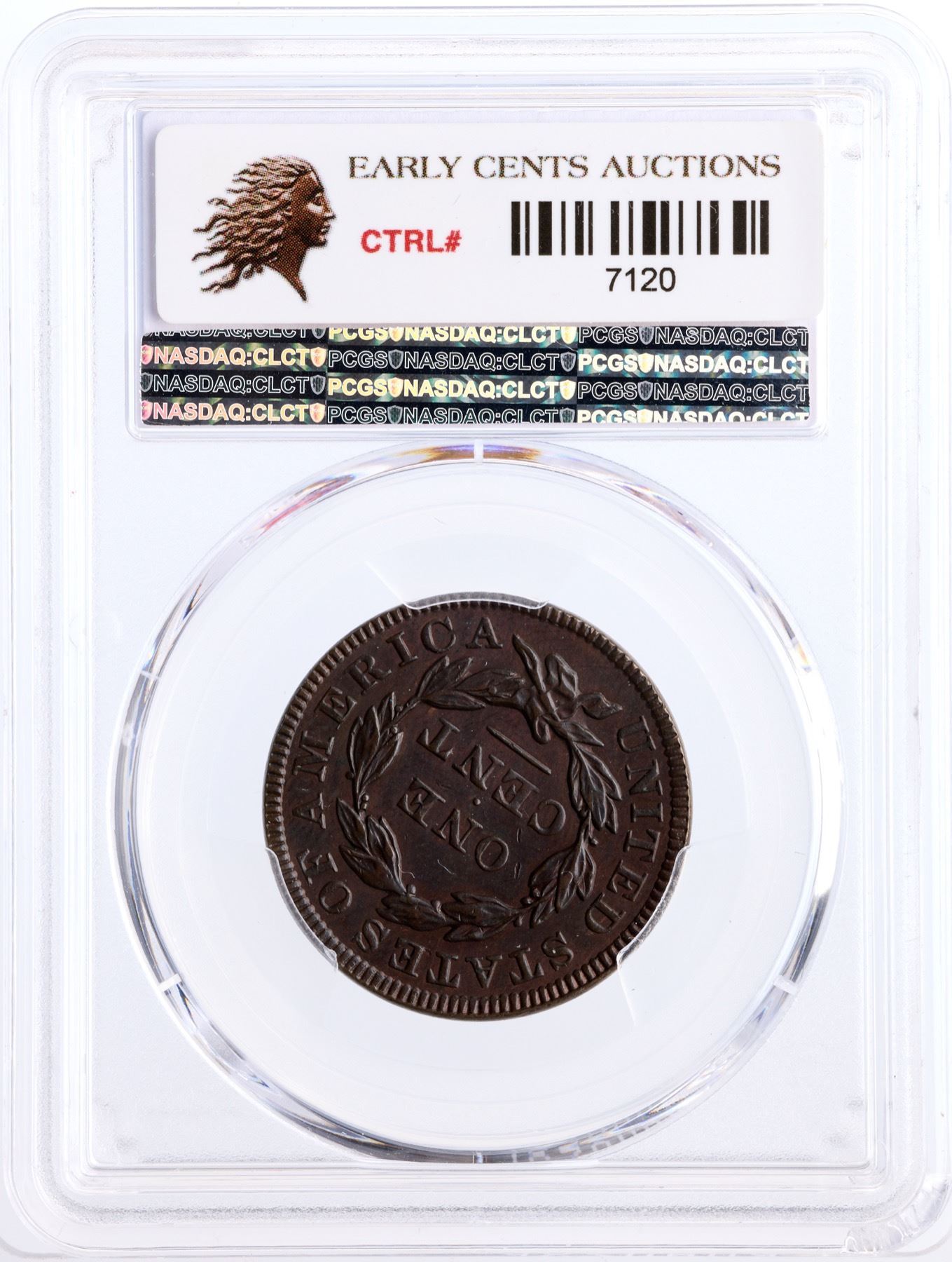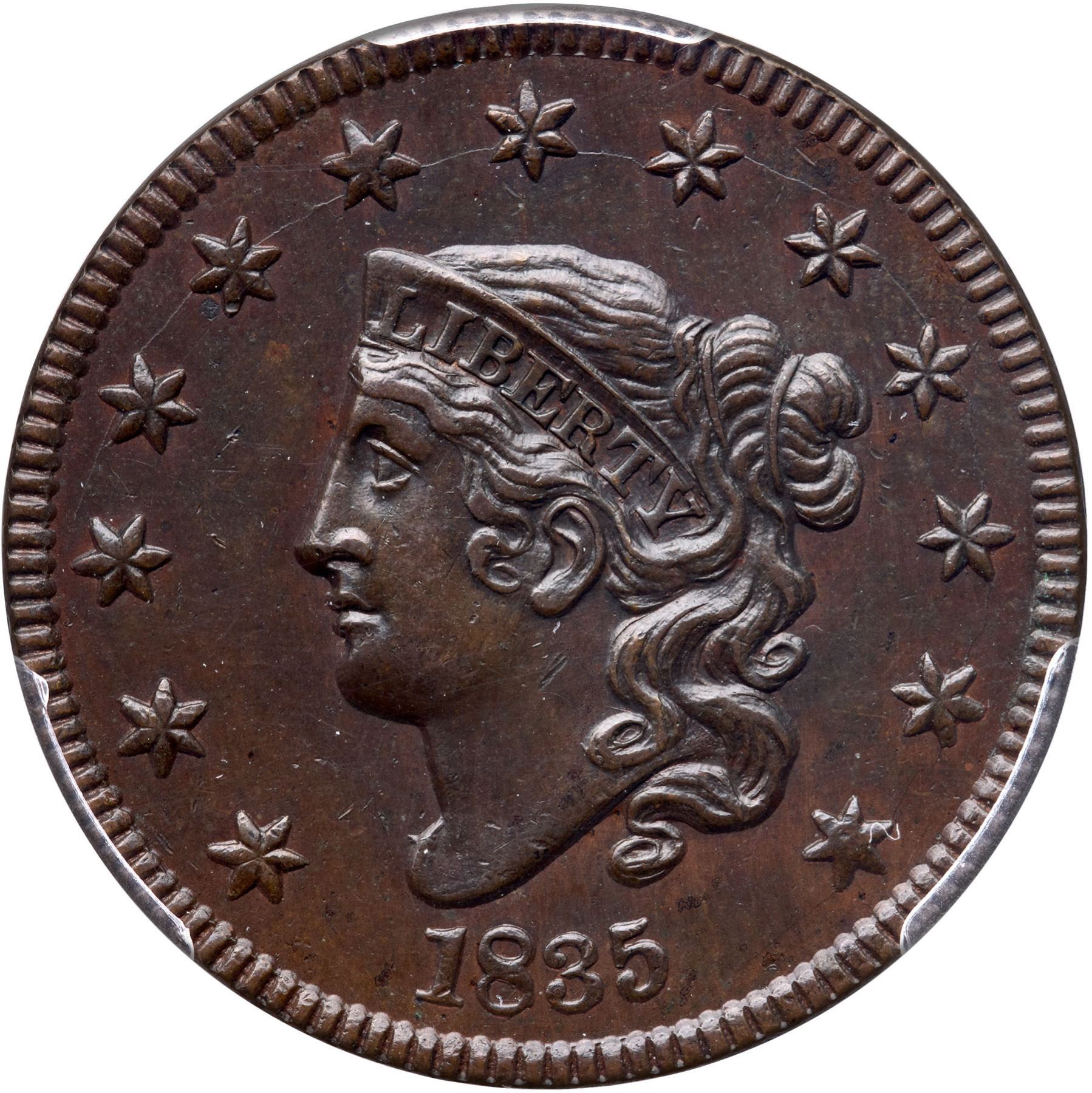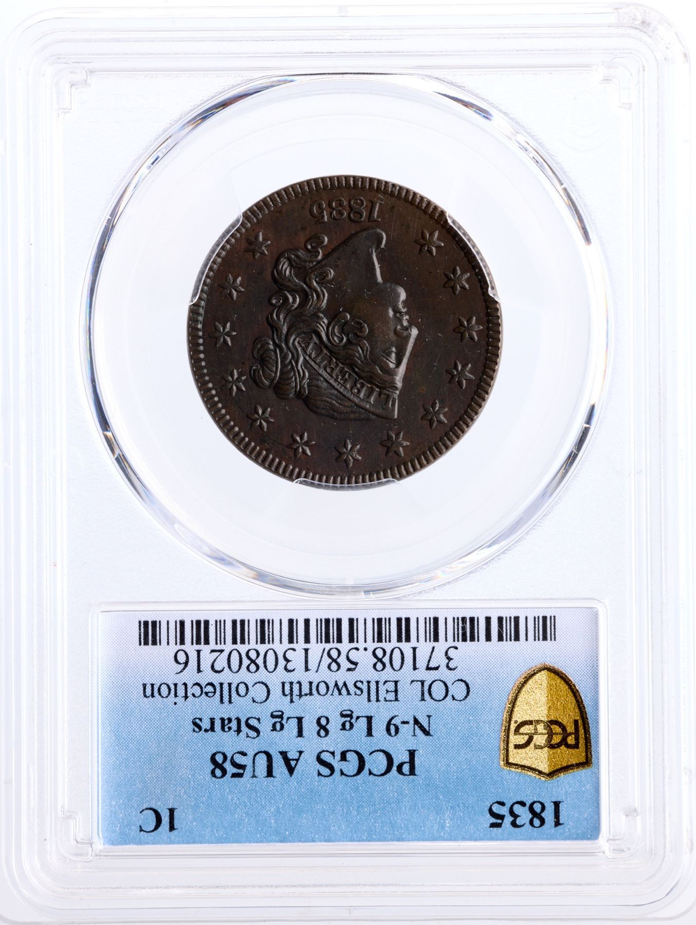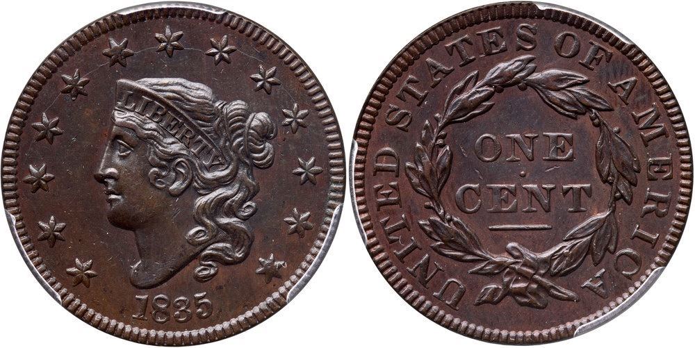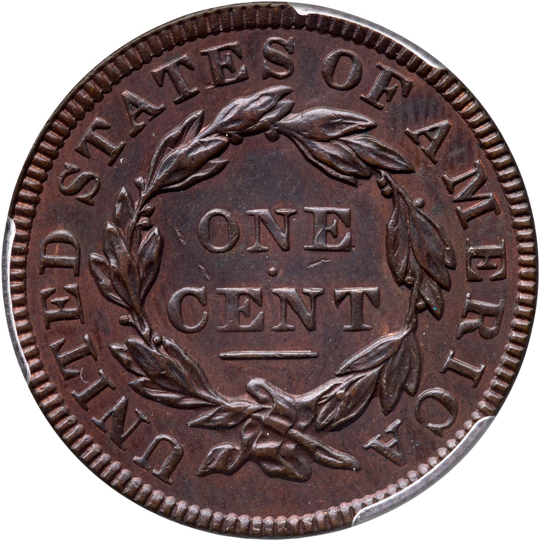 Glossy dark steel brown and chocolate with frosty slightly lighter reddish steel brown toning in protected areas of the reverse, possibly from an old cleaning. The surfaces are smooth and show only a very few trivial contact marks. These include a tiny nick high on the neck, one more under the E in ONE, and two more over the C in CENT. Sharply struck EDS with the reverse die uncracked. Called AU55 and CC#2 in the Bland census. Noyes says AU55 net EF45 and CC#2 behind a slightly finer specimen, his photo #21833. Our grade is EF45. A great example of this tough die variety. The attribution and COL Ellsworth Collection provenance are noted on the PCGS Gold Shield label.