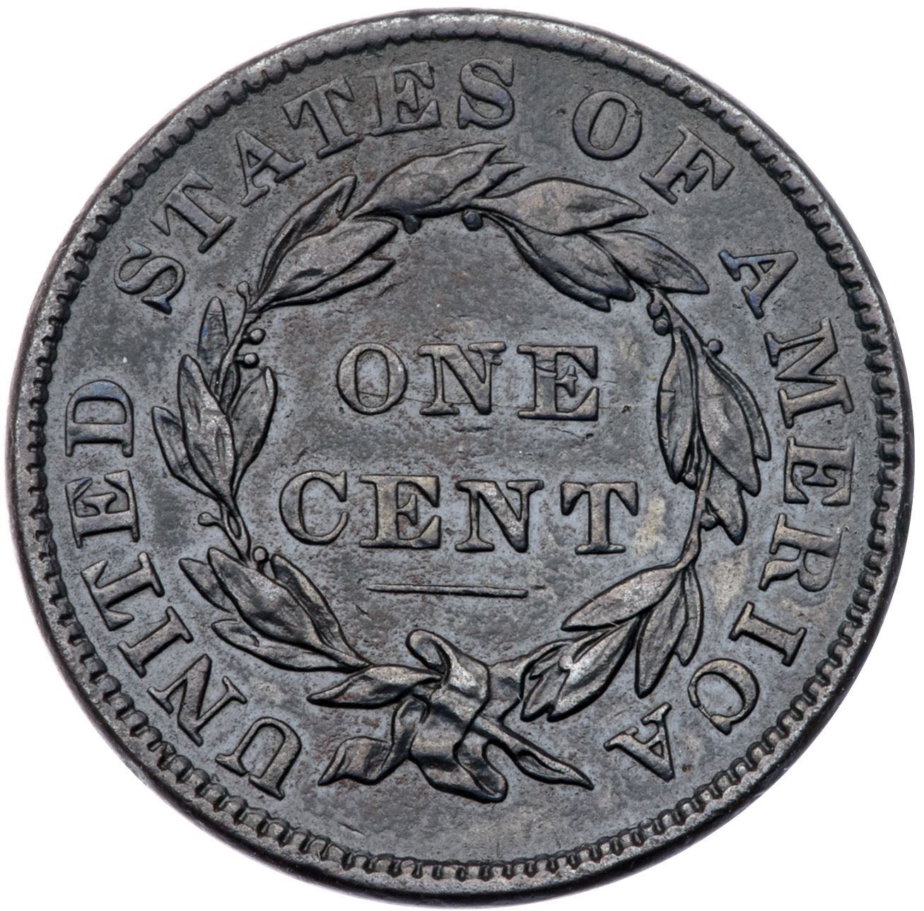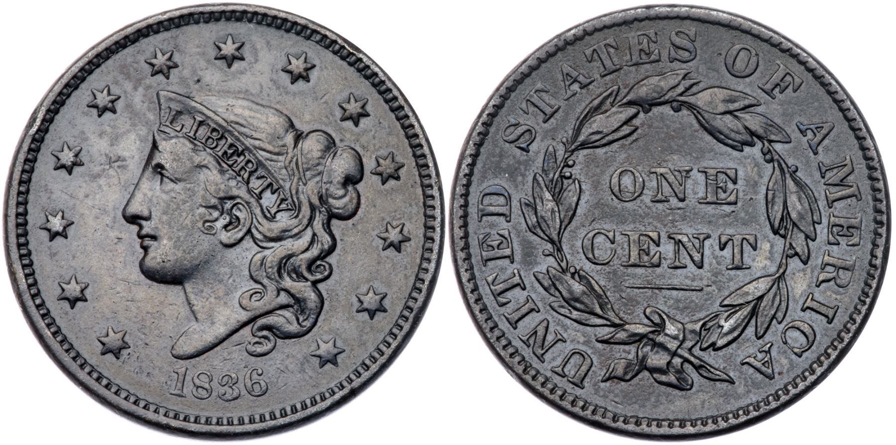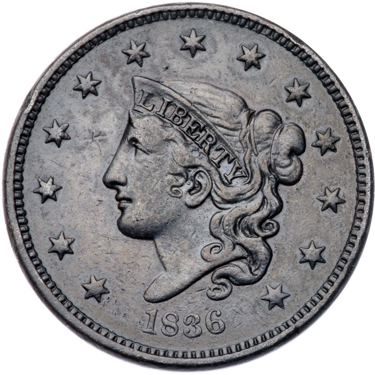 1836 N-2 R2 VF20Significantly sharper but covered with very fine roughness. The obverse is glossy, the reverse dull, and the toning is dark olive brown and steel. E-MDS, die state c, with die cracks on the reverse but before the short bar forms on the right bottom of the T in CENT.Certificate Number: Pedigree: Ex Dean Johnson 1976-Fred H. Borcherdt Collection