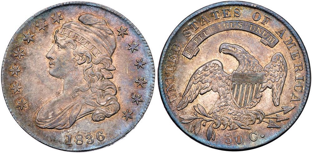 1836 Overton-114 R2 PCGS MS62Lustrous light silvery gray with delicate overtones of light bluish steel on the obverse and champagne on the reverse. Close to mint state with excellent eye appeal. A hairline scratch near the dentils over star 8 is the only notable defect. The fieldsCertificate Number: 56073648Pedigree: Ex George Ramont 1/7/1981-Fred H. Borcherdt Collection