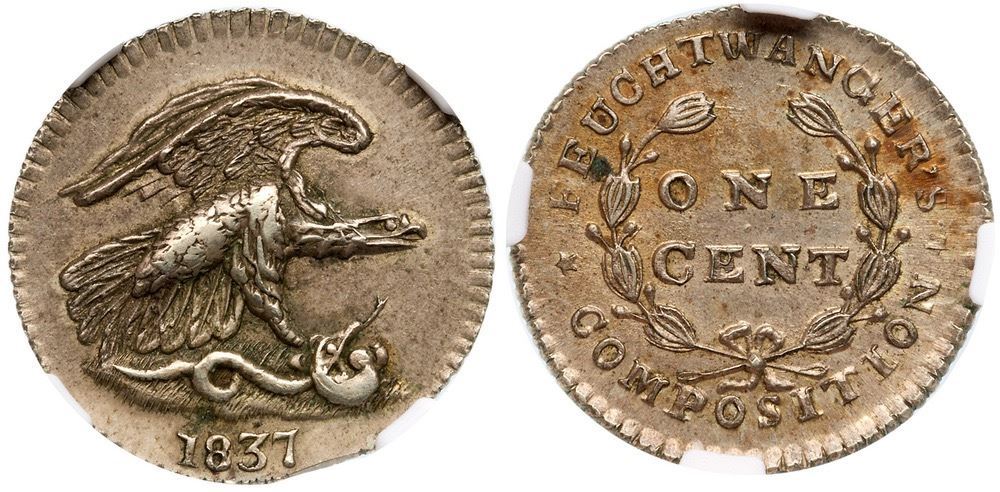 The famous Feuchtwanger Cent. Frosty silver and light gray. There is light friction on the highpoints of the eagle and the only mark is a spot of very fine carbon under the E in FEUCHTWANGER'S. A minor planchet clip affects the dentils right of the date (as struck). The attribution is noted on the NGC label. ALL PROCEEDS TO EAC. 4659374-073 Ex Colonel Steven K. Ellsworth