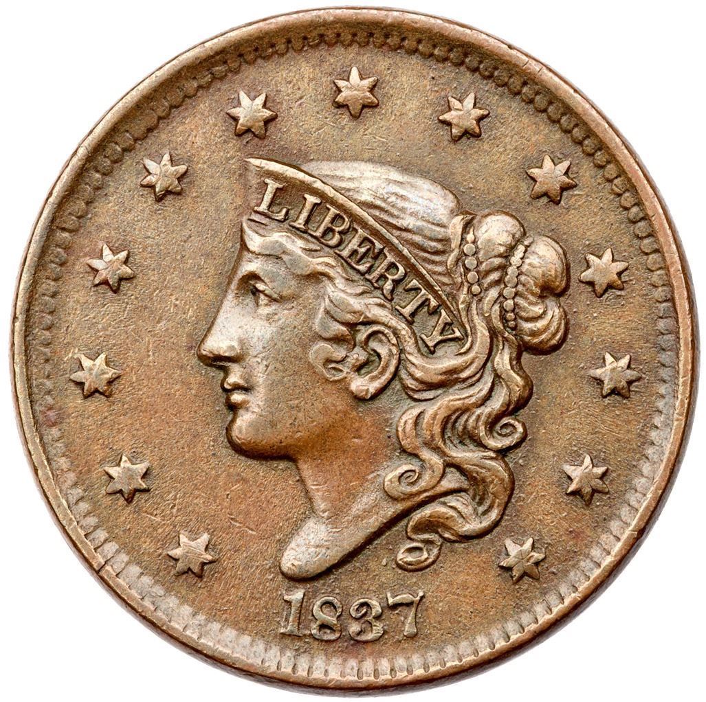 Glossy medium brown. No defects, just lightly worn. E-MDS. The repunching left of the upright of the 1 is clear.