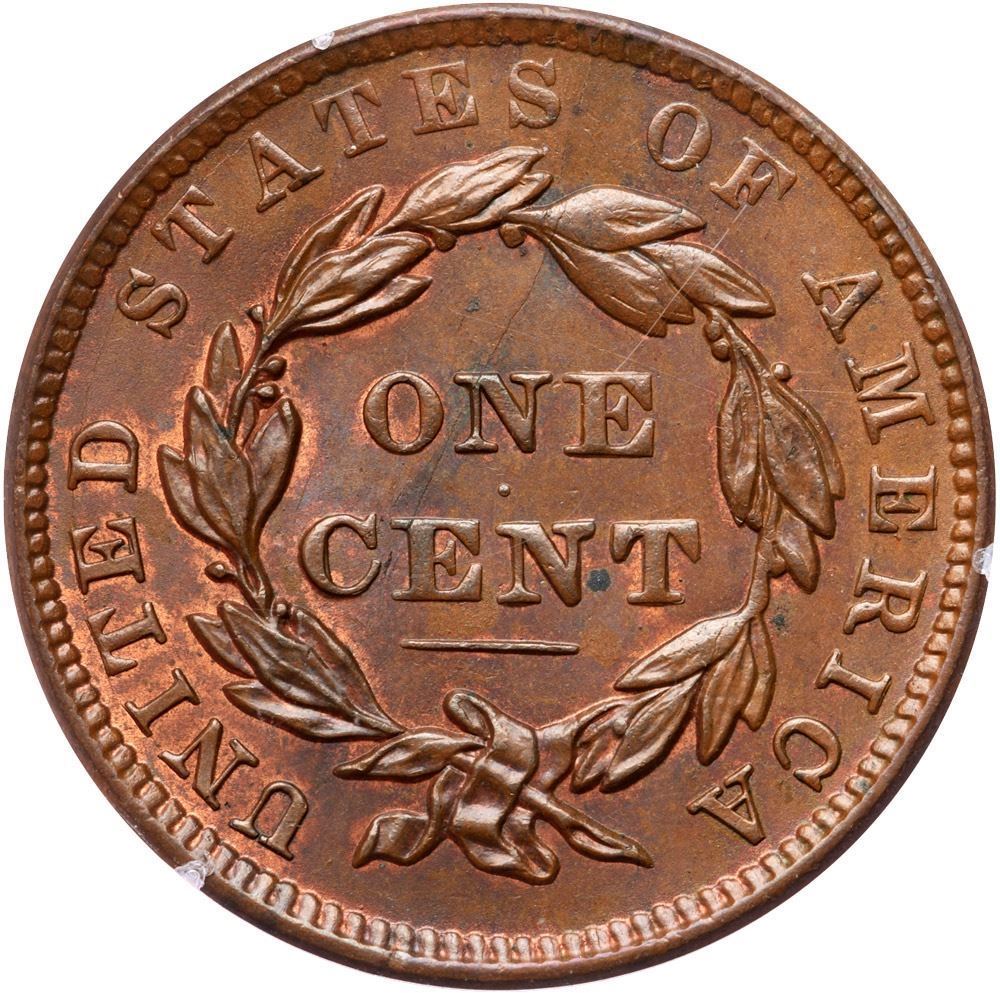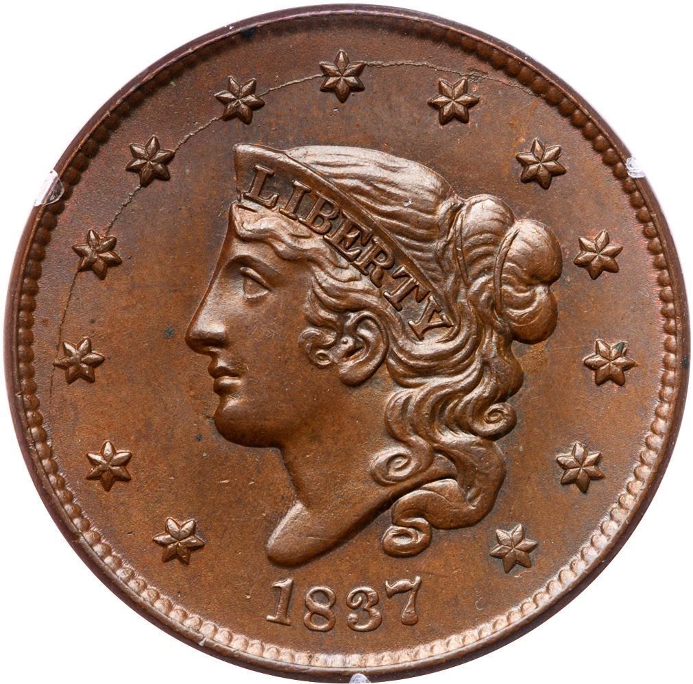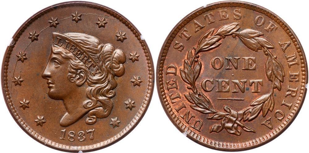Lustrous medium brown with peeps of mint red on the obverse and at least 5% of the reverse showing mint color. Satiny mint frost covers this cent and the eye appeal is outstanding. Just a few minor marks including a tiny planchet flake at the top of star 8 (as struck), and a carbon spot between the N & T in CENT. There is a streak of darker steel brown toning through the N in ONE that contains a very faint planchet lamination (looks like a hairline die crack). A very nice example of this "Redbook" variety, the only 1837 with a Plain Hair Cord and Small Letters. Our grade is MS62+. Housed in a small OGH "rattler" slab.