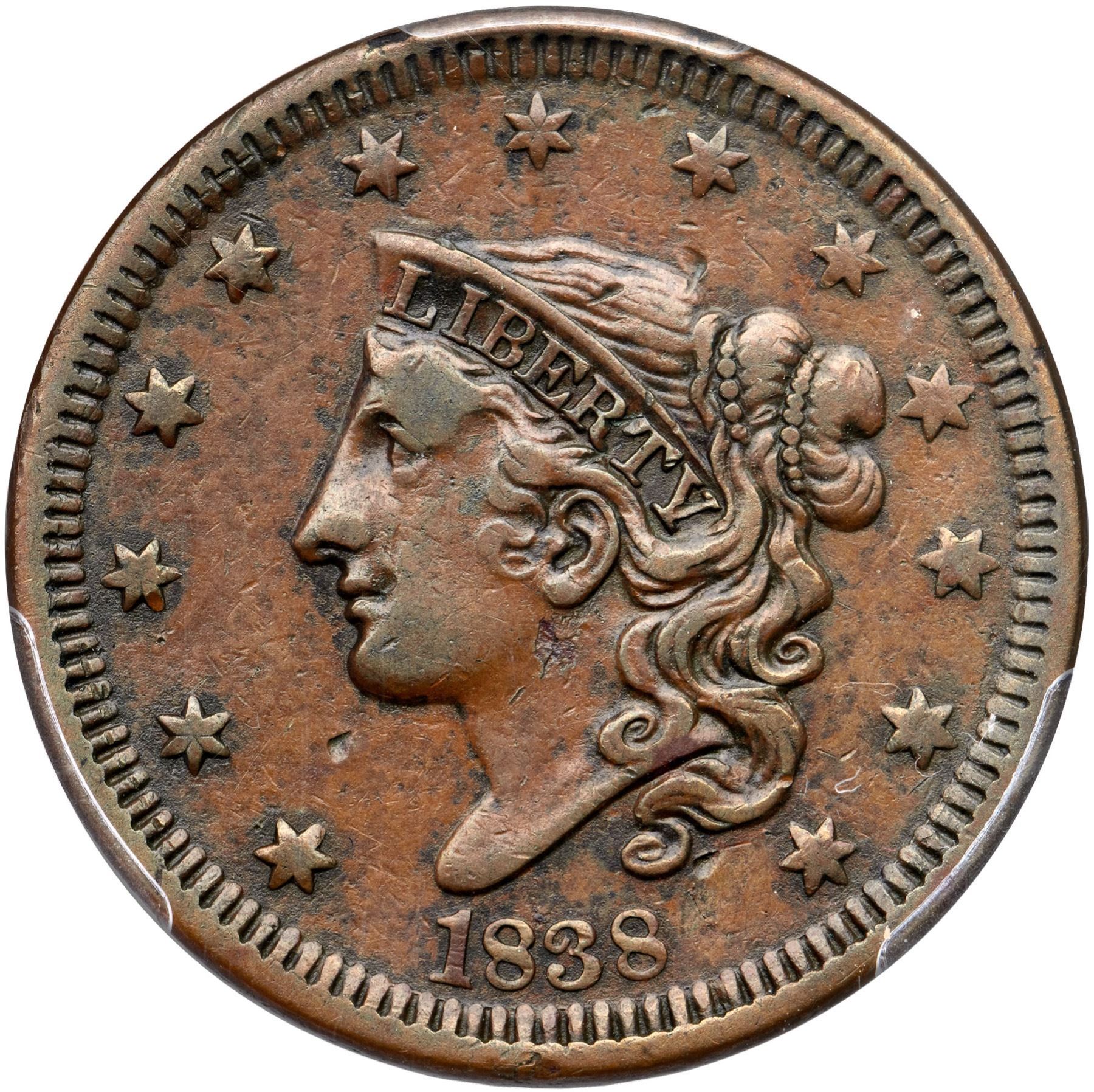 Glossy light to medium brown with darker chocolate brown toning in protected areas. The surfaces are smooth but there are a few contact marks including a nick or chip midway between star 1 and the chin, a nick at the hair below star 8, and a vertical nick just right of the nostril. Only the first mark catches your eye. MDS, the usual die state for this rare variety. The obverse die is new and sharp while the reverse die is old and worn out. The contrast is obvious, and that feature helps identify the variety. Graded VF25 net F15 and tied for CC#7 in the Noyes census. Our grade is VF20. The attribution and COL Ellsworth Collection provenance are noted on the PCGS Gold Shield label.