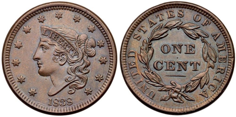 Beautiful lustrous light bluish steel. Satiny with outstanding eye appeal. The only marks are a small rim nick at the E in AMERICA, several more at that CA, and a few more under the end of the wreath stem. Otherwise this cent is a gem. E-MDS, Grellman state c, with a fine crack from the dentils past the left point of star 9 to the bun below. Removed from a PCGS holder graded MS65BN (PCGS label #1741.65/49144329 included).