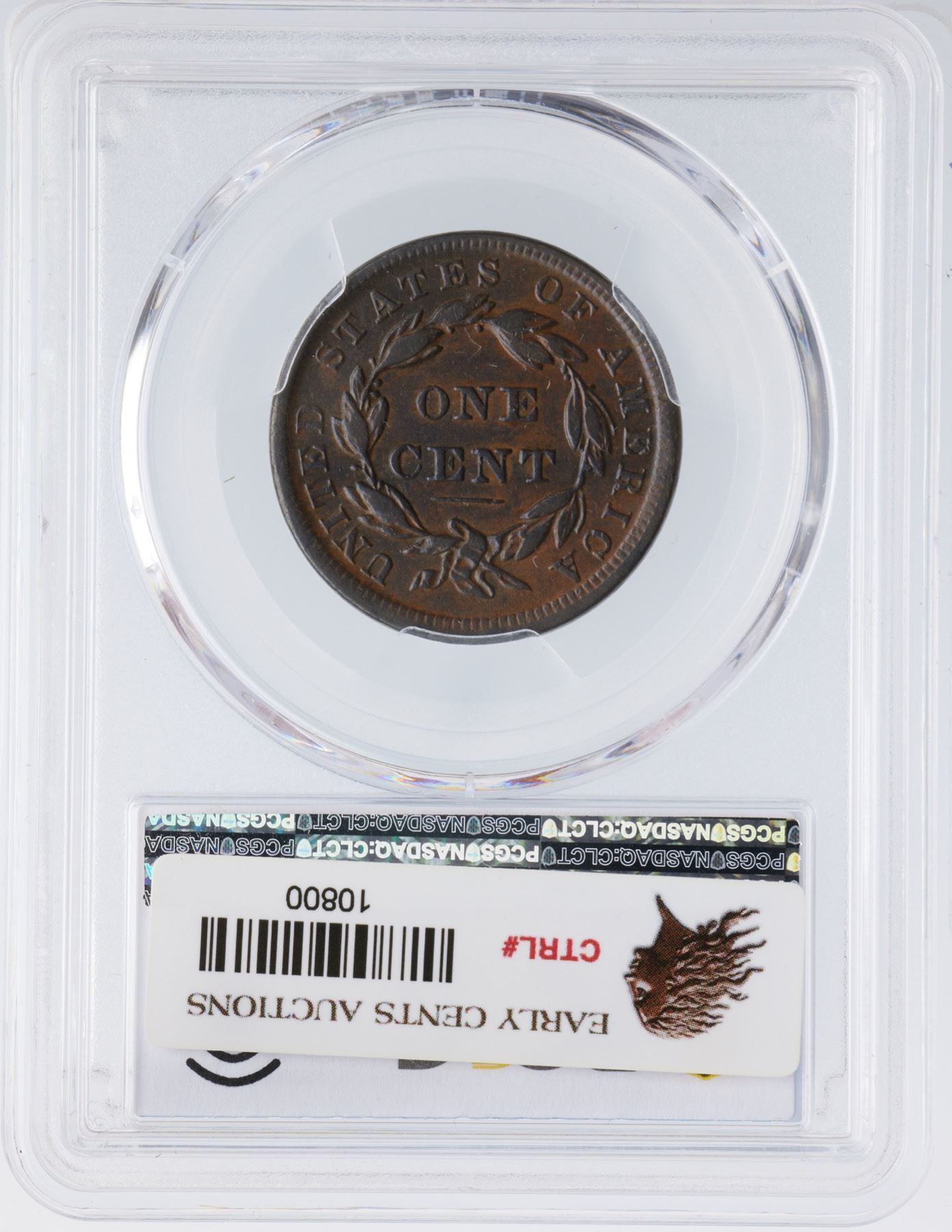 Glossy dark steel brown and olive with lighter brown toning in protected areas on both sides. The surfaces are smooth and the only notable marks are a nick on the throat and a thin planchet fissure below the date (looks like a fine die crack but it is not). MDS with a very light die crack (looks more like a wave in the field) from the dentils through star 4 to the nose. The date is bold and the overdate feature is sharp. Graded F12 by Noyes, his photo #31874. Our grade is F15+, close to VF20. A decent example of this very popular "Redbook" variety. The attribution and COL Ellsworth Collection provenance are noted on the PCGS Gold Shield label.