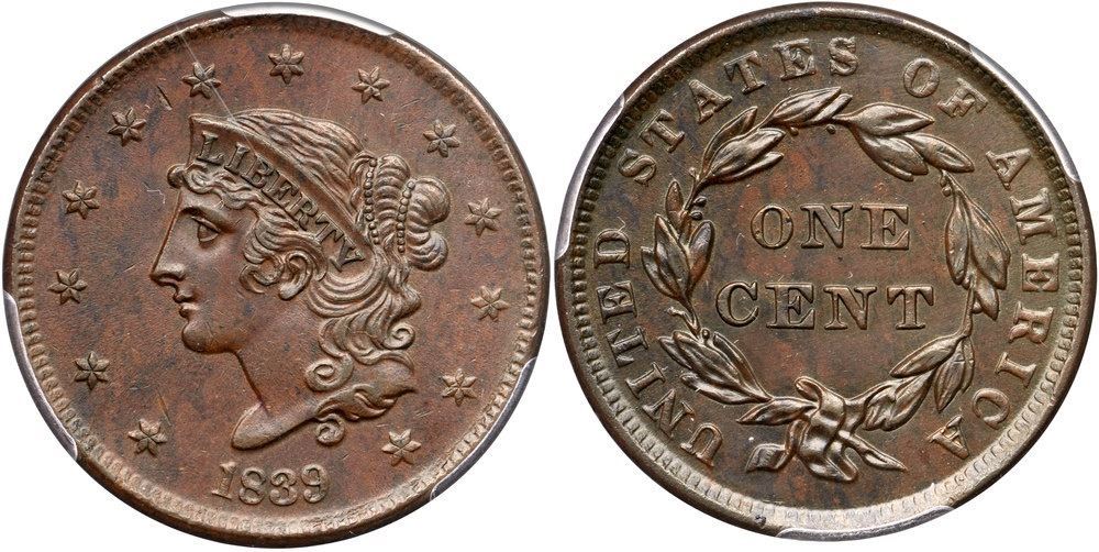 Frosty medium brown and chocolate. Mint luster covers the fields and this cent has very nice eye appeal. The only notable mark is a diagonal nick off the tip of the coronet and another above star 1. Otherwise free of notable marks. Looks mint state but there is a trace of rub on the highest points of the devices. MDS. The fields are lightly flowlined. The earlier fine die lines around ONE CENT and the tiny rust lumps on the reverse are all gone. Our grade is AU58. The attribution and COL Ellsworth Collection provenance are noted on the PCGS Gold Shield label.