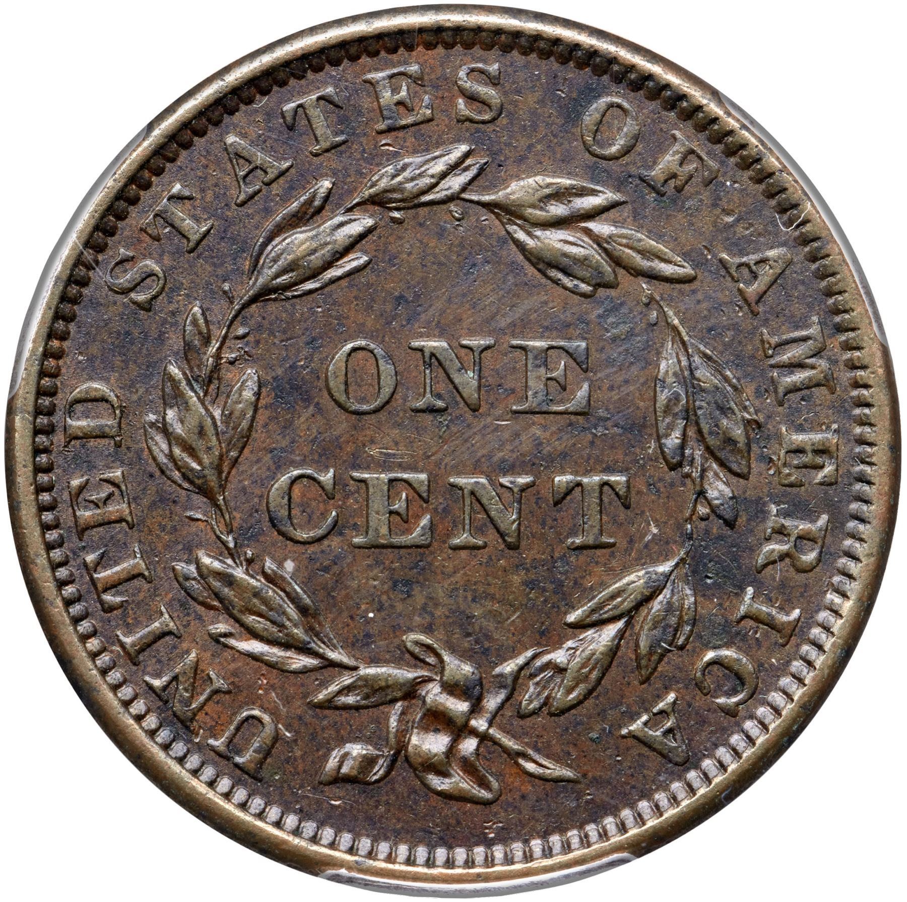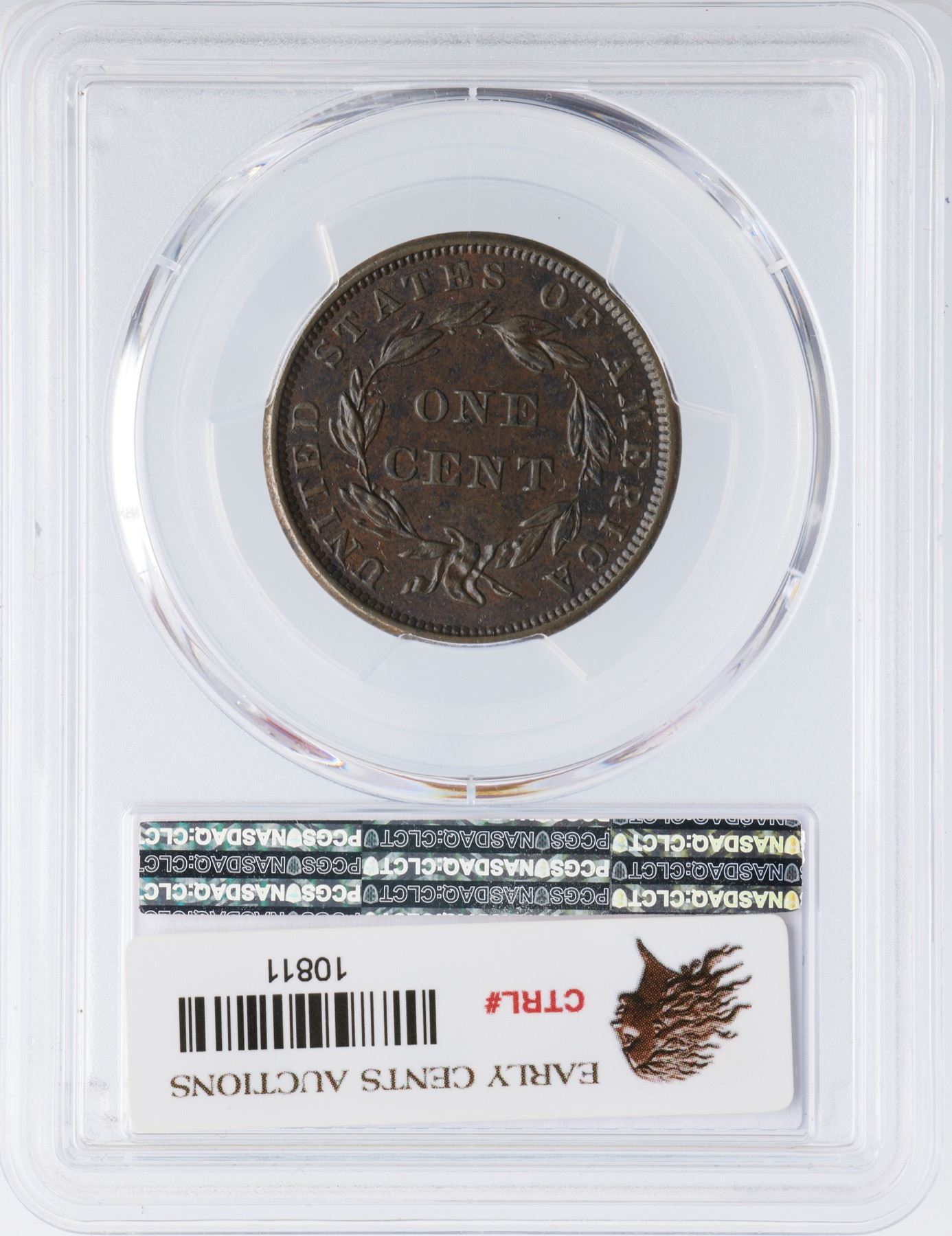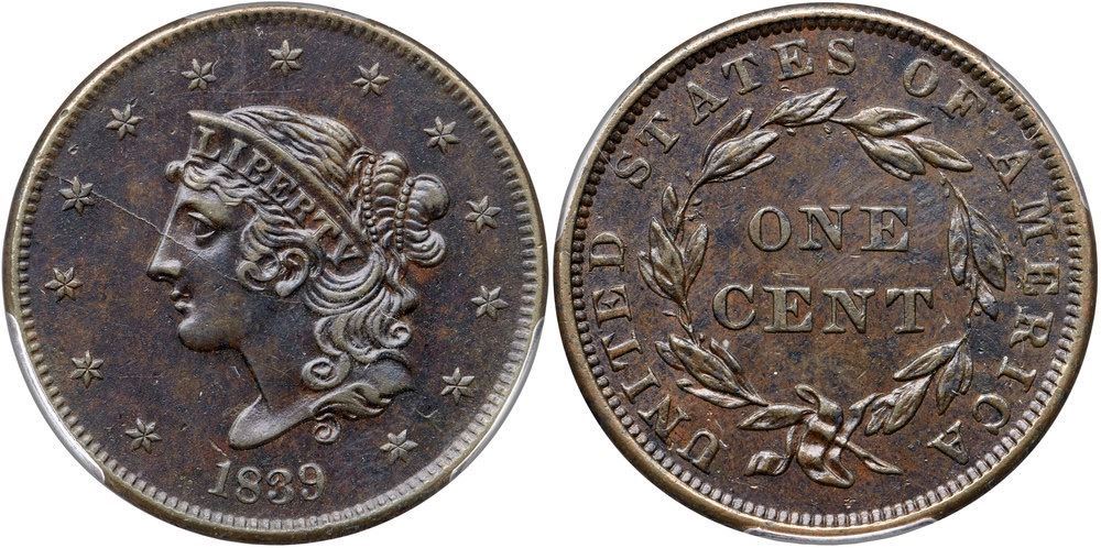 Glossy dark olive and steel mixed with medium brown, especially on the reverse. The surfaces look perfectly smooth but a glass reveals traces of extremely fine microscopic roughness hidden under the glossy toning. No verdigris, and the only marks are trivial ticks here and there. The only notable mark is a thin diagonal nick in the field at the bust tip. MDS with a strong die crack from the dentils through star 4 to the nose fading out at it reaches the curl behind the neck. Called EF40 and CC#4 in the Noyes census, his photo #20848. Bland says EF45 and CC#4. Our grade is EF40. A solid condition census example of this rare variety, and it comes with a great provenance. The attribution and COL Ellsworth Collection provenance are noted on the PCGS Gold Shield label.