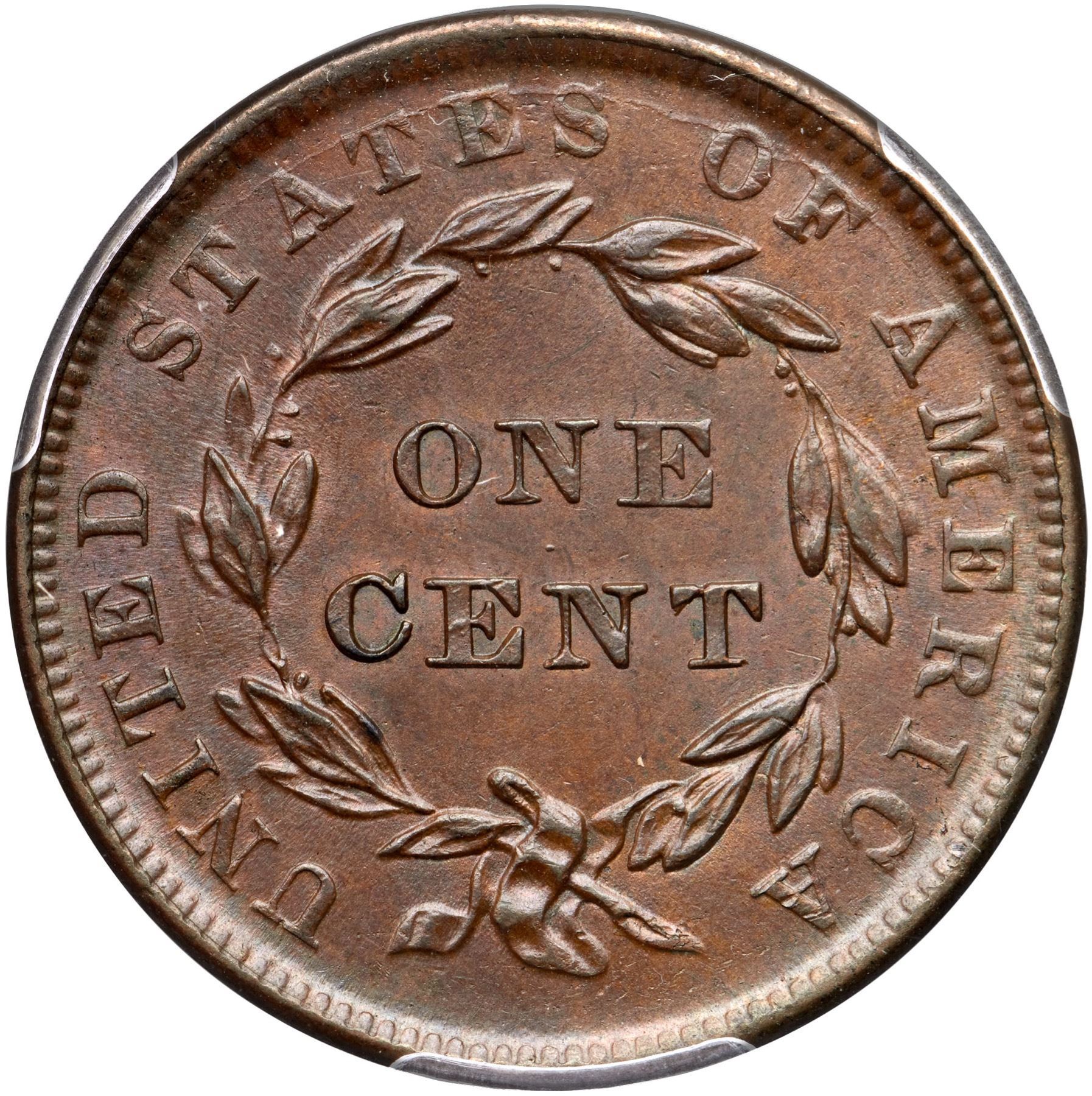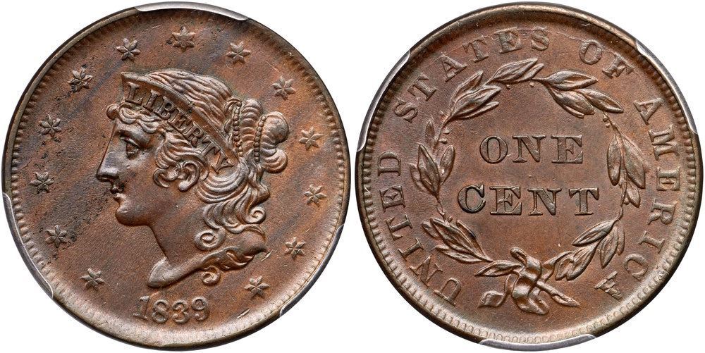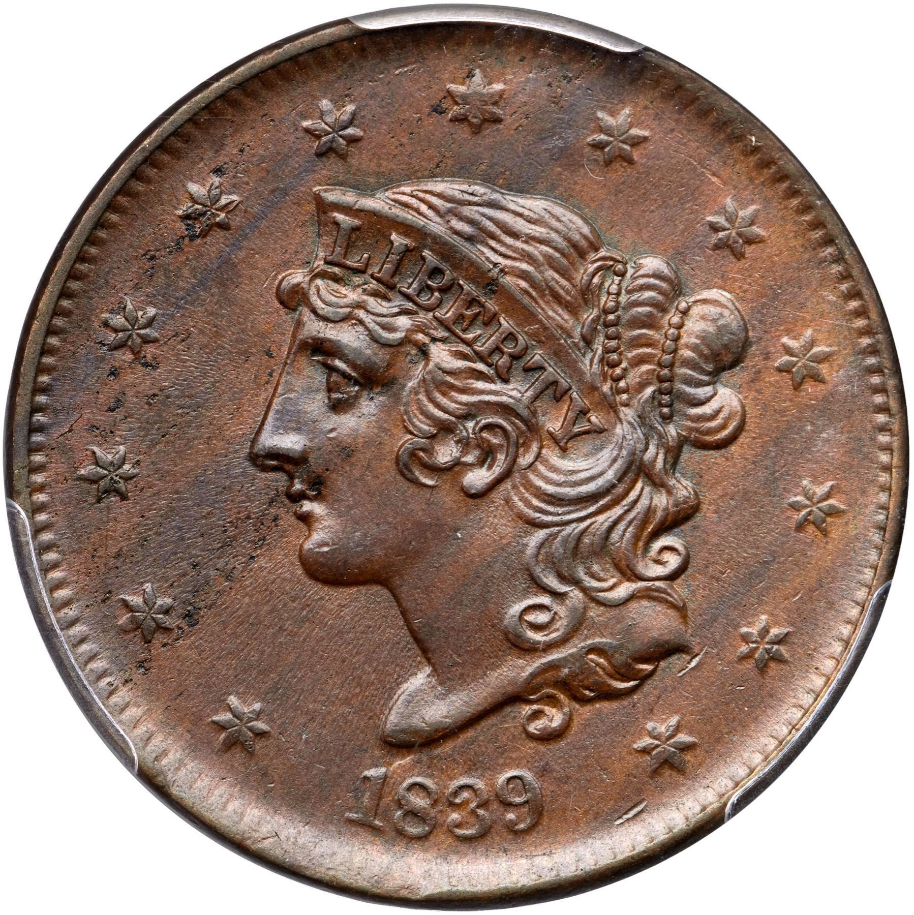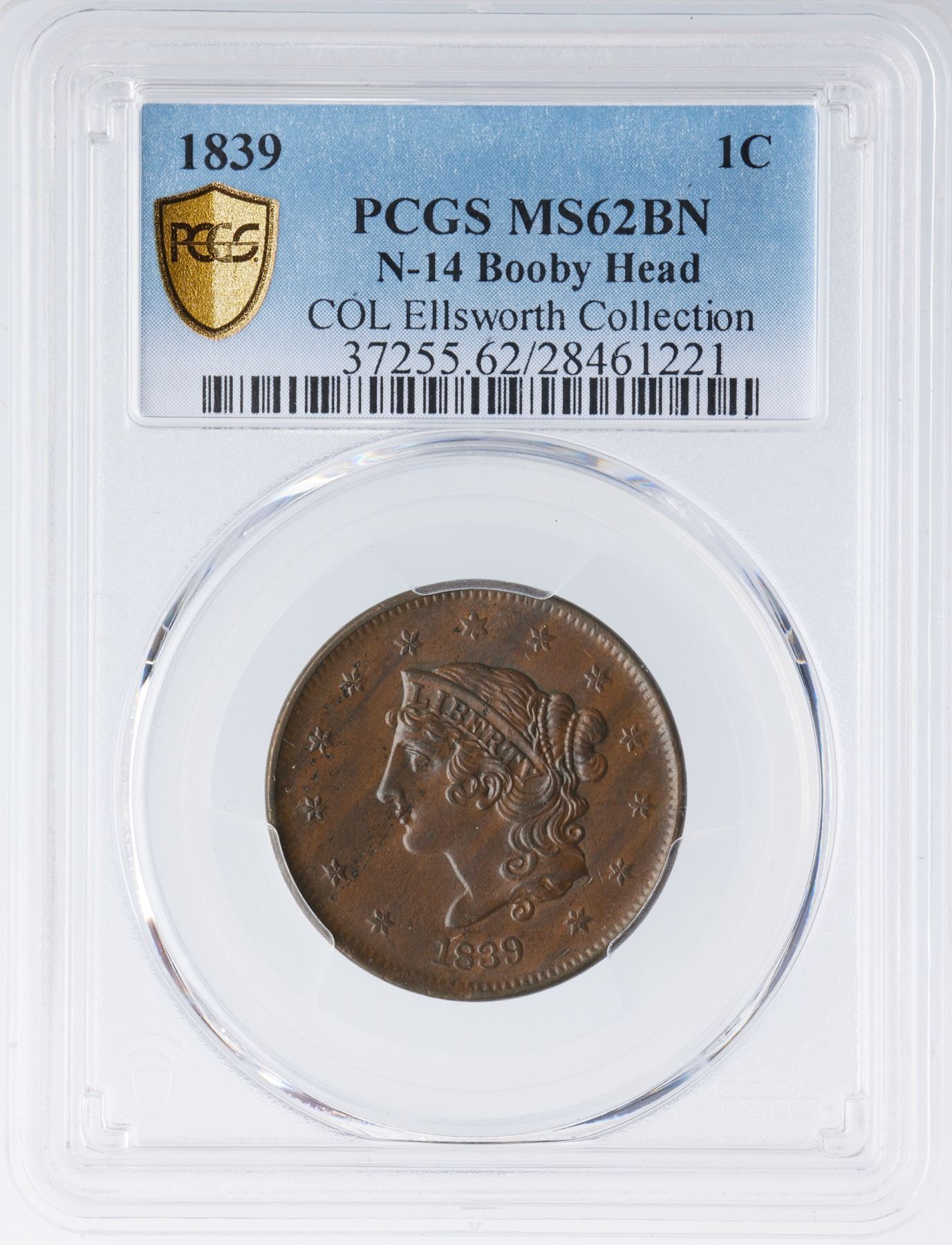 Frosty light steel brown woodgrained with darker chocolate brown on the obverse. Hints of very faded mint color show in protected areas on the reverse. The surfaces are lustrous and the only marks are some microscopic planchet chips from star 2 through the lips to over the E in LIBERTY and some more at stars 3-5 (all as struck). LDS with a cracked reverse. The bar from the dentils over the R in AMERICA is gone. Our grade is AU58. The attribution and COL Ellsworth Collection provenance are noted on the PCGS Gold Shield label.