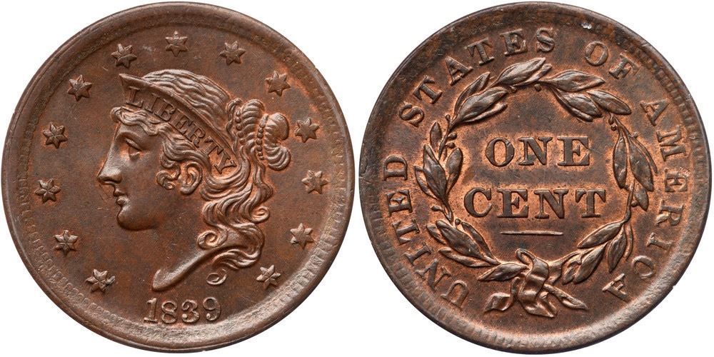 Very attractive lustrous light olive and steel brown with 5% of the obverse and 20% of the reverse showing mint red. Smooth and satiny, essentially flawless except for a rather obvious nick at the tip of the nose. Later die state. The dashes at either side of the bottom of the 9 are gone but the clashmark over the N in CENT is still clear. Our grade is MS62. Housed in a small OGH "rattler" slab.