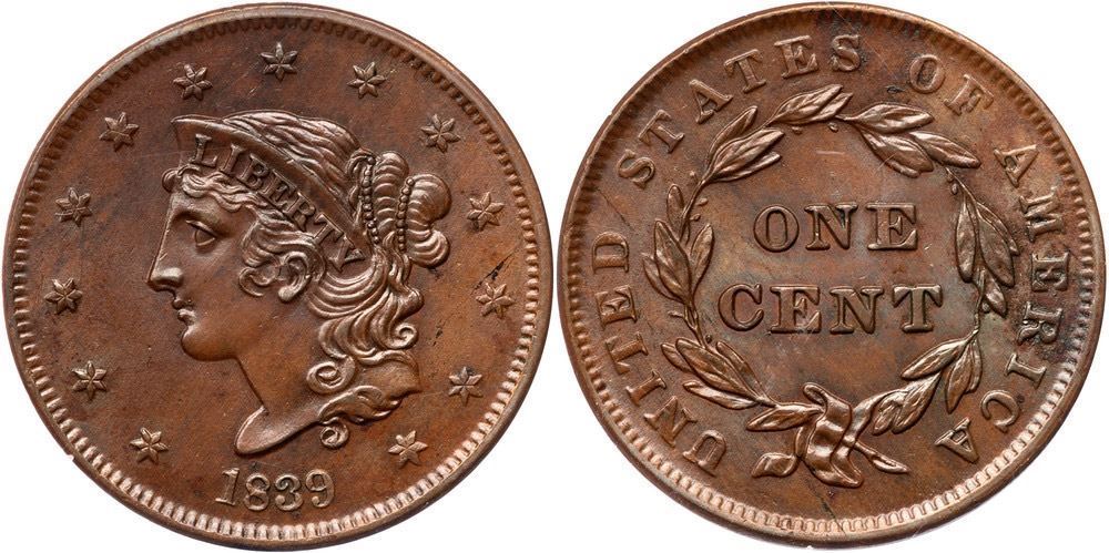 Lustrous light to medium olive and steel brown. Satiny and choice except for a stain at MER, and there are specks of fine verdigris mixed into the stain. MDS with fine die flowlines in the fields. Our grade is net MS60. Housed in a small OGH "rattler" slab.