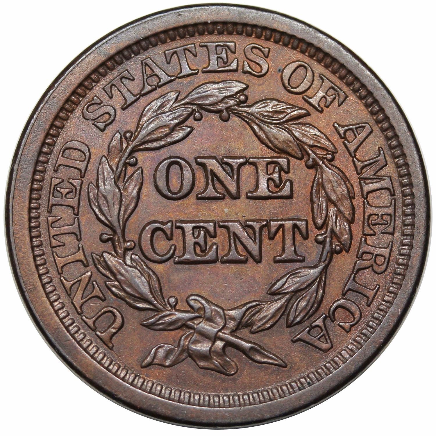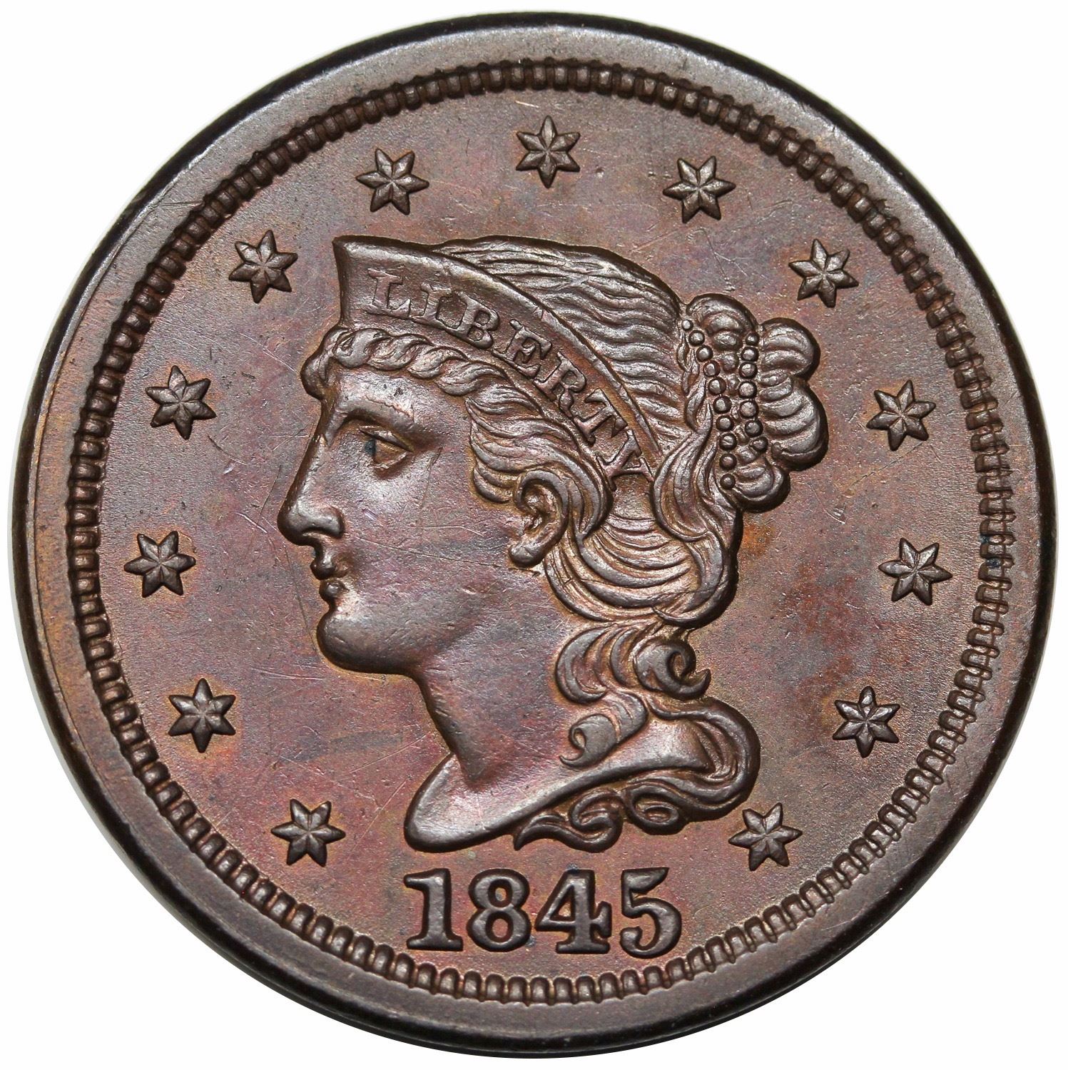 1845 Braided Hair Large Cent, N-9, R2, AU58.