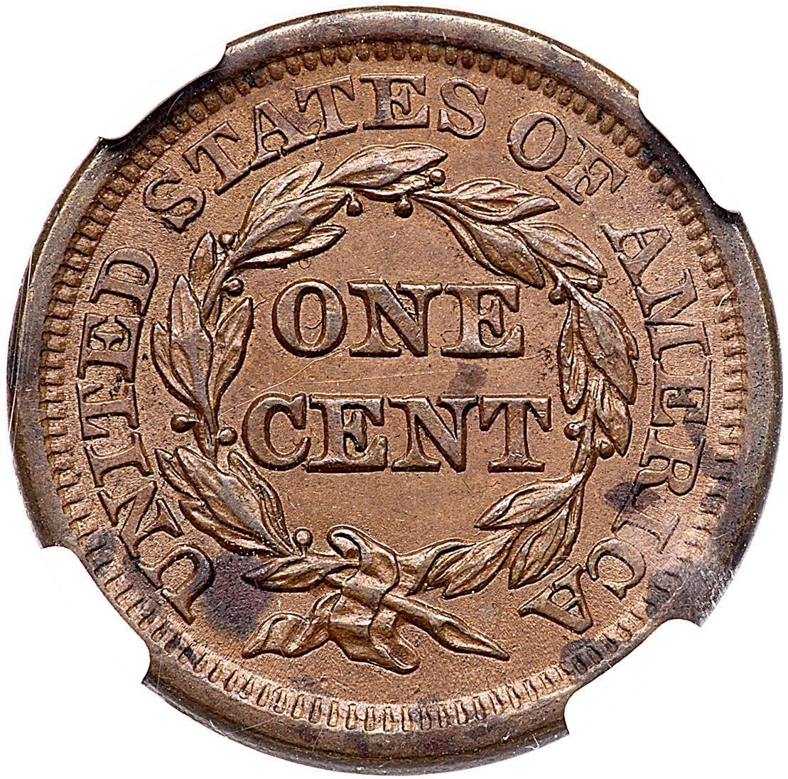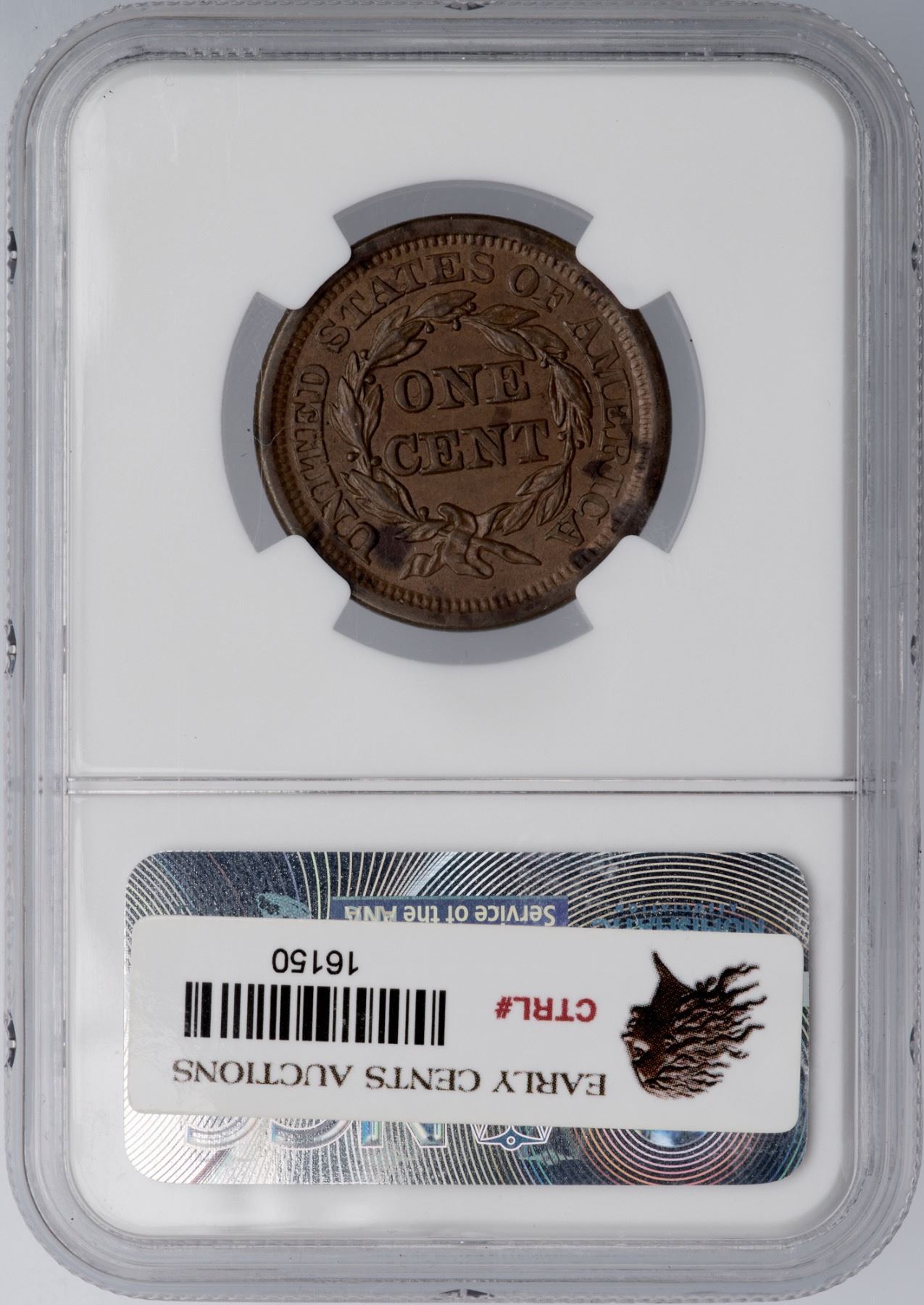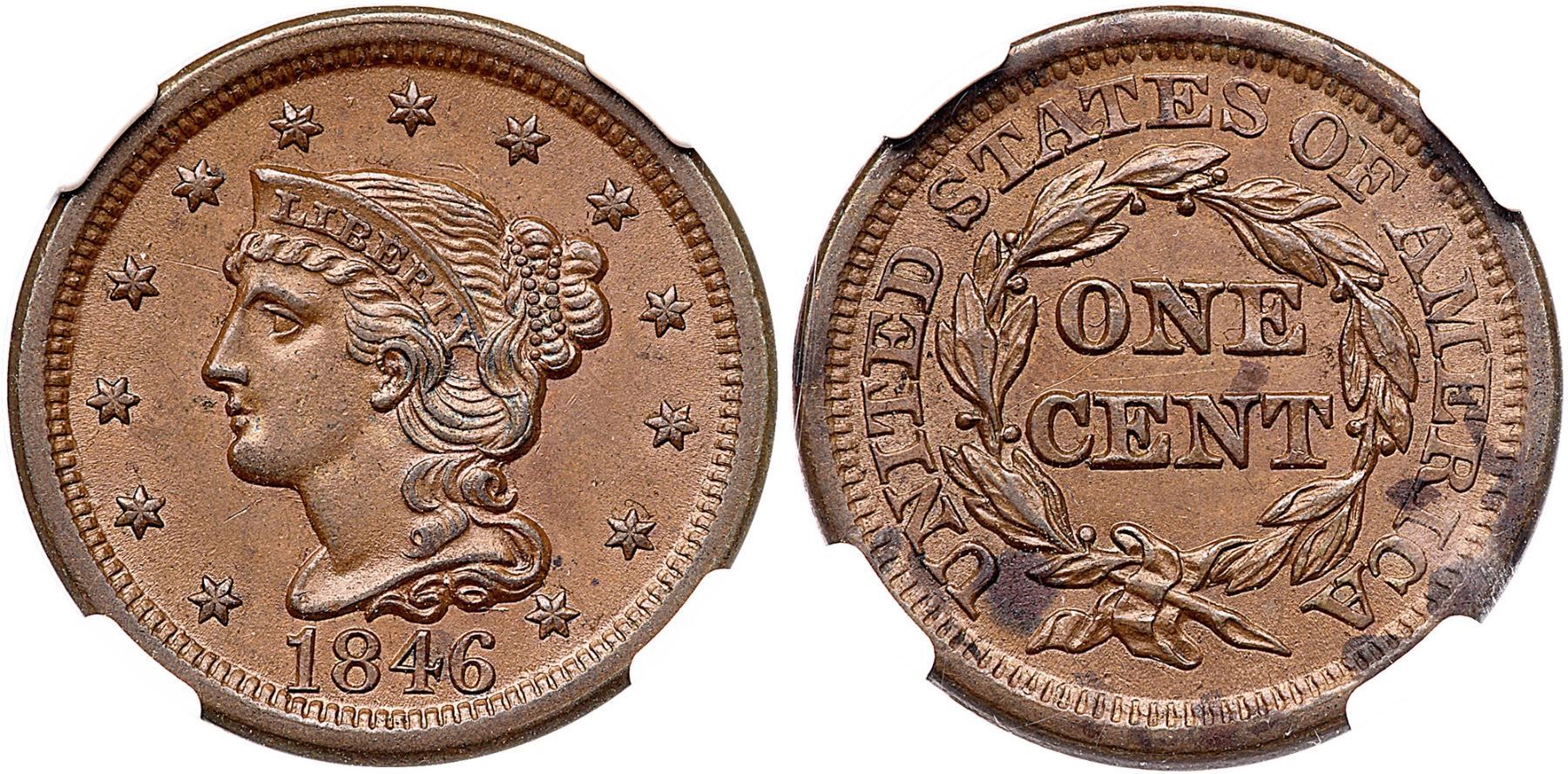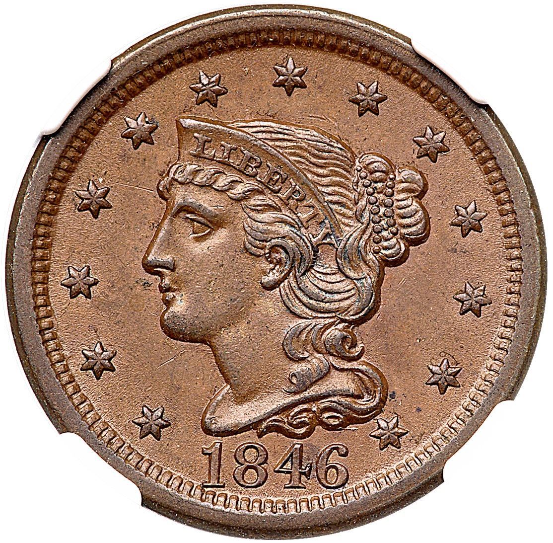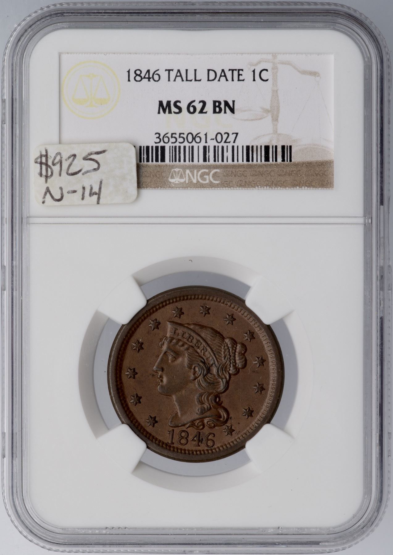 1846 N-14 R-3 Tall Date NGC MS62BNAU58 sharpness but there are dark steel and maroon spots on the central to lower reverse containing traces of carbon, and a couple of hairline scratches between ONE and CENT. Otherwise choice tan brown with frosty luster covering the surfaces. EDS. Our grade is AU50.Certificate Number: Pedigree: Ex; Phil Davis