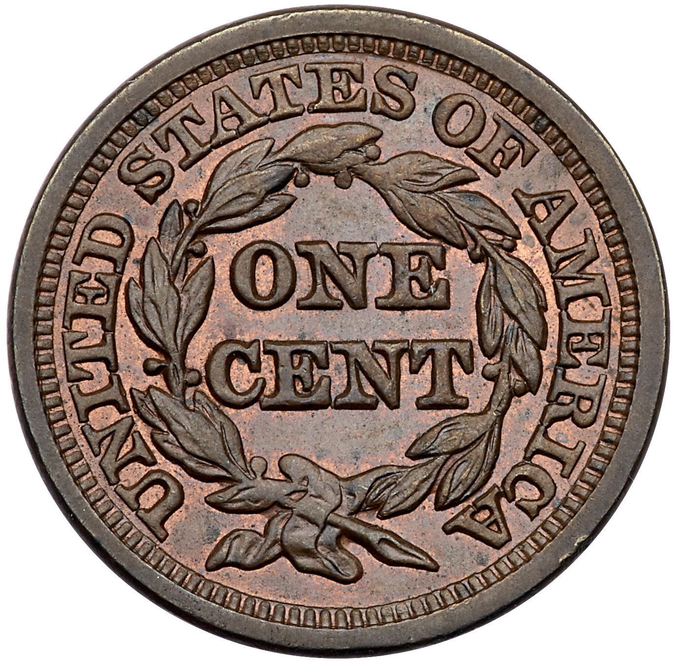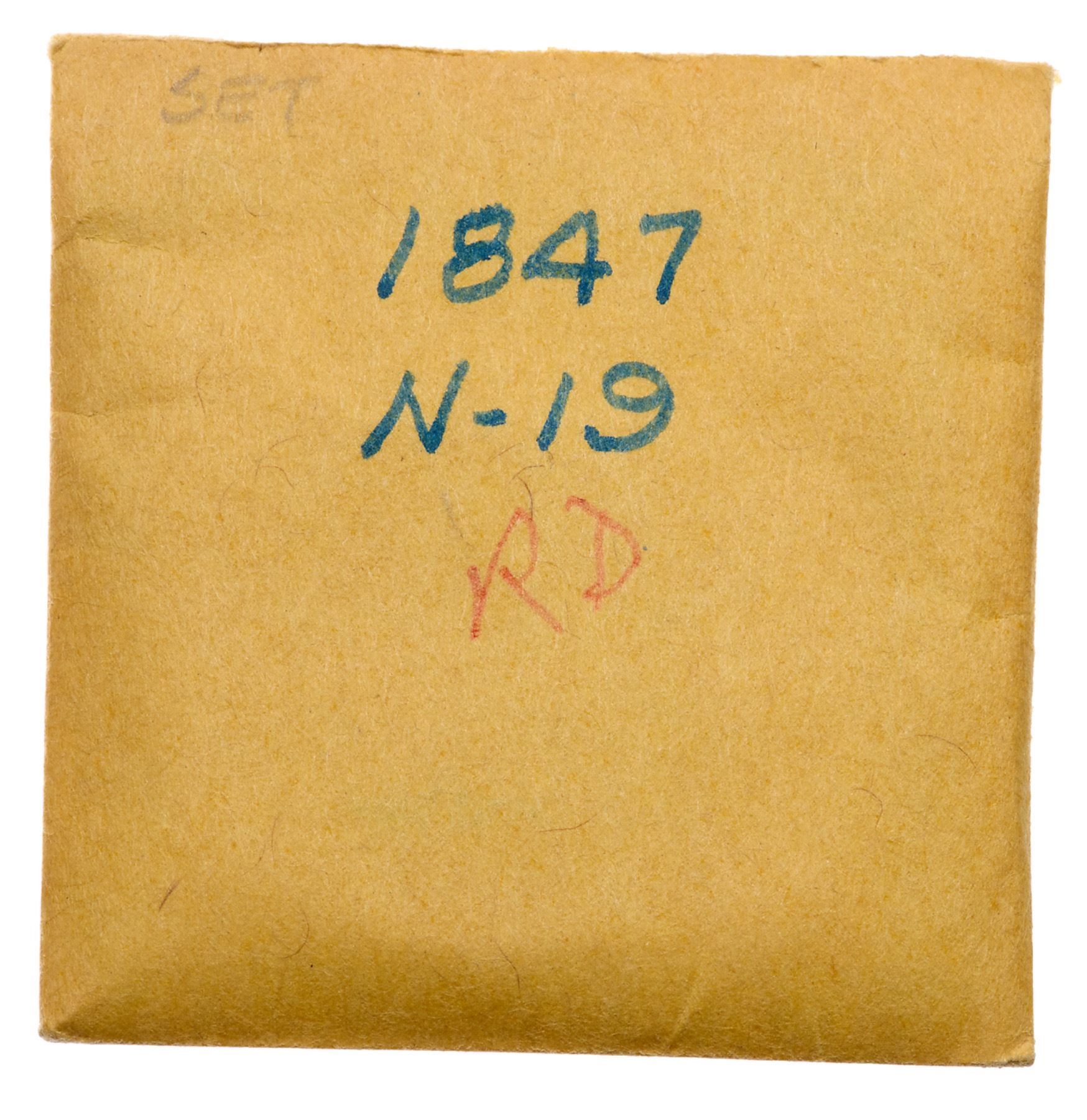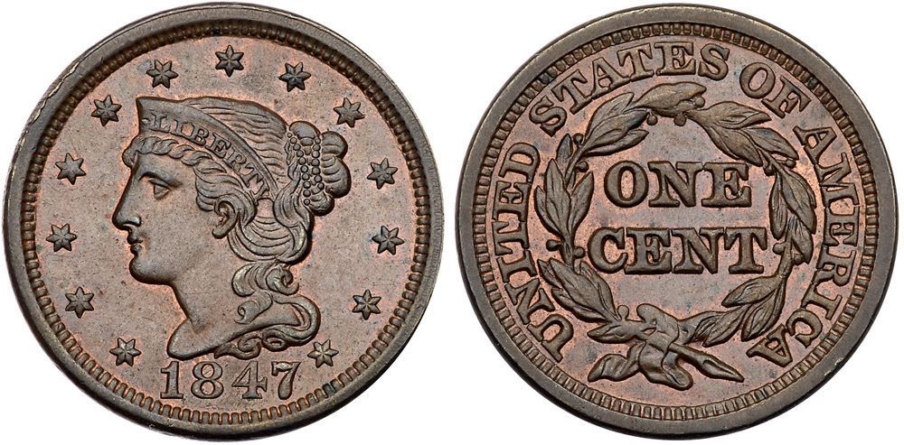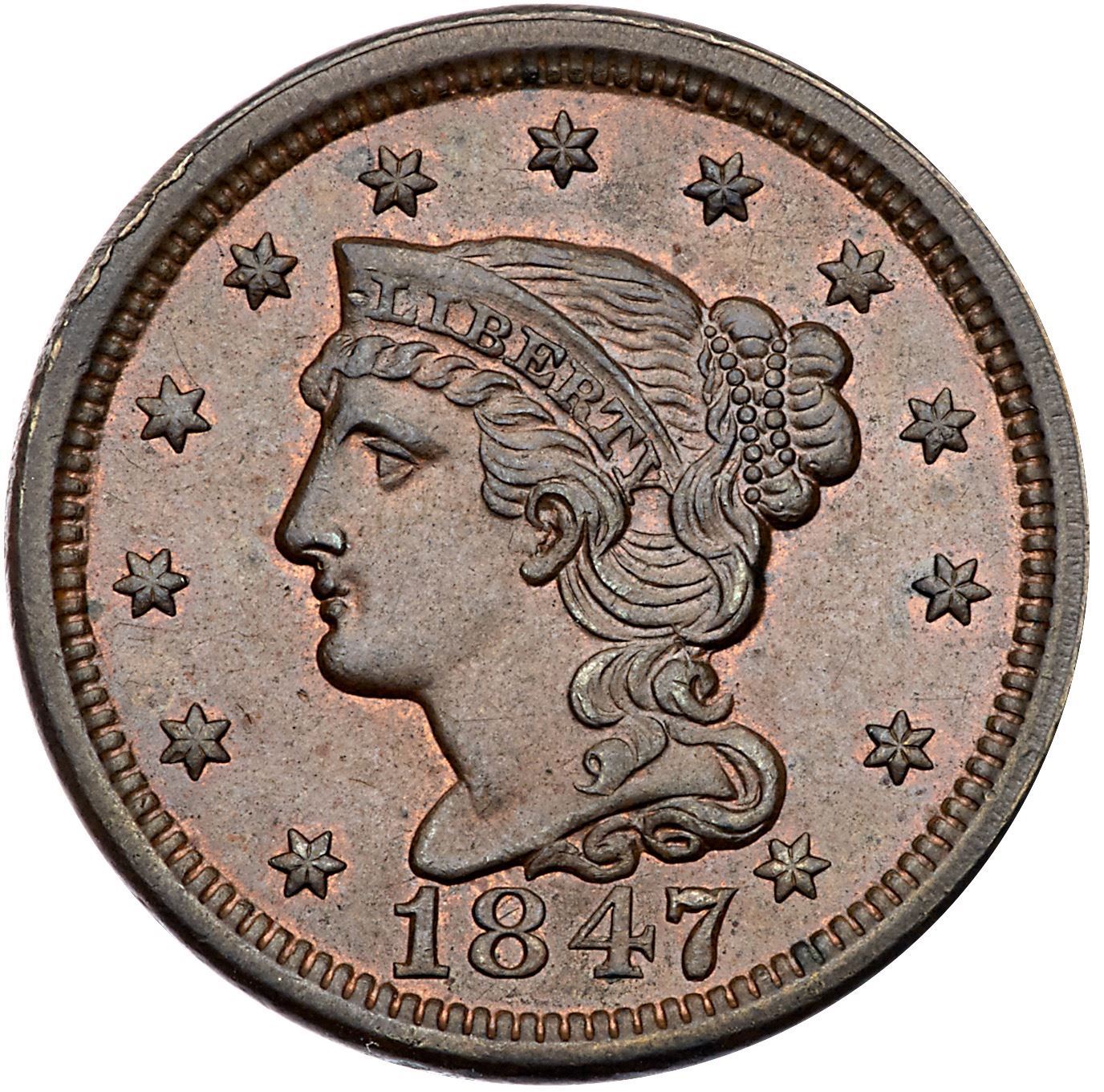 1847 N-19 R1 Repunched 84 AU55A sharp mint state cent but there are some small marks on the rim at stars 3-5. Otherwise quite nice with attractive frosty light brown and chocolate toning and 5-10% of both sides showing mint red. E-MDS, die state a, with fine repunching visible on the 4 & 8.Pedigree: Ex George Ramont-Fred H. Borcherdt Collection