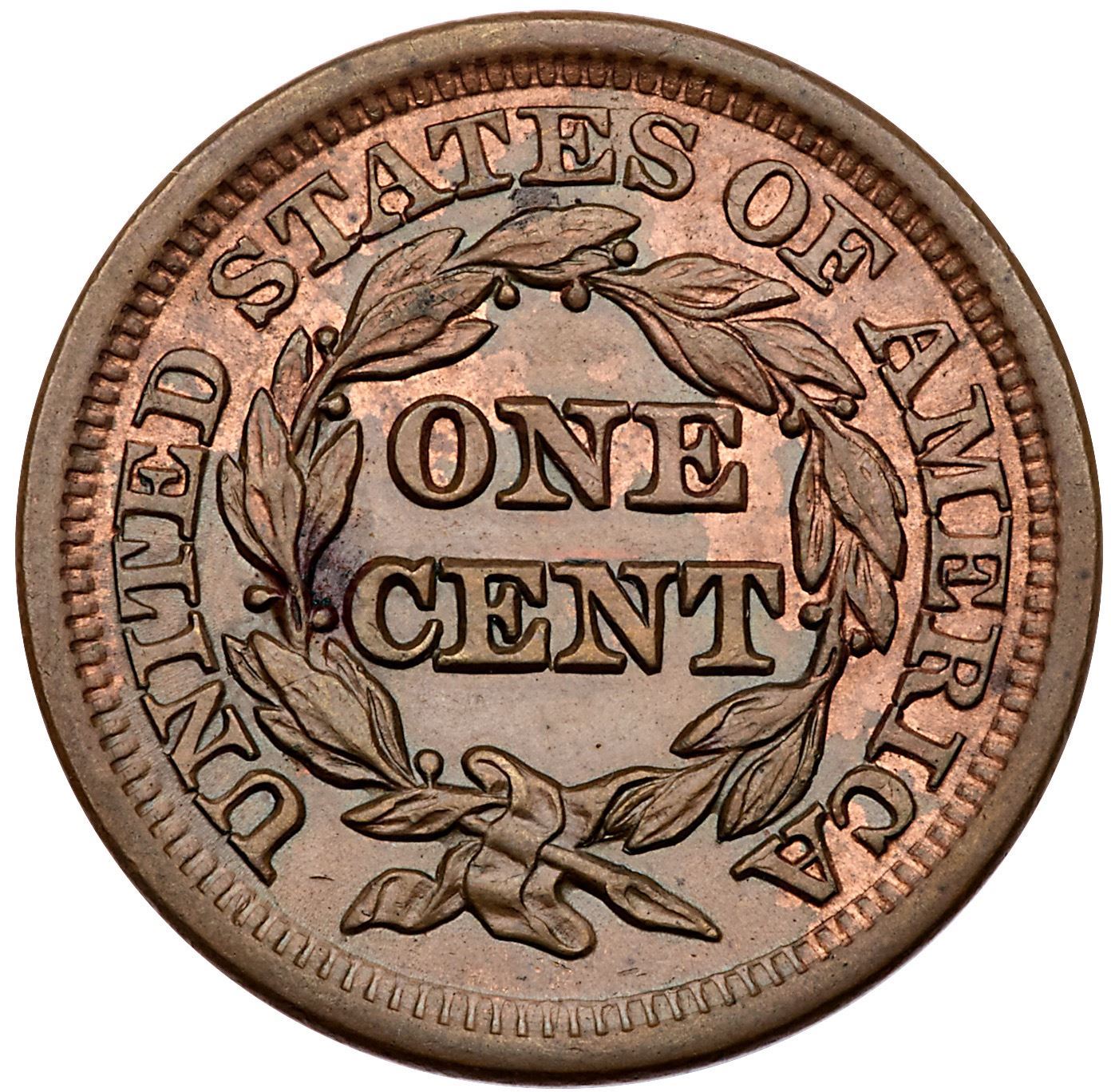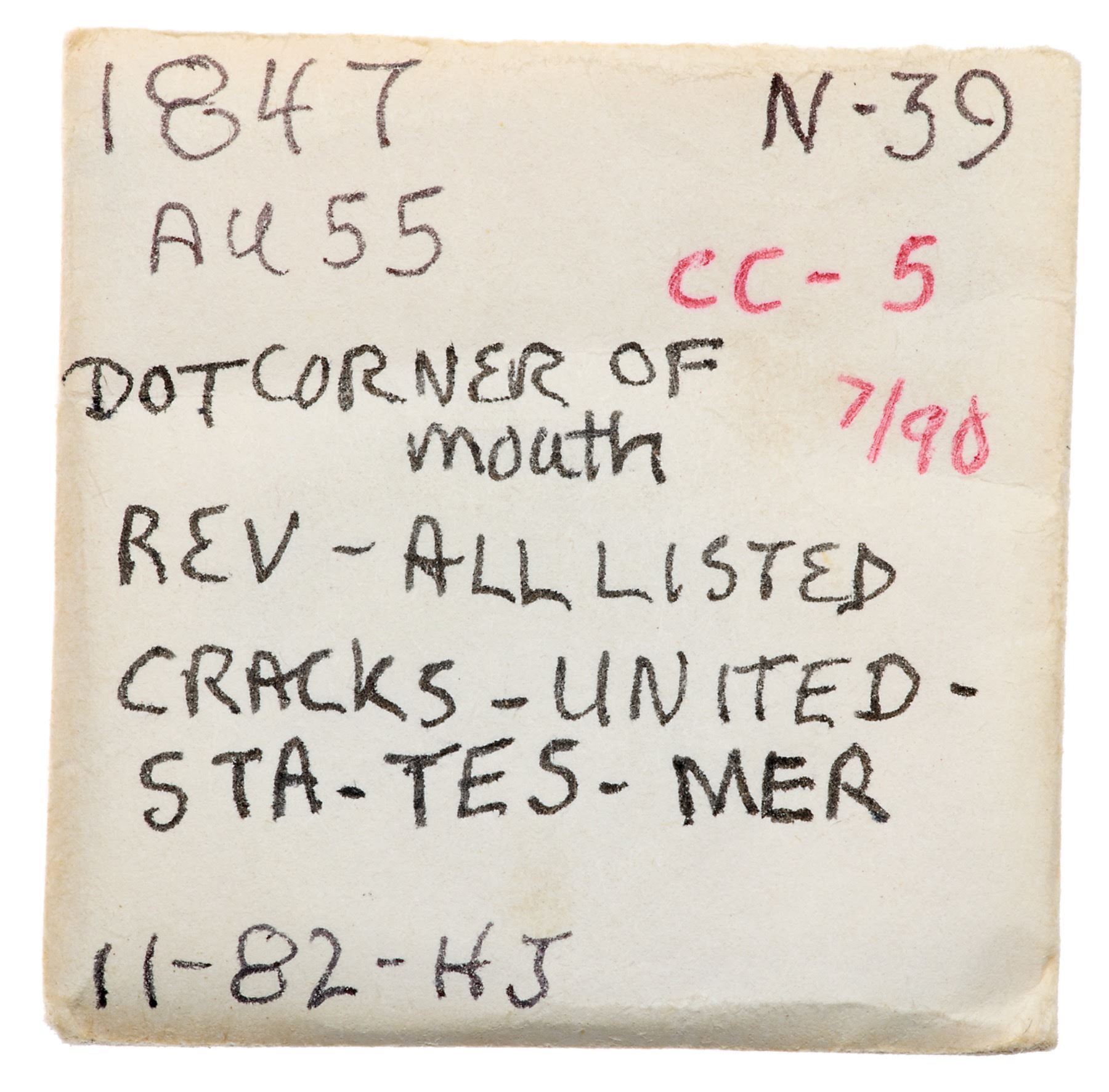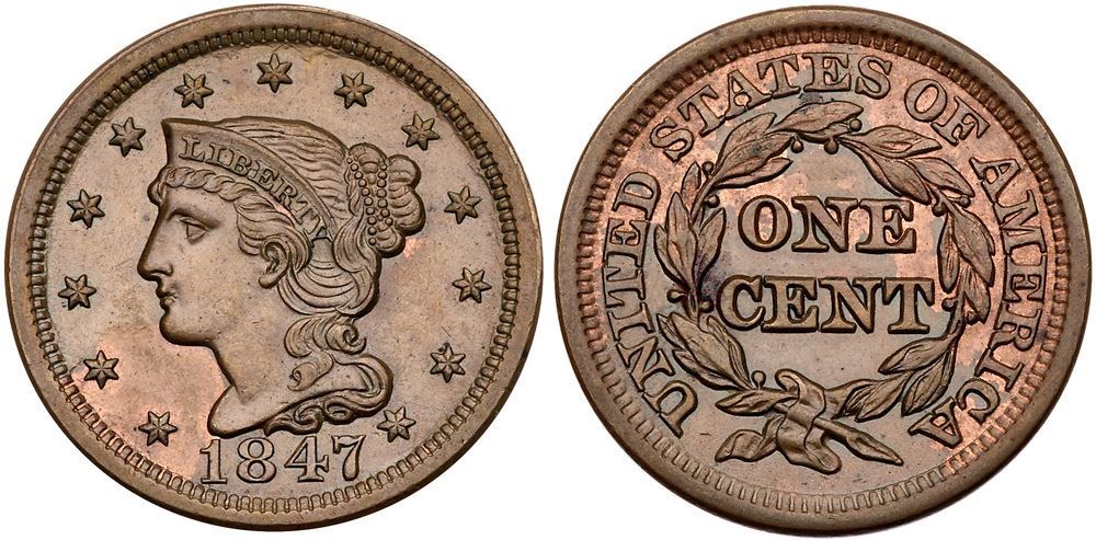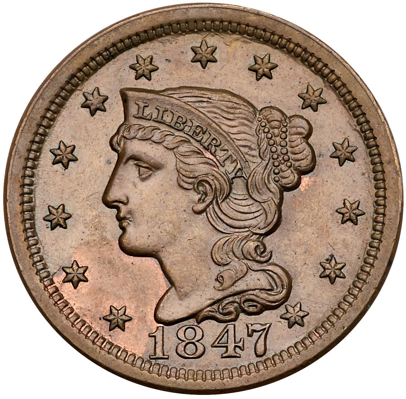 1847 N-39 R3- AU58Close to mint state but there is a small patch of microscopic reddish carbon left of the C in CENT. Frosty light chocolate and olive with 5% of the obverse and 20% of the reverse showing mellowed mint red. Sharply struck and void of contact marks. E-MDS, die state a late. The fine diagonal die line through the O in ONE is visible and the fields are lightly flowlined.Pedigree: Ex Hance Jaquett 11/1982-Fred H. Borcherdt Collection