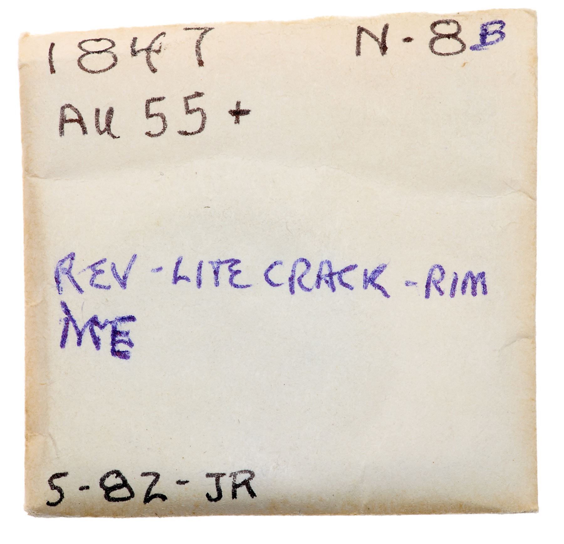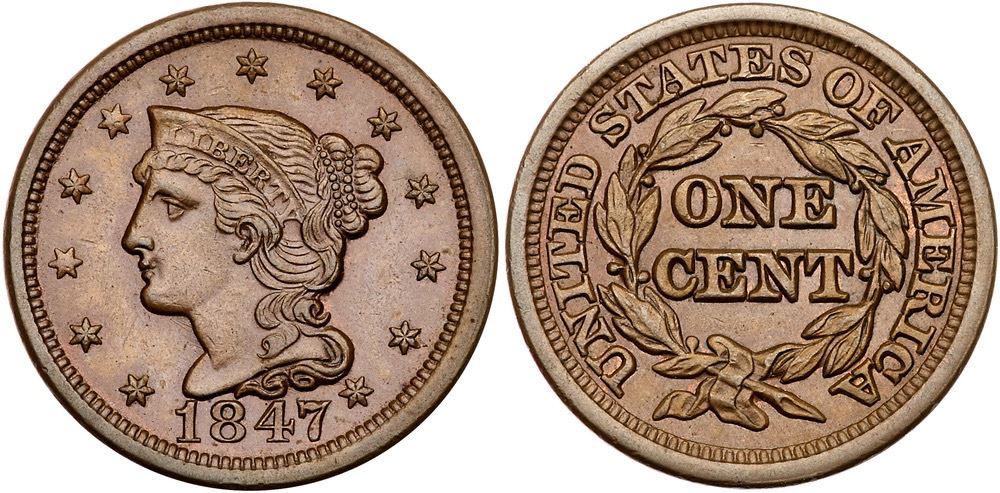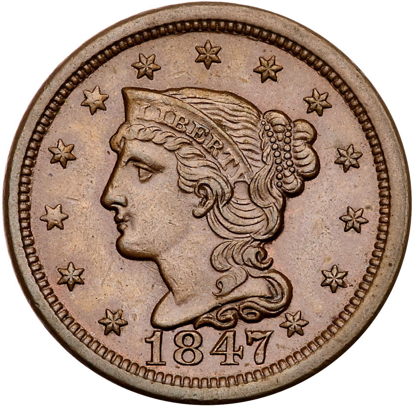 1847 N-8 R3 AU55Frosty light brown with peeps of faded mint red in a few places. Satiny and choice with just a hint of friction on the highpoints. Nicely struck E-MDS, die state b, with a fine die crack at ME.Pedigree: Ex Jules Reiver 5/1982-Fred H. Borcherdt Collection
