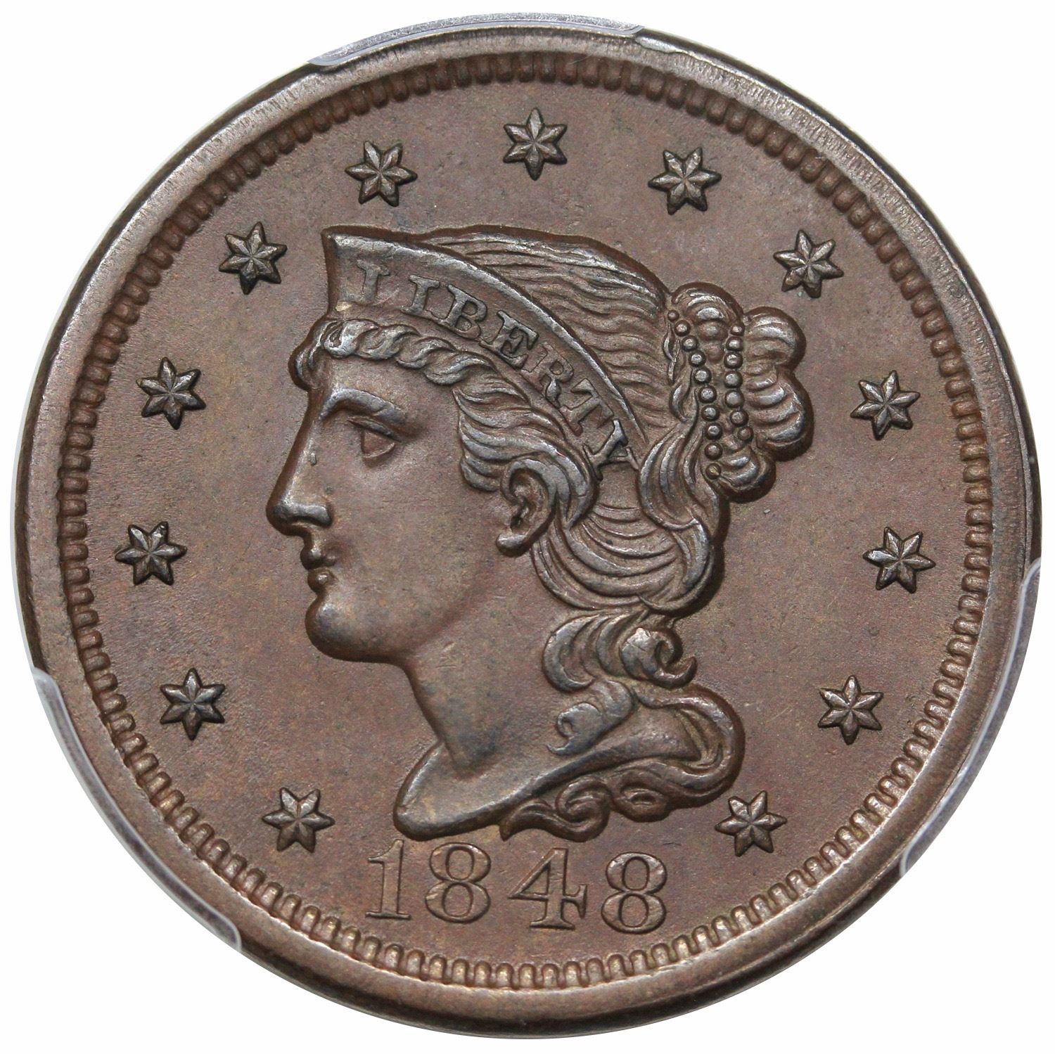 1848 Braided Hair Large Cent, N-29, R3, PCGS MS62BN CAC.