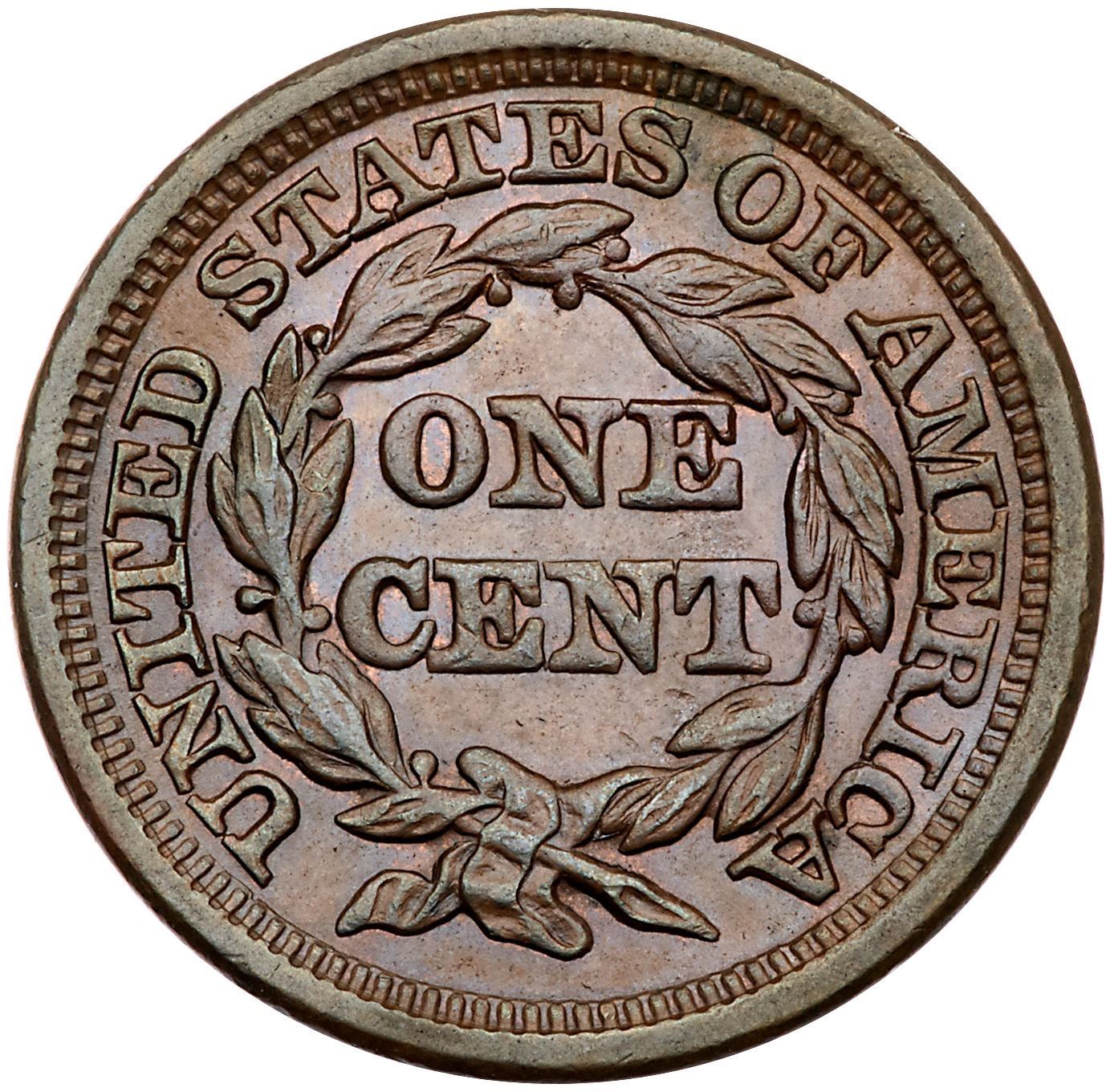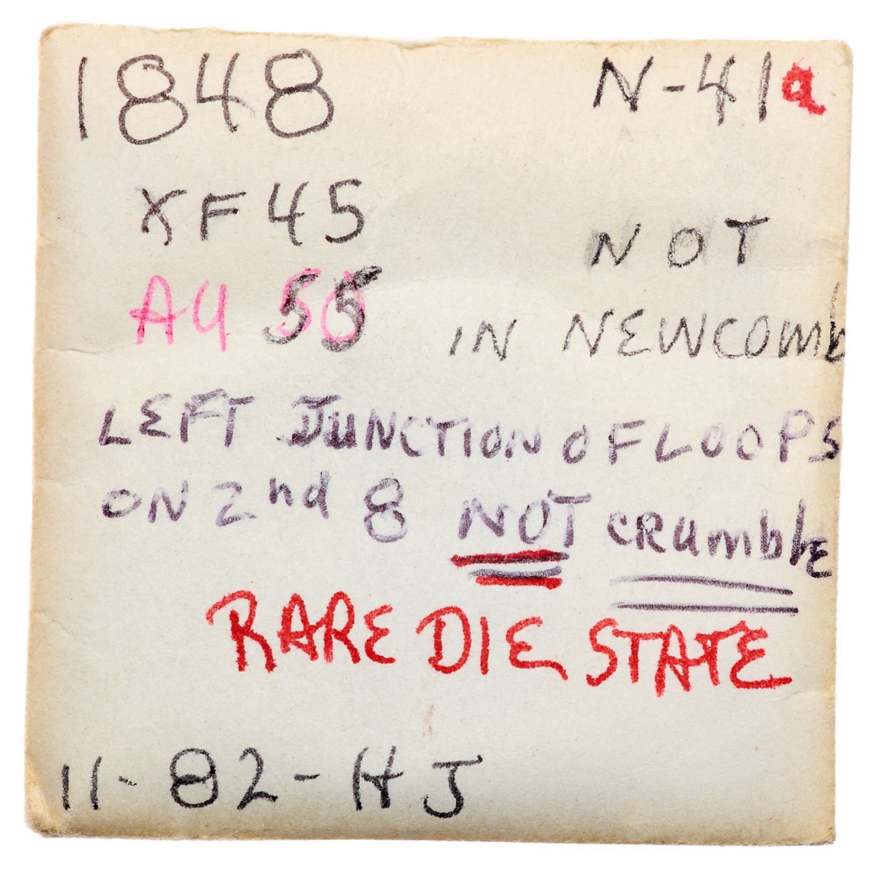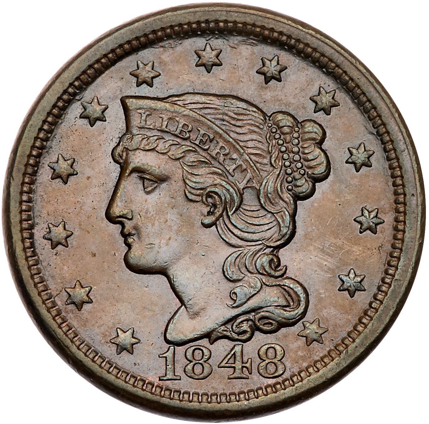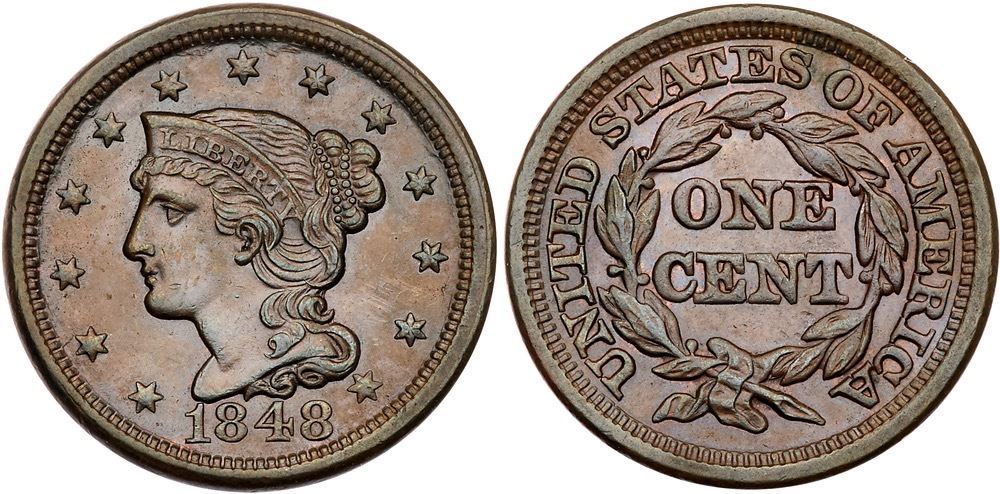 1848 N-41 R1 AU58Very attractive lustrous light chocolate brown with lighter brown in the fields and protected areas and a few faint peeps of faded mint red on the reverse. Looks mint state with great eye appeal, but there is a trace of rub on the highest points of the devices. A tiny tick on the chin and another just right of the nostril are the notable marks. Scarce EDS, die state a, without crumbling on the left side of the second 8.Pedigree: Ex Hance Jaquett 11/1982-Fred H. Borcherdt Collection