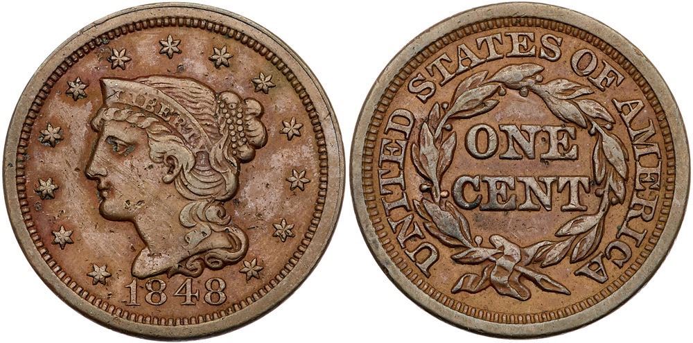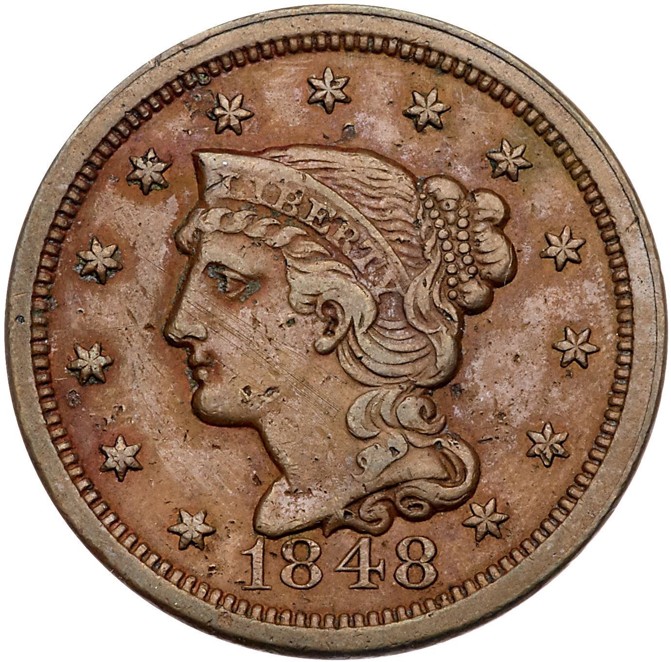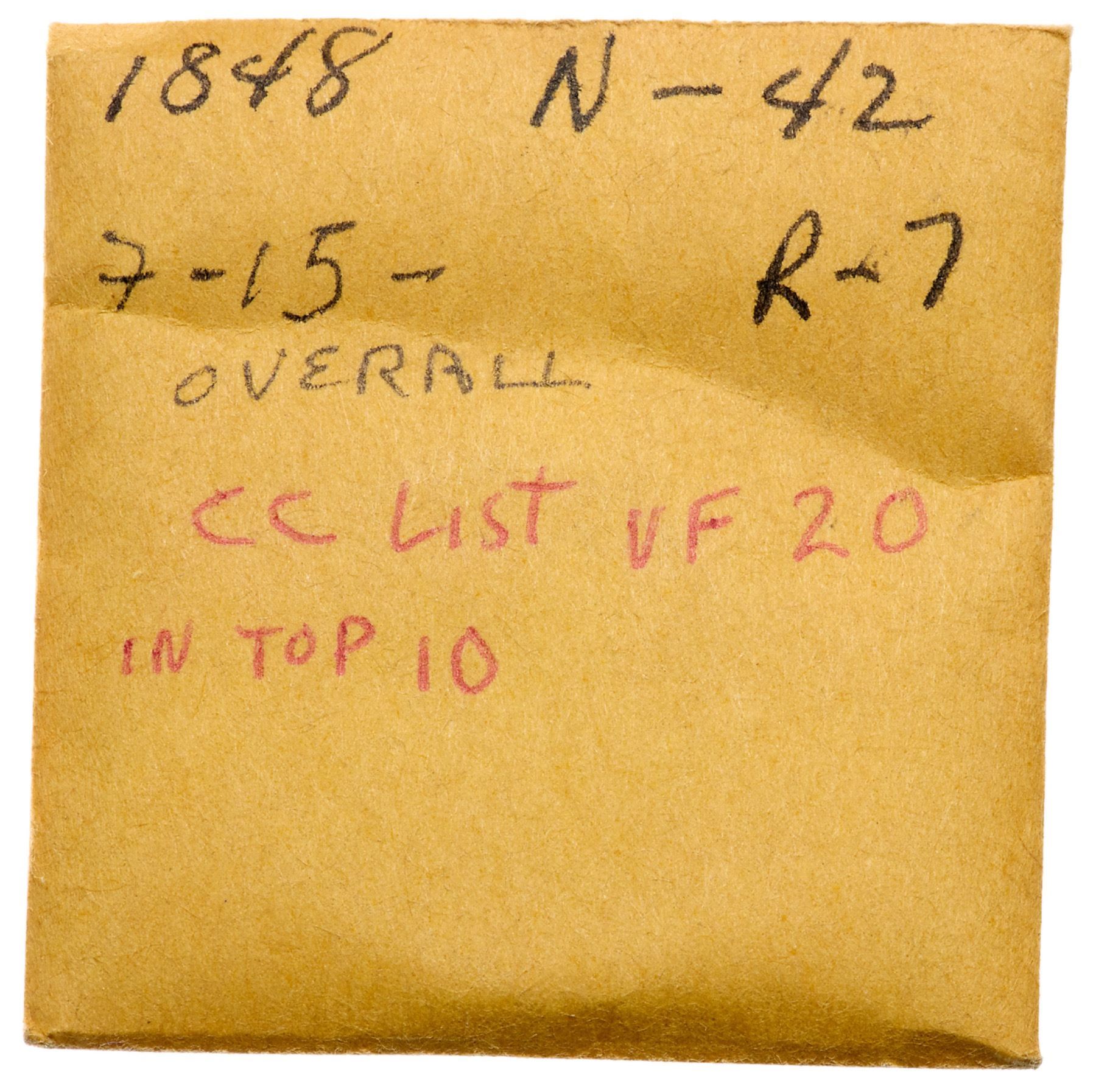 1848 N-42 R5+ F12+Sharpness near EF40 but there are fine scratches on the cheek and neck plus numerous small contact marks, mostly on the obverse. The surfaces are smooth but there are traces of verdigris in protected areas on the obverse. Glossy steel brown and light reddish chocolate. EDS.Pedigree: From the Fred H. Borcherdt Collection