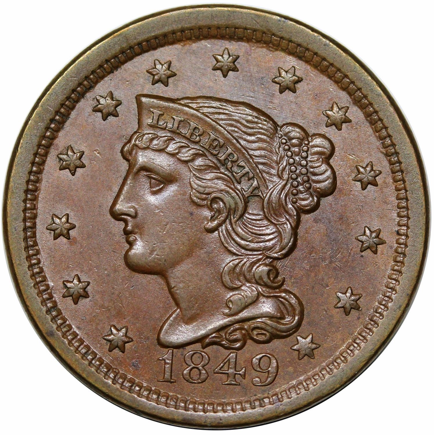 1849 Braided Hair Large Cent, N-2, R2, AU58.