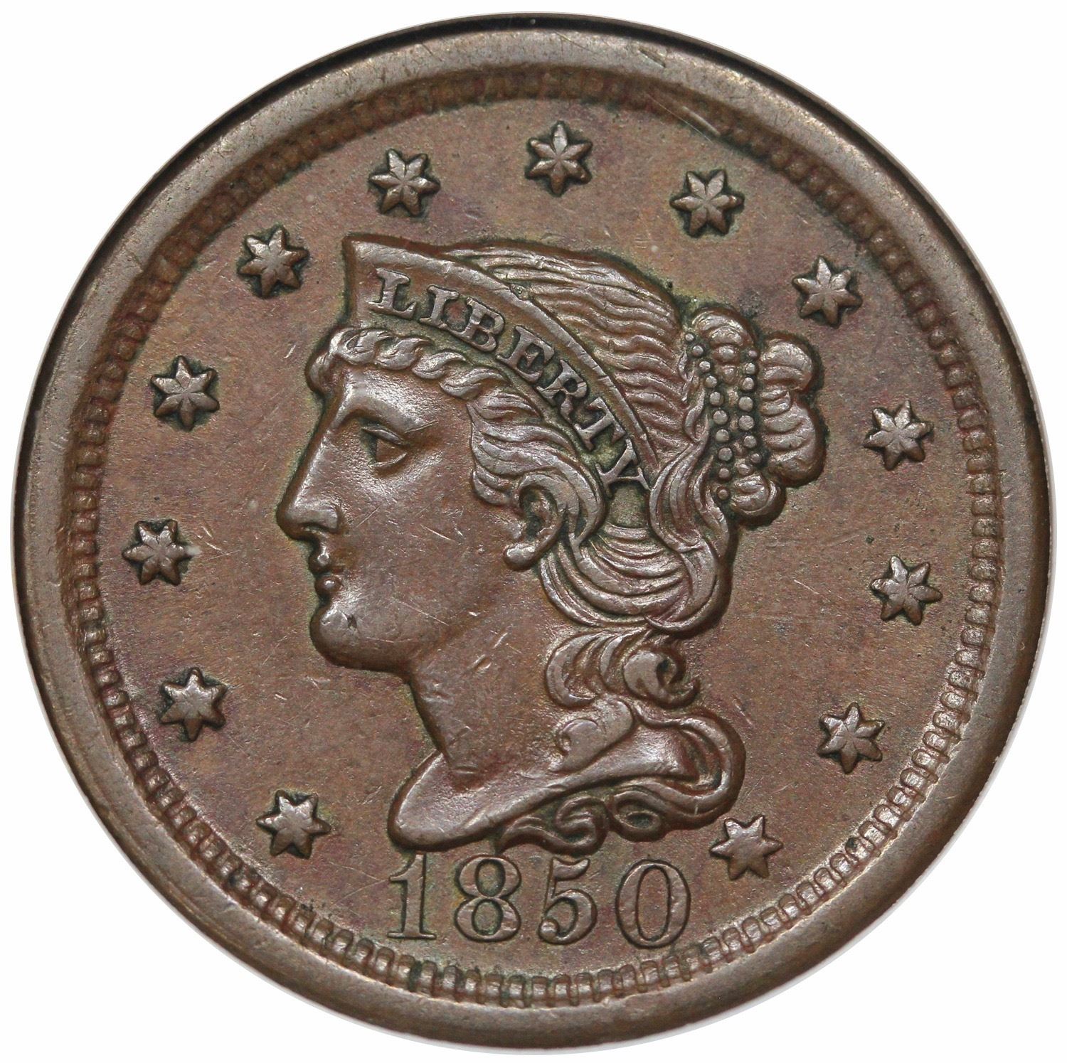 1850 Braided Hair Large Cent, N-1, R2, NGC AU58, ex Reiver.