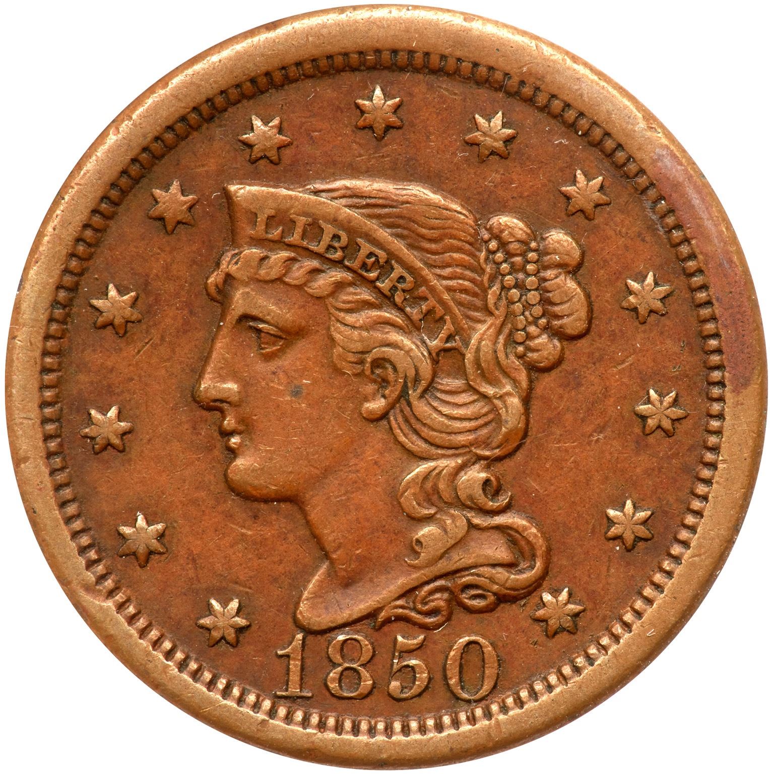 Glossy reddish chocolate brown with lighter brown toning on the devices. A small planchet chip on the rim at star 2 is the only notable mark. MDS, die state b. The earlier points down from the left base of the N in ONE are gone. Our grade is VF30.