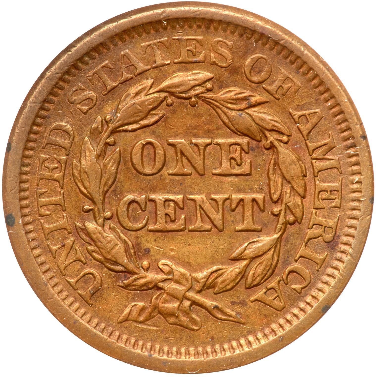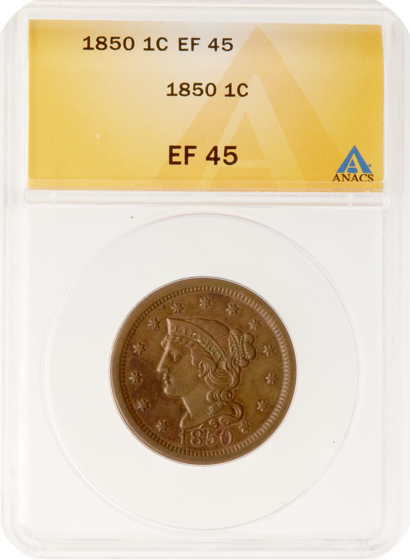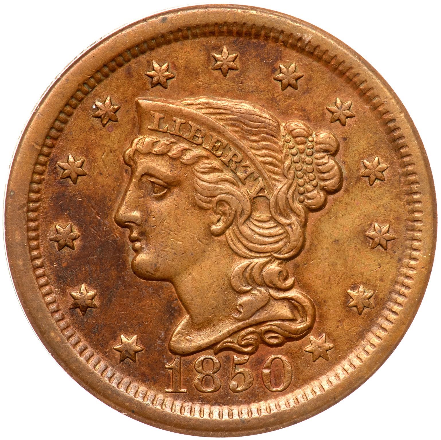 Frosty golden tan and light brown with darker chocolate brown toning covering the field before the neck and face. A small spot of fine carbon on the rim at IT in UNITED is the only notable defect. LDS, die state c. The diagonal lump on the bust is visible but the earlier die lines and points are gone. Our grade is VF35.